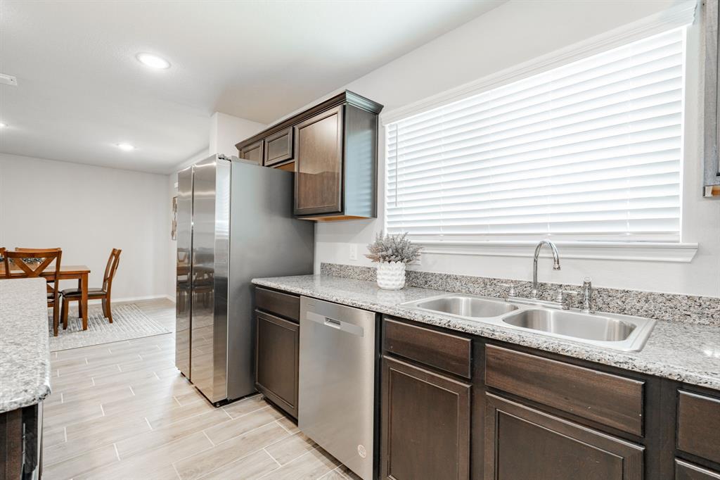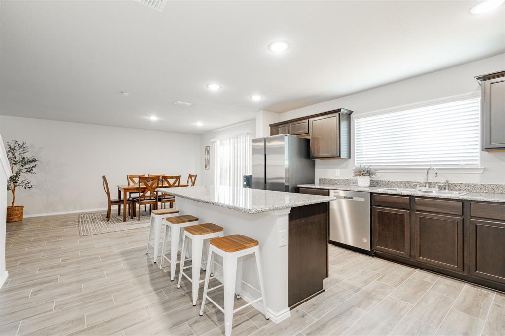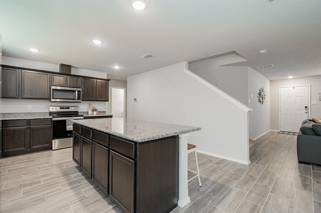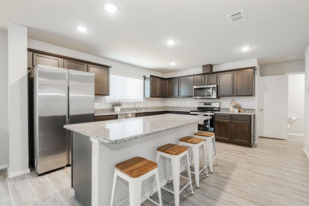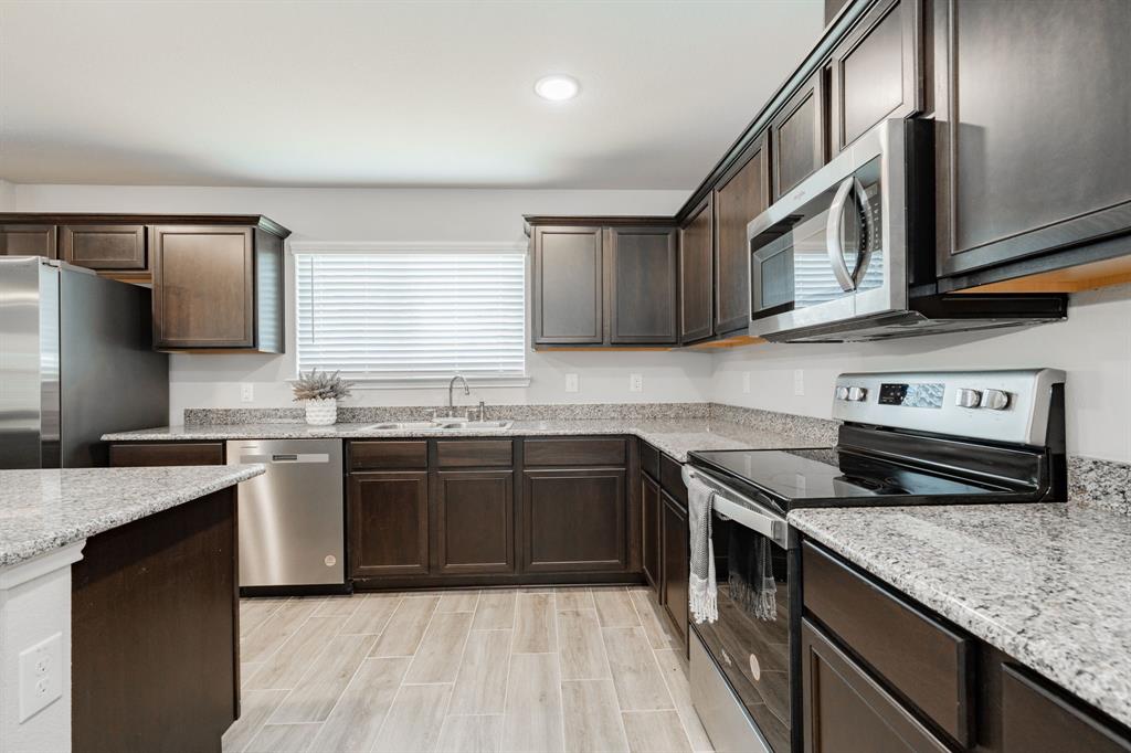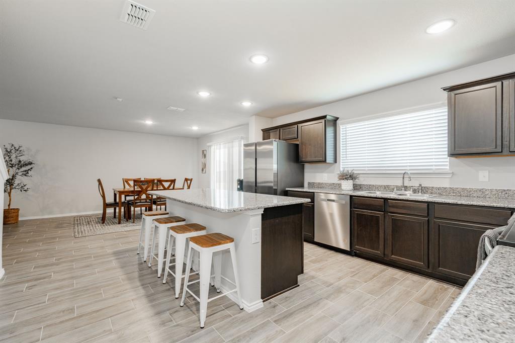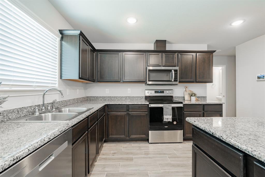 Enjoy both a covered front porch and a covered back patio, perfect for relaxing or entertaining. The backyard offers excellent privacy with its beautiful wood fence. Inside, the expansive kitchen features an oversized granite island with seating, ample counter space, and generous storage.