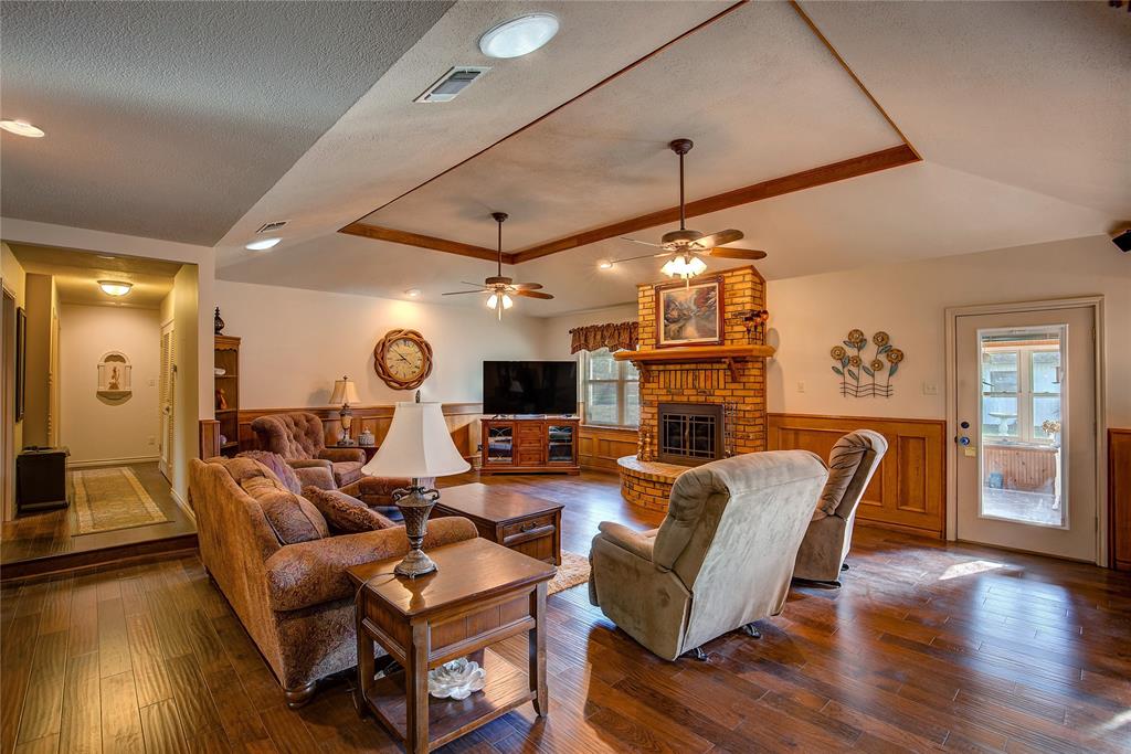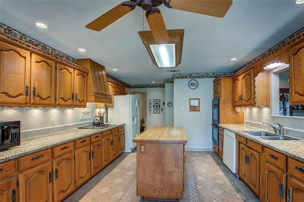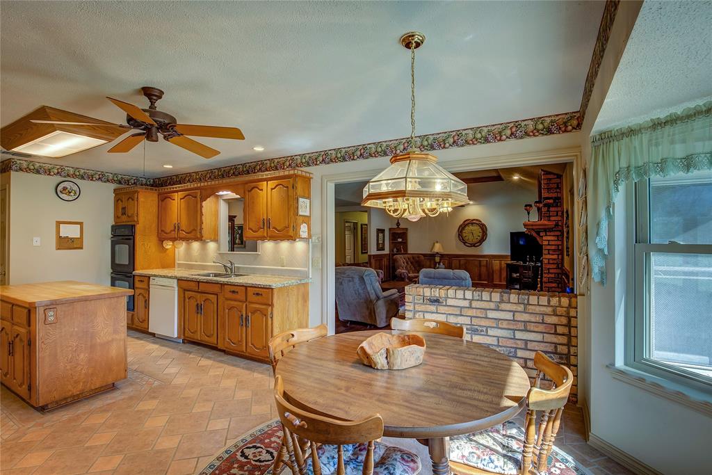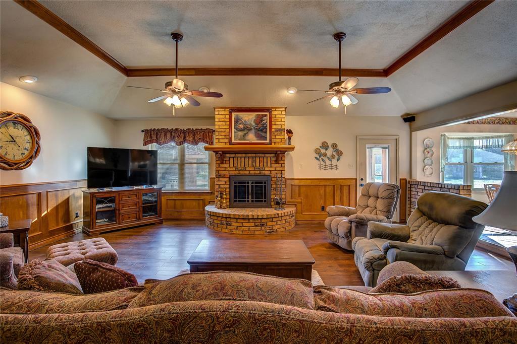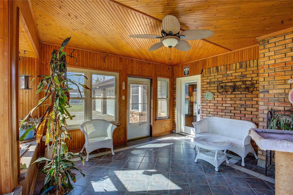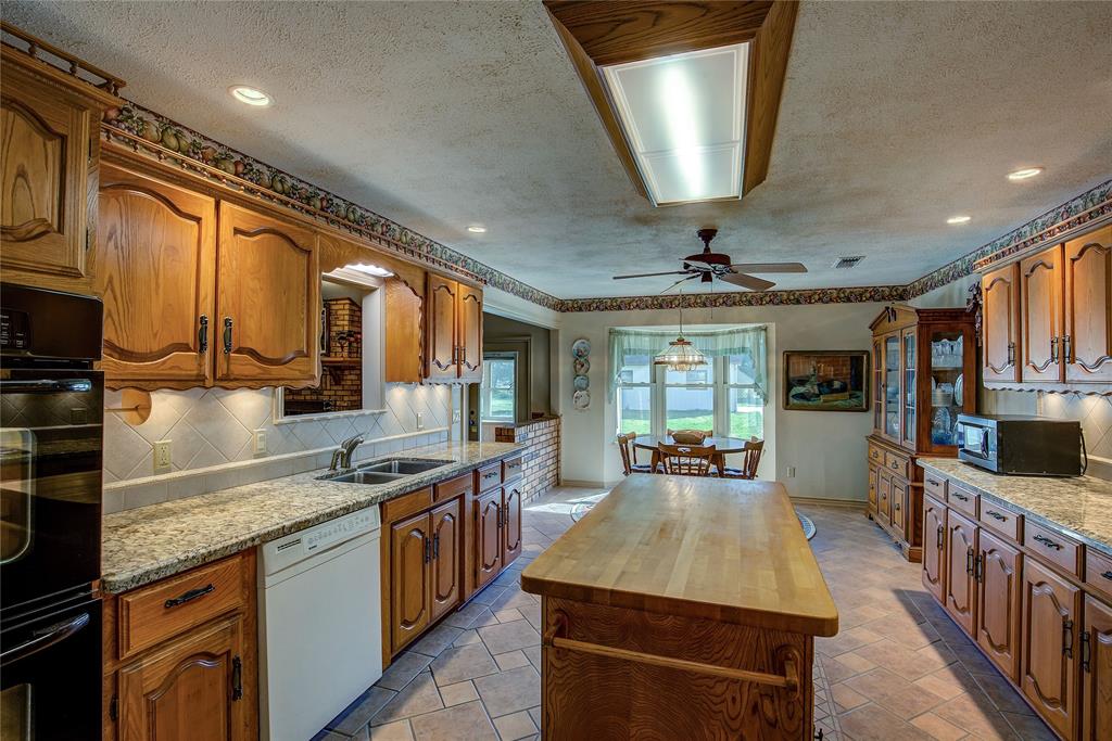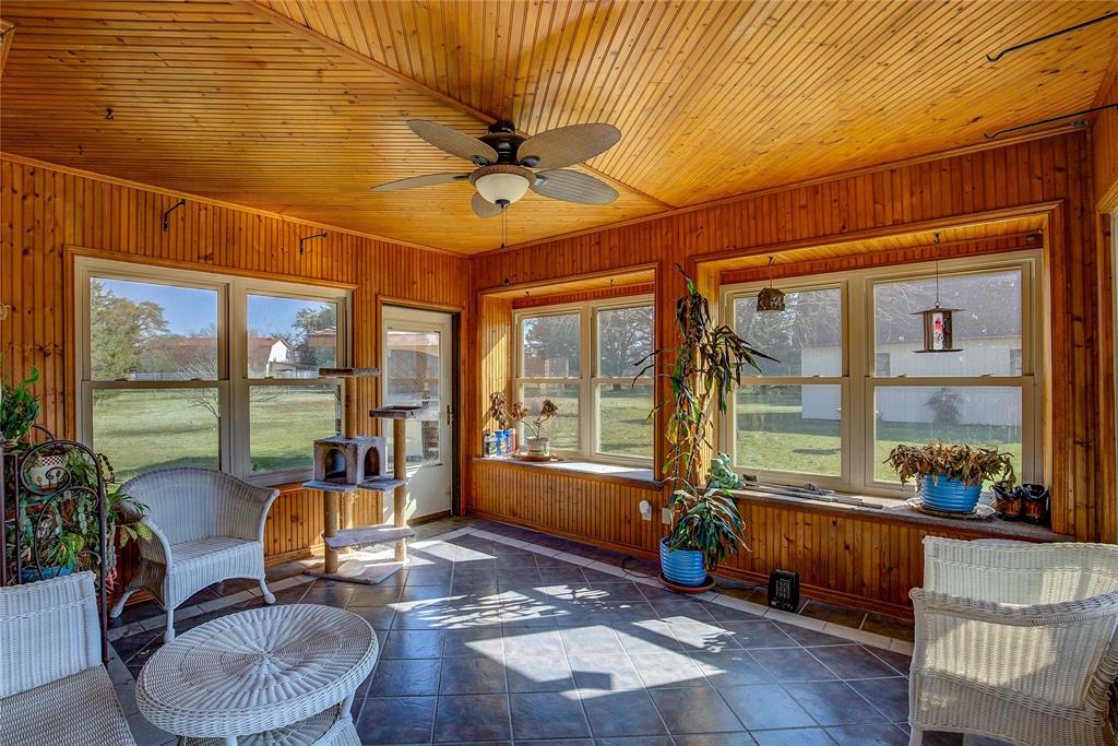 The inviting living room features a brick fireplace, perfect for cozy evenings, while the expansive kitchen boasts granite countertops, an island, double ovens, and plenty of built-ins for storage. A bright enclosed sunroom fills the home with natural light, offering a peaceful retreat year-round.