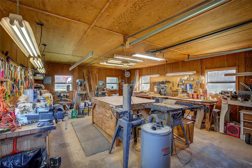Designed for convenience and durability, this home features wood and ceramic tile flooring throughout. No carpet! Outdoors, you'll find a two-story workshop with electricity, a separate storage shed, and abundant parking options.