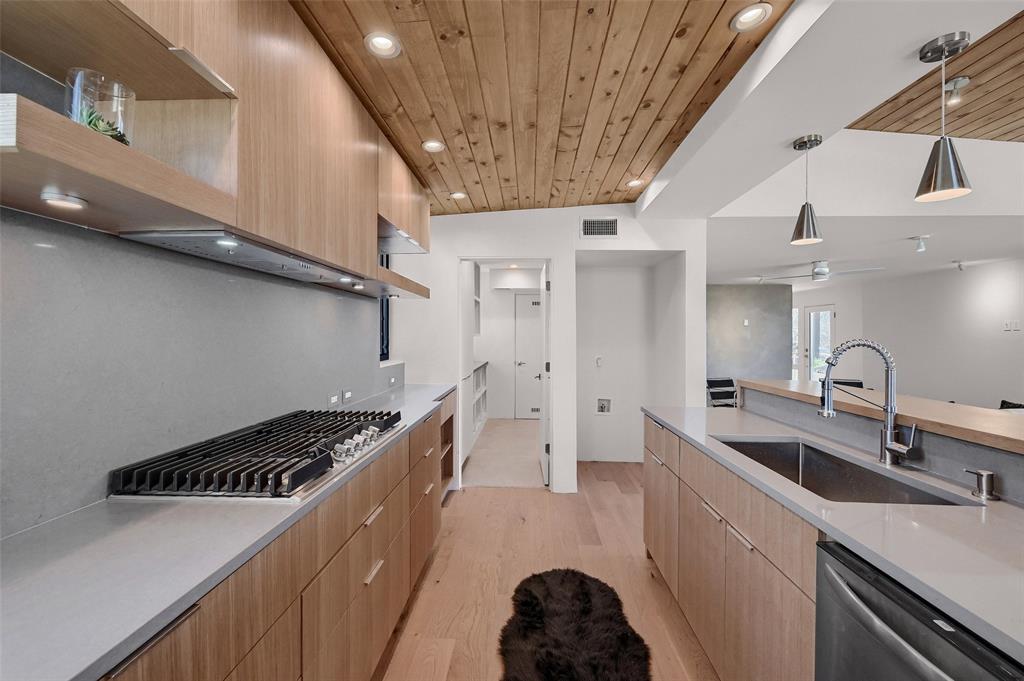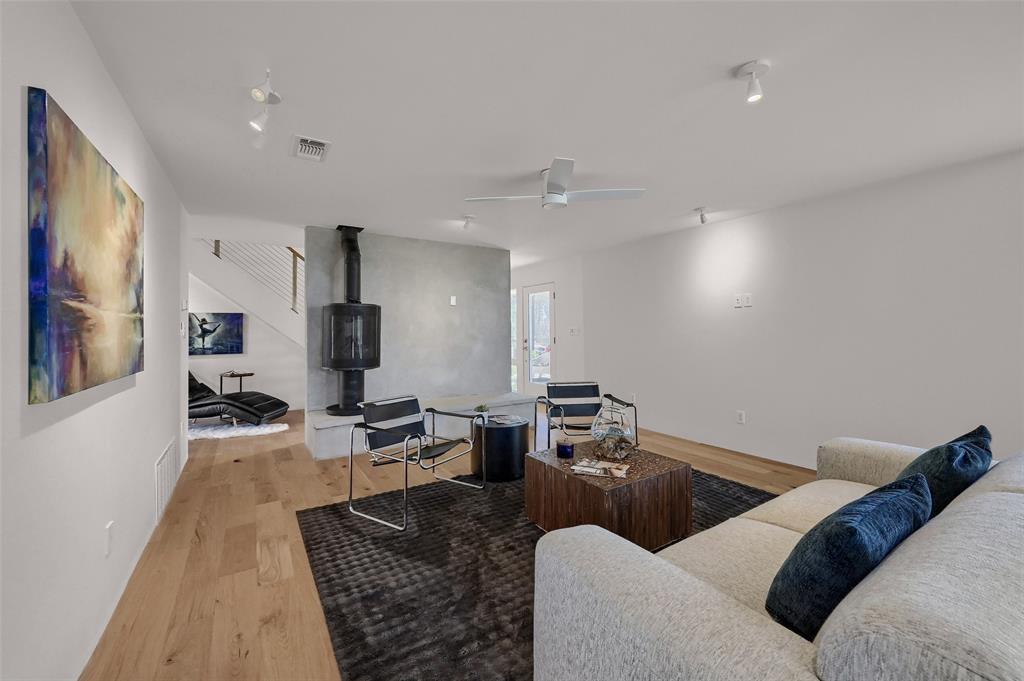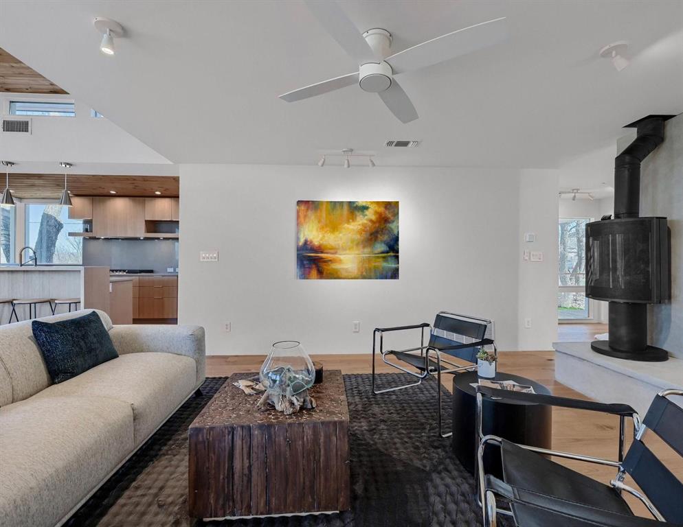 Inside, the thoughtfully designed open floor plan features spacious bedrooms, each with a private ensuite bathroom, ensuring comfort and privacy for every member of the household. Exquisite design elements abound, including wood-paneled ceilings, sleek trimless level-5 walls, floating stairs, wrap-around decks, and contemporary cable railings. A striking Scandinavian natural gas fireplace serves as a warm and inviting centerpiece, while the modern kitchen boasts high-end appliances and stylish finishes to delight any chef.