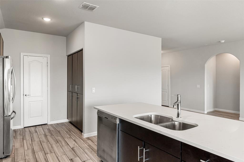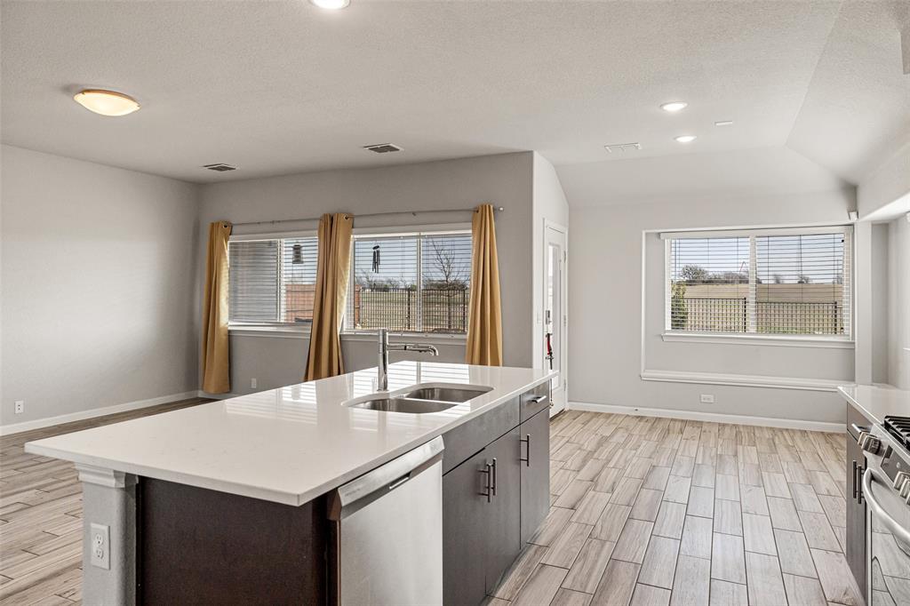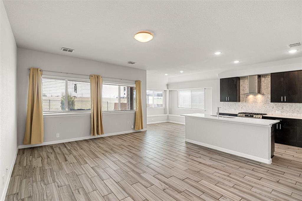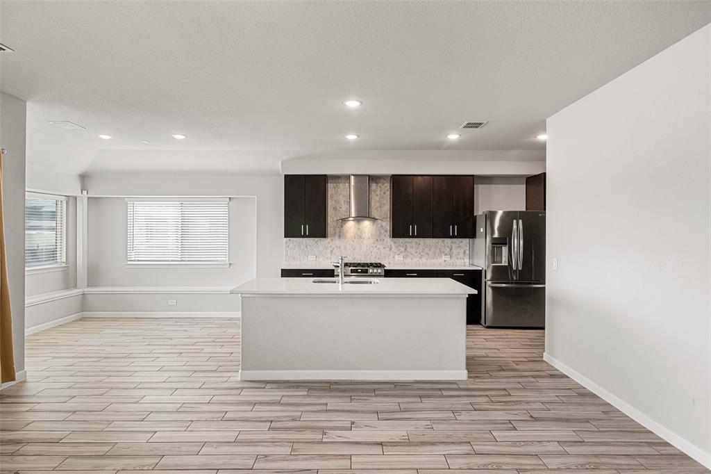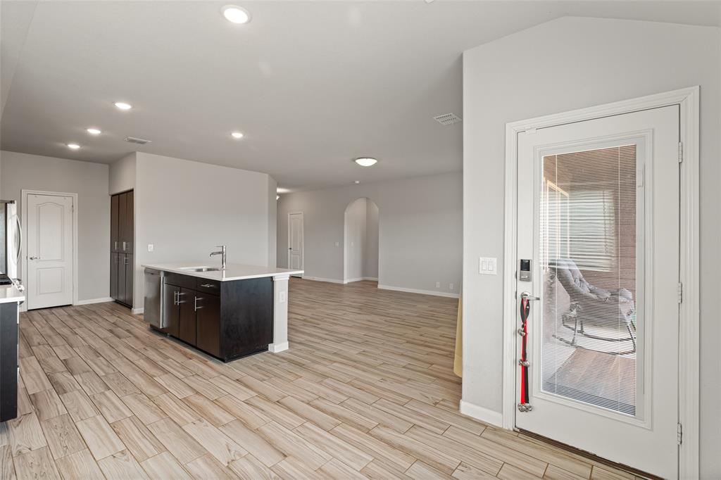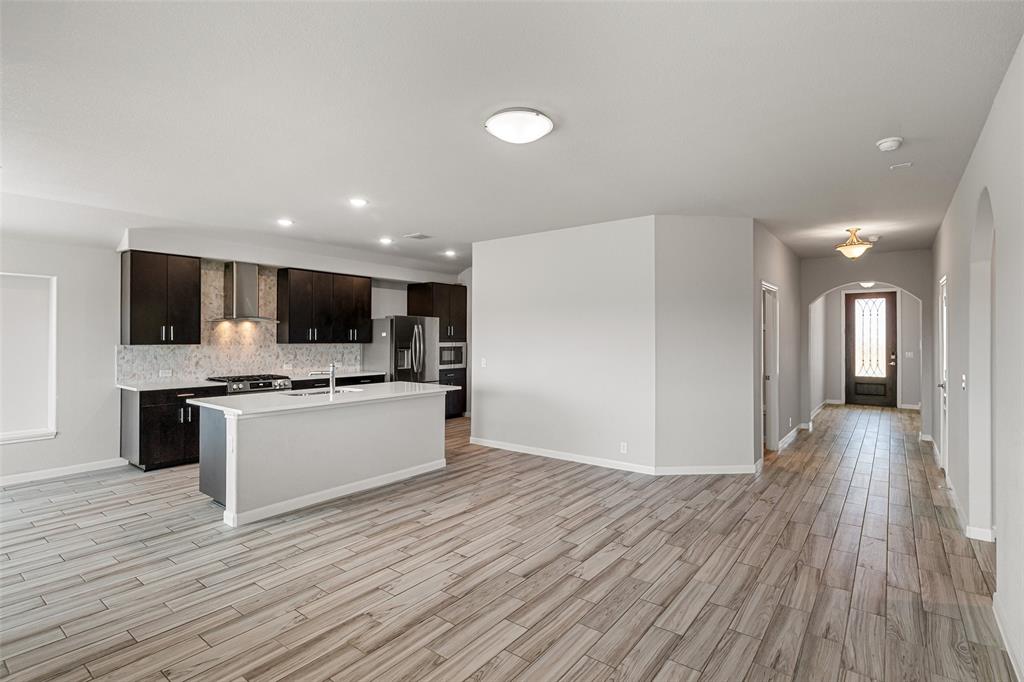 Step into an inviting open concept living space, where wide arched doorways and plentiful windows allow natural light to flow throughout. The wood-look tile flooring in common areas offers the beauty of real wood with minimal maintenance. The modern kitchen is a cook's dream, complete with stainless steel appliances, expansive cabinetry, luxurious granite countertops, and a large island with a breakfast bar. A spacious walk-in pantry provides ample storage, while the L-shaped built-in window seat in the breakfast nook creates a cozy dining area with a view. Plus, enjoy easy access to the patio, perfect for morning coffee or evening relaxation.
