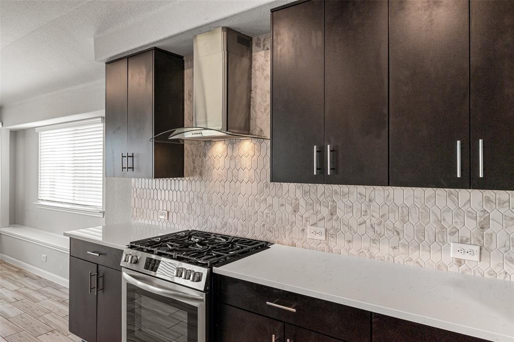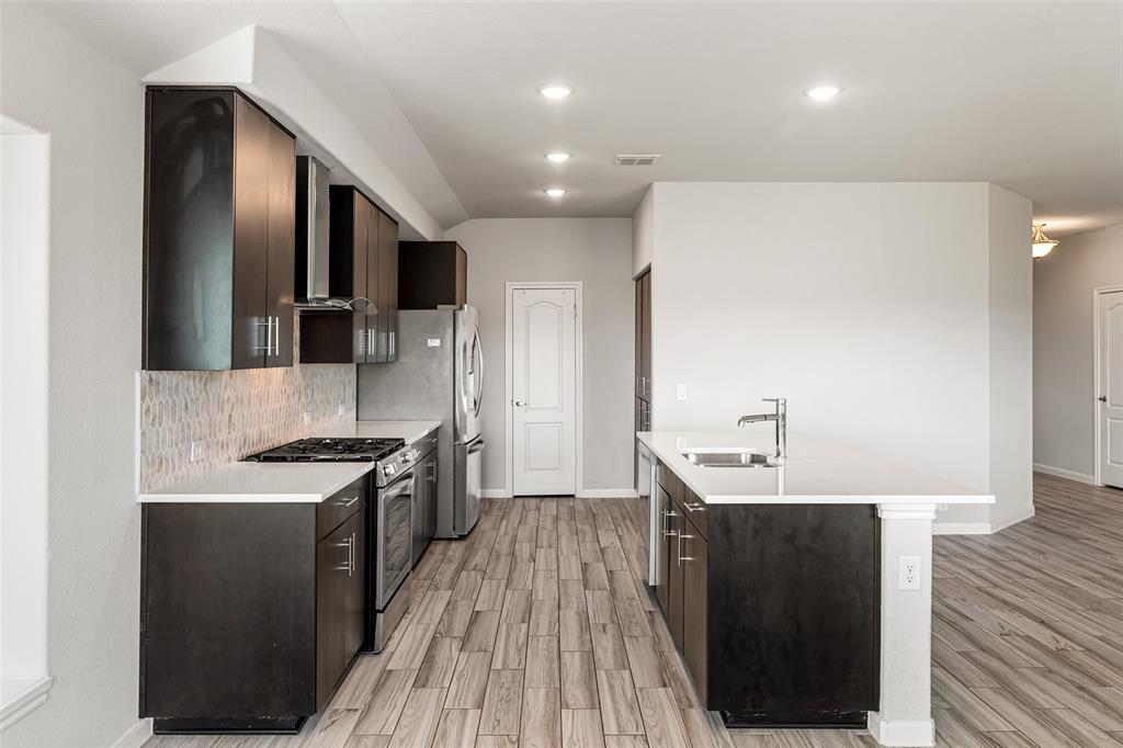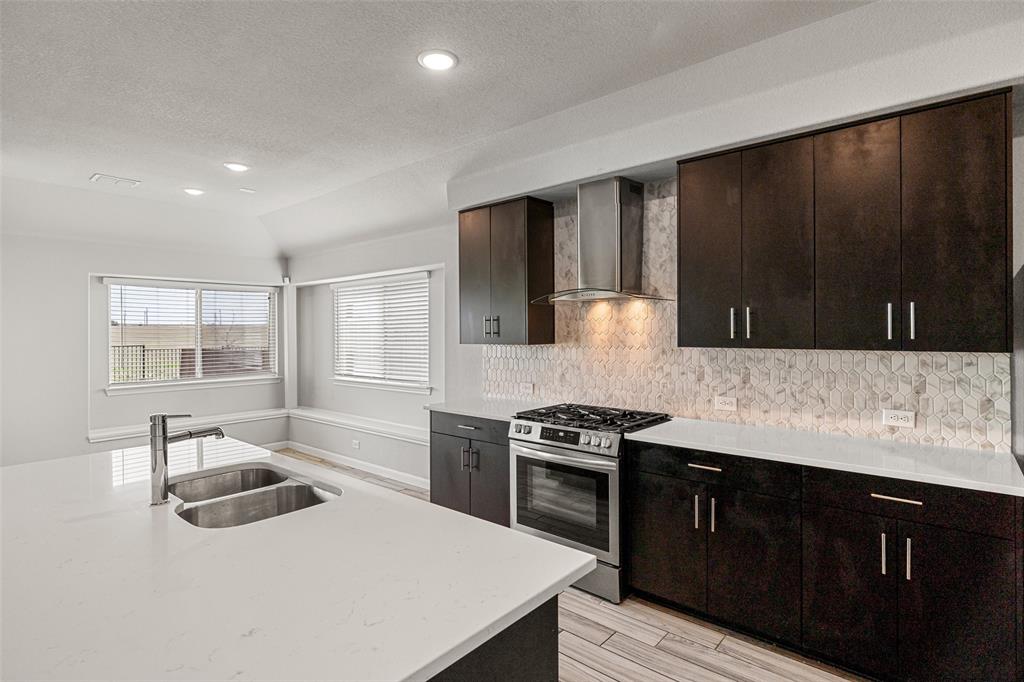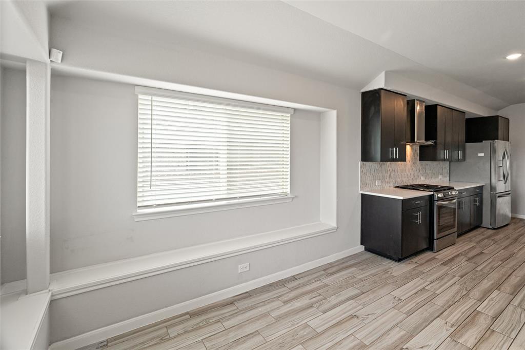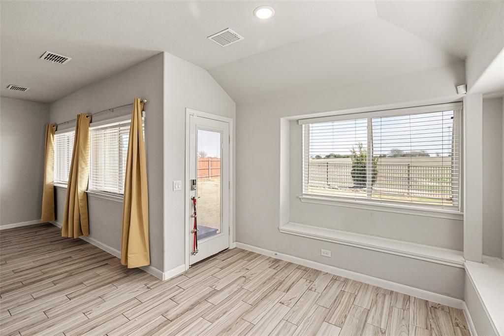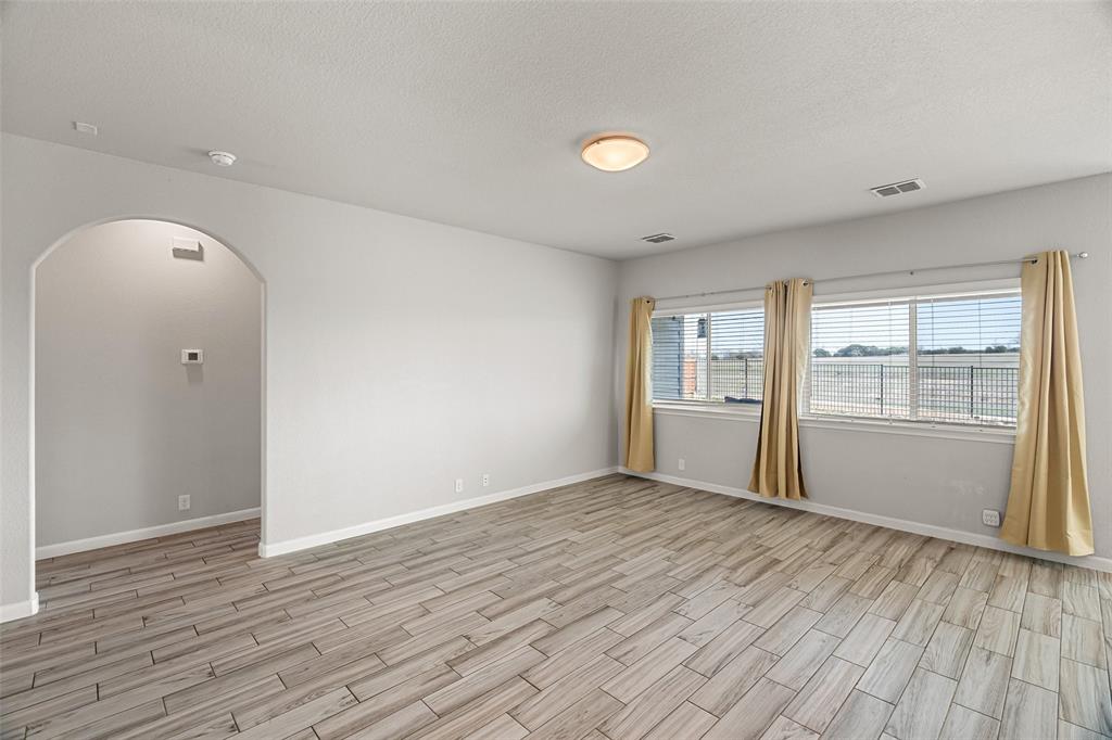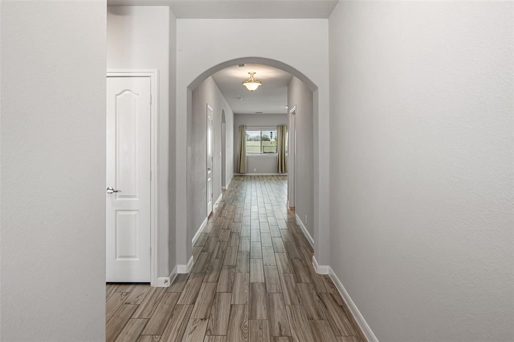 Step into an inviting open concept living space, where wide arched doorways and plentiful windows allow natural light to flow throughout. The wood-look tile flooring in common areas offers the beauty of real wood with minimal maintenance. The modern kitchen is a cook's dream, complete with stainless steel appliances, expansive cabinetry, luxurious granite countertops, and a large island with a breakfast bar. A spacious walk-in pantry provides ample storage, while the L-shaped built-in window seat in the breakfast nook creates a cozy dining area with a view. Plus, enjoy easy access to the patio, perfect for morning coffee or evening relaxation.