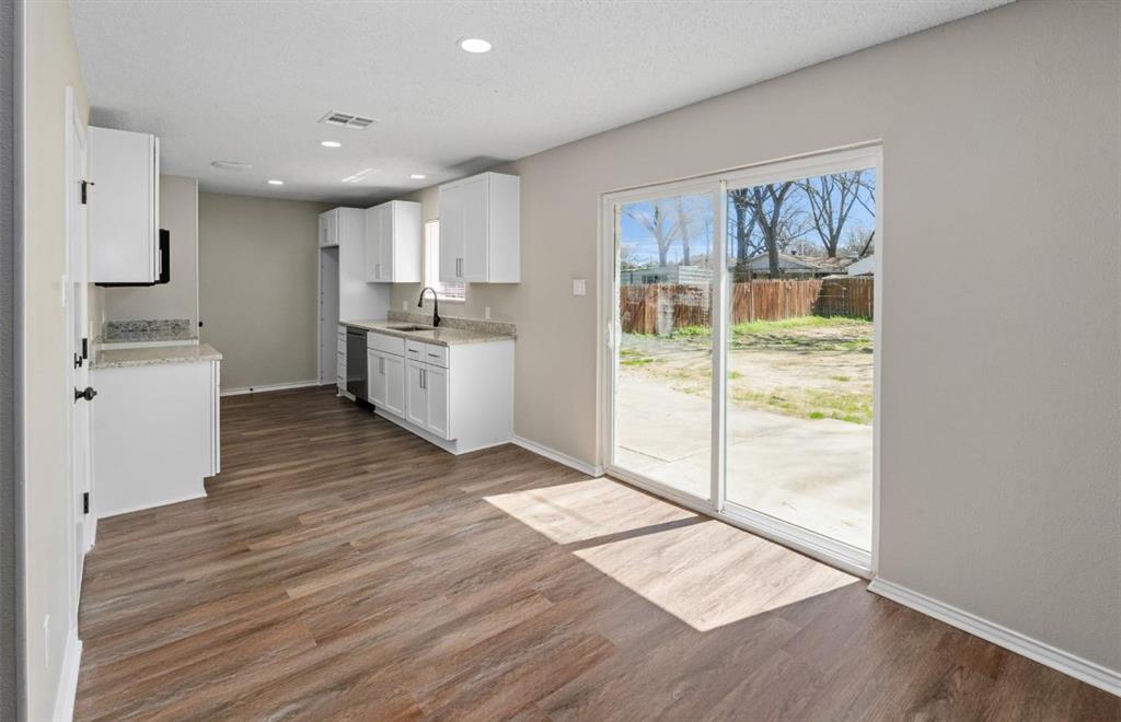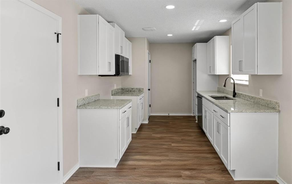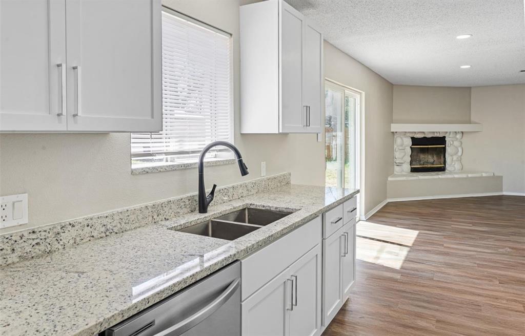 The kitchen has been completely remodeled with brand-new cabinetry, granite countertops, and updated faucets.