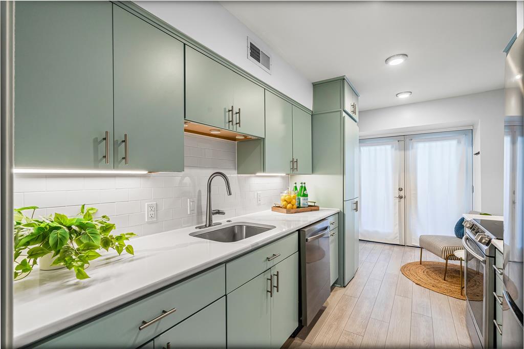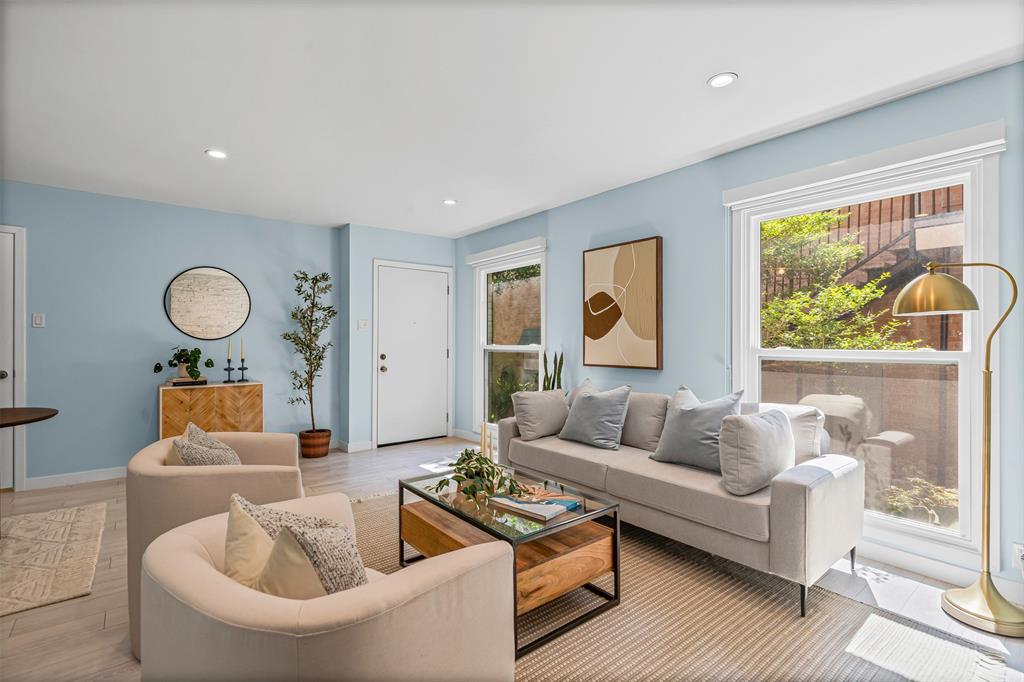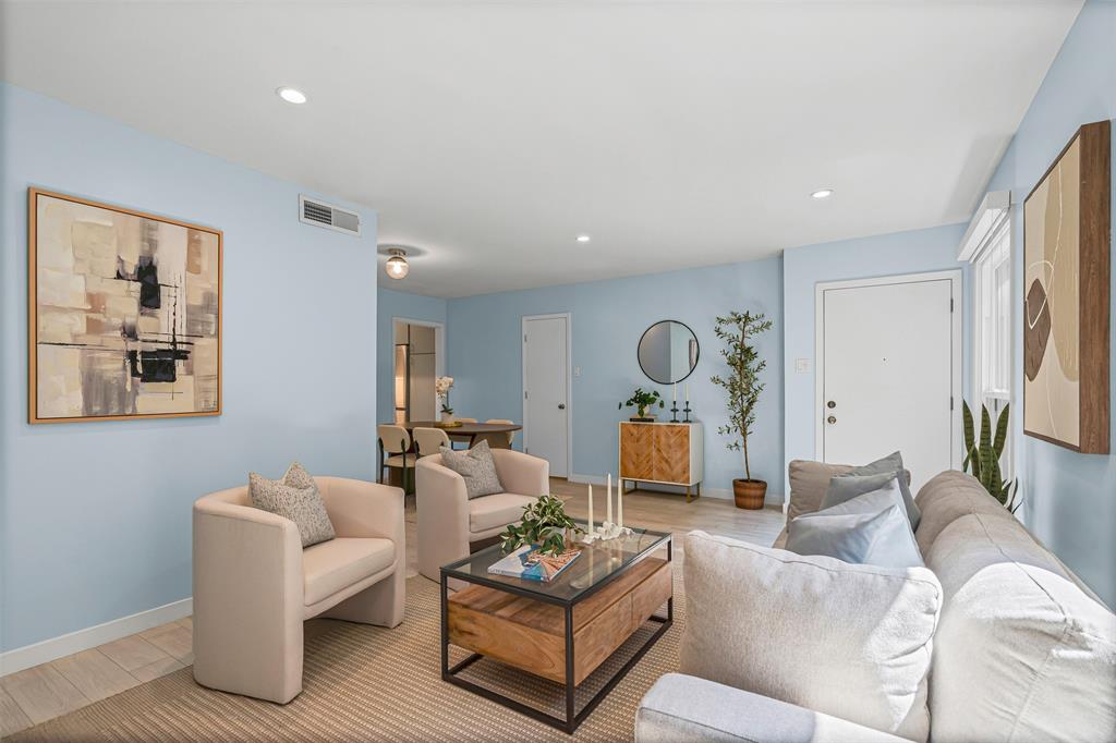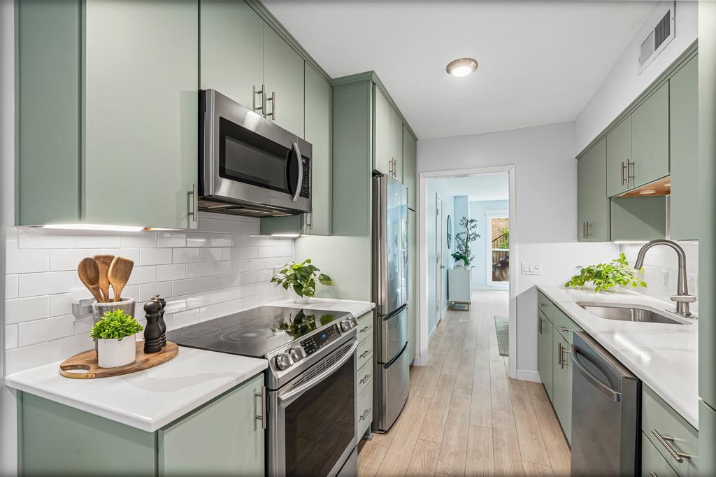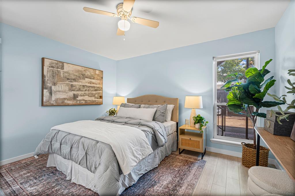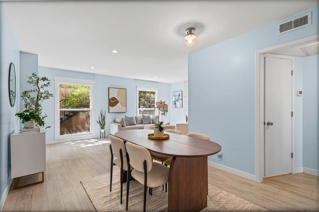 Other upgrades include new windows and French doors, recessed lighting, custom window treatments, and stylish laminate wood flooring. The bathroom boasts handcrafted tile with an inset mirror and a stacked LG washer and dryer adds convenience.