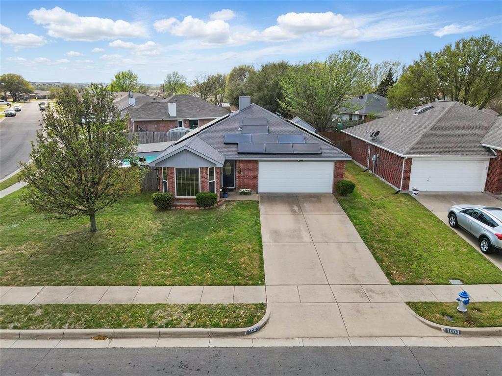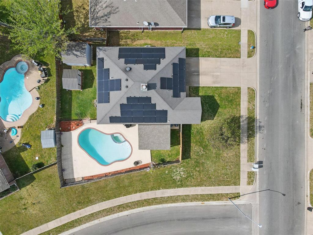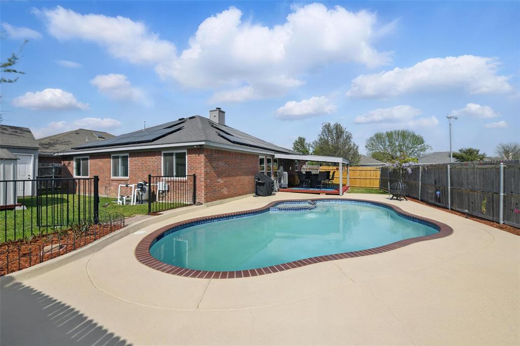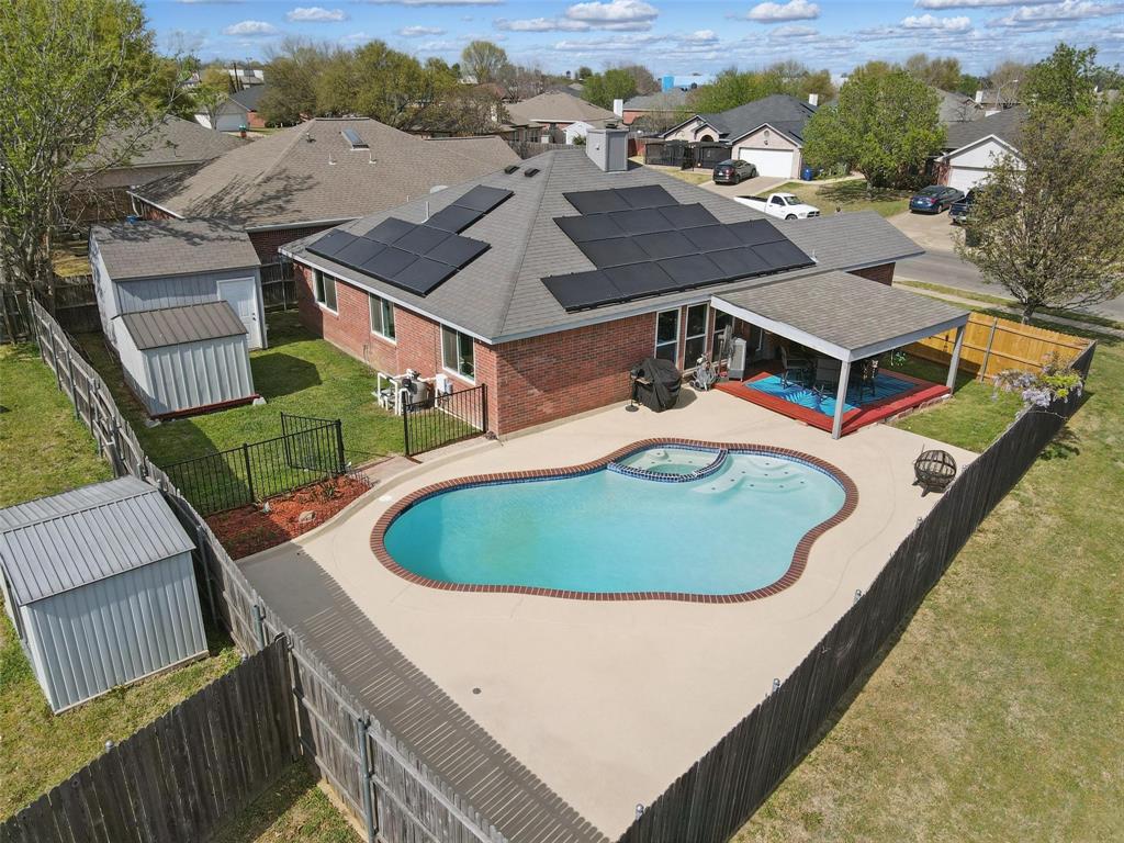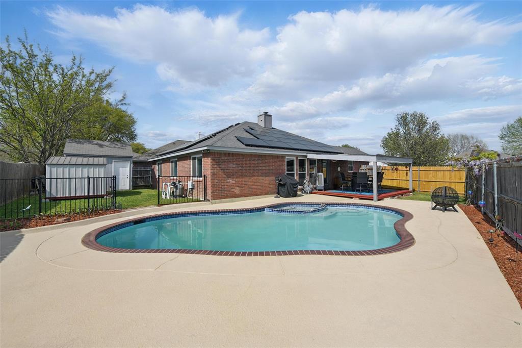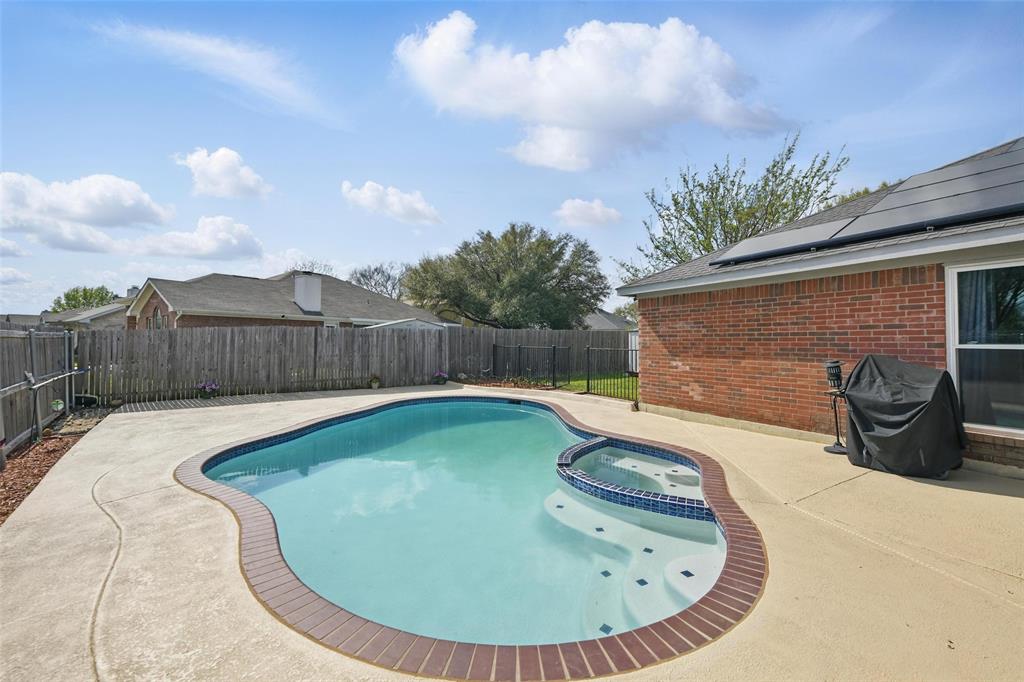 Solar panels will be paid off at closing for new buyer to reap the benefits of lower electricity costs! Discover your dream home in Burleson, Texas! This stunning residence boasts a sparkling pool and has been recently remodeled with a multitude of upgrades. With 3 bedrooms,an office that could be a bedroom, this home perfectly blends comfort and functionality. Newly painted throughout the entire home, new light fixtures & ceiling fans throughout the house, new bathtub and tile walls in hallway bathroom, all new energy efficient windows, new garage door! Kitchen features quartz countertops, eat in area with lots of light, built in microwave! Large Primary bedroom features ensuite bath & walk in closet! Hall bath has recently been remodeled and features same beautiful quartz countertops. Out back you will find a covered patio deck overlooking the pool ready for summer! Two storage buildings out back perfect to store all your yard tools! The solar panels will be paid off at closing for the new buyers so this makes it an INCREDIBLE opportunity to save money on electricity! Don't miss the opportunity to make this remarkable property your own!
