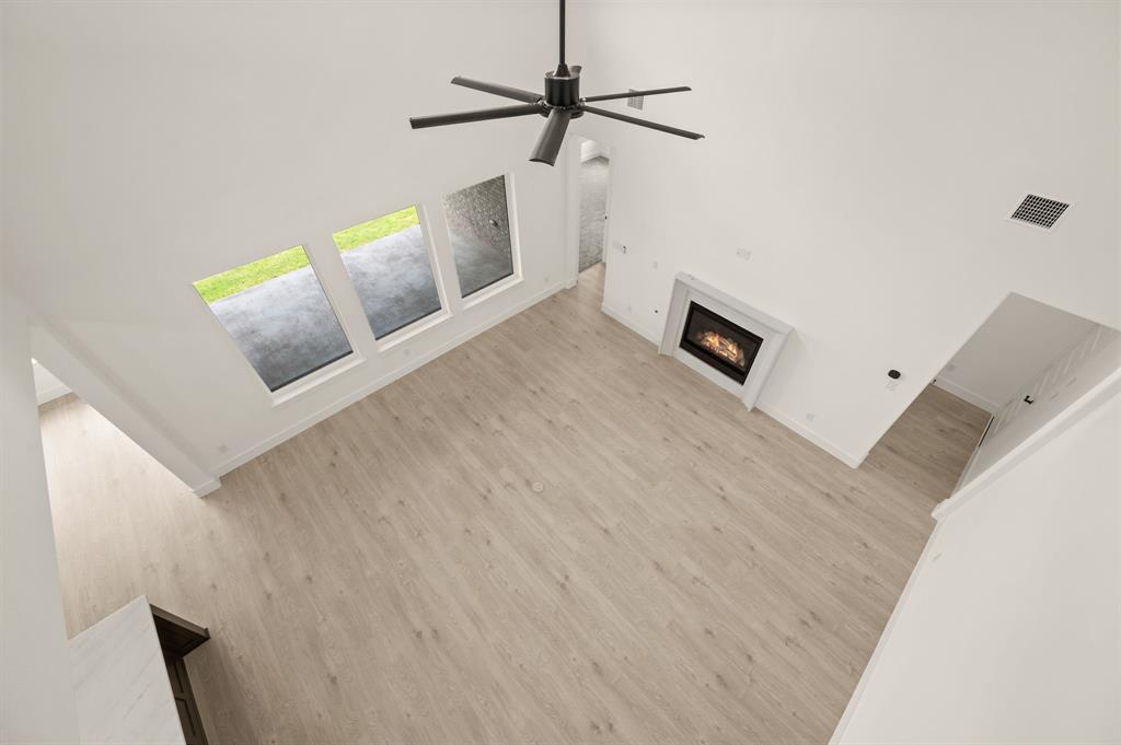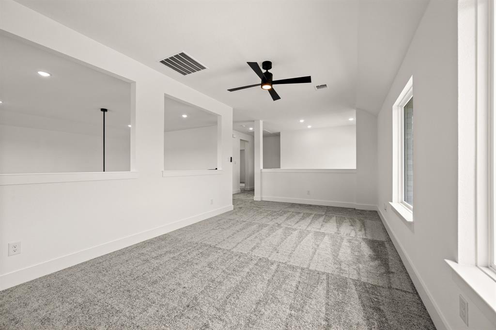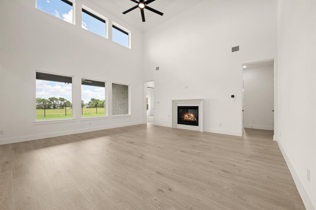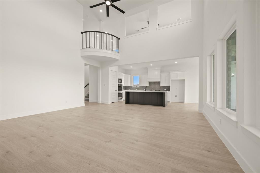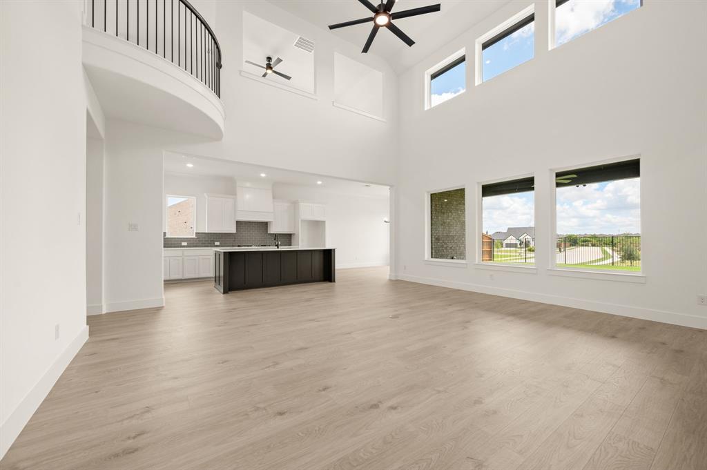 Stunning Living Spaces: A two-story family room creates an open and airy atmosphere, complemented by a Juliet balcony from the upstairs game room.