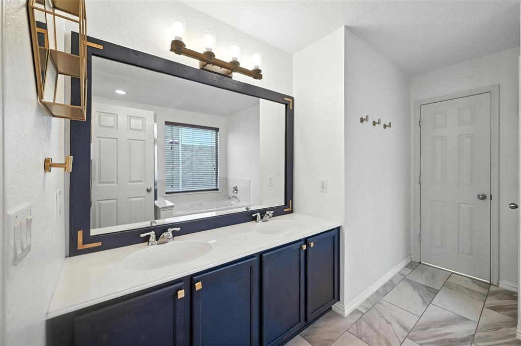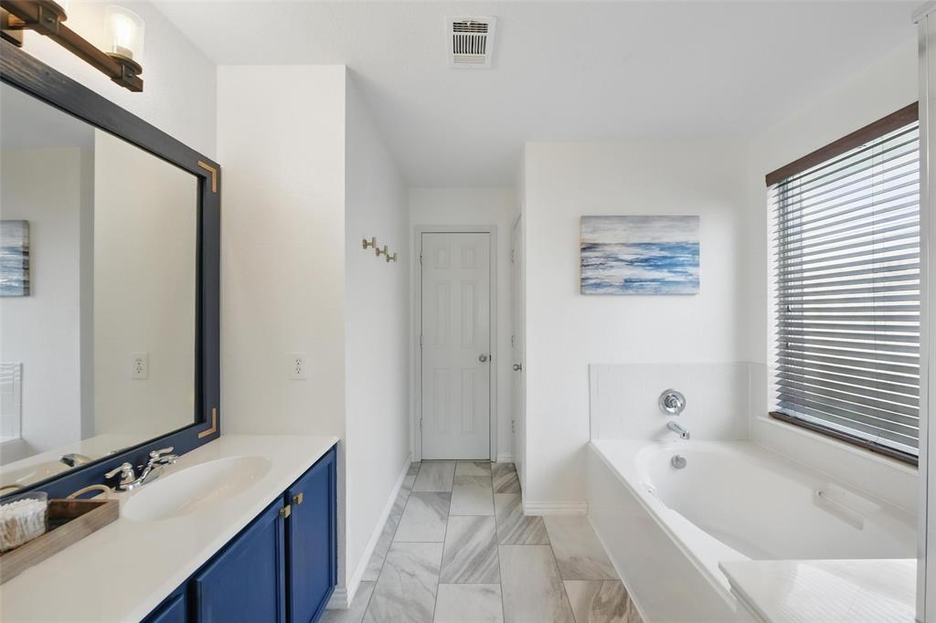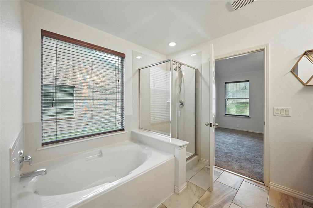 The primary suite, located on the main floor, offers a peaceful retreat with a spacious layout and a luxurious en suite bathroom. Enjoy dual sinks, a separate shower, a garden tub perfect for soaking, and a large walk-in closet that offers ample room for organization and comfort.
