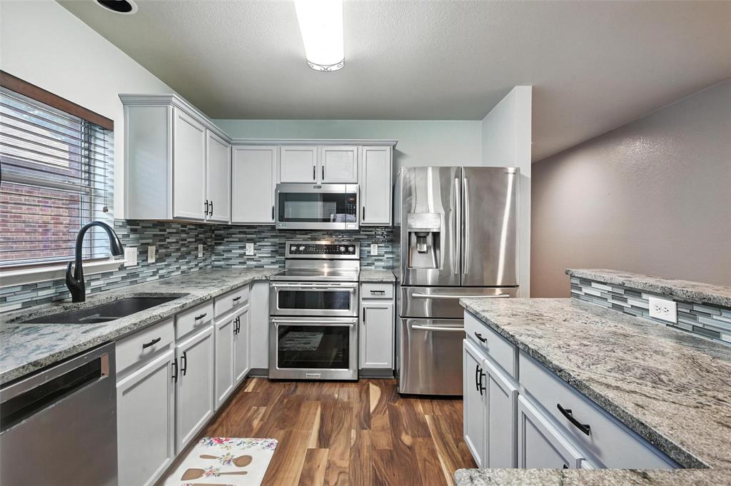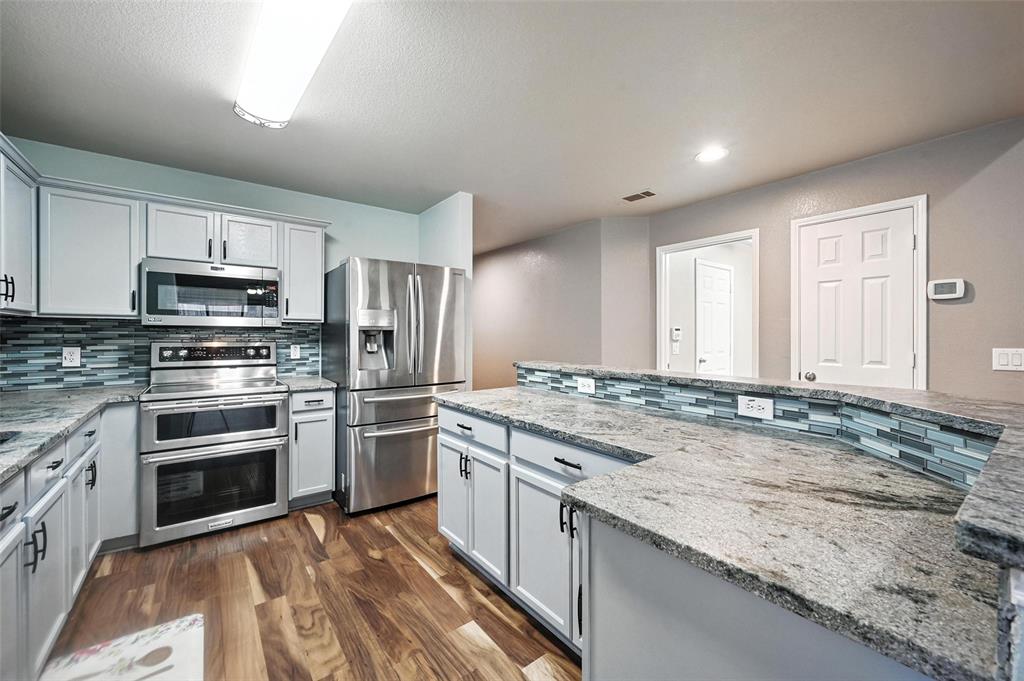 As you step inside, you'll immediately notice the upgraded flooring that extends across the entire first floor, creating a warm and cohesive flow. The chef-inspired kitchen is a standout feature, showcasing elegant leathered granite countertops, a modern backsplash, and abundant cabinetry that provides plenty of storage for all your cooking essentials. Whether you're preparing everyday meals or hosting gatherings, this kitchen is both functional and inviting.