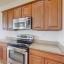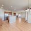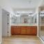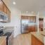 The kitchen features a high-top island with seating, granite countertops, under-cabinet lighting, a soap dispenser, pantry with roll-out shelves, and sleek stainless steel appliances, including a refrigerator.
