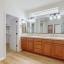 Retreat to the primary suite, complete with a walk-in closet, linen closet, and an en-suite bath featuring a large built-in shower seat and medicine cabinets. A guest bedroom with a bay window provides a cozy and inviting space for visitors.