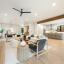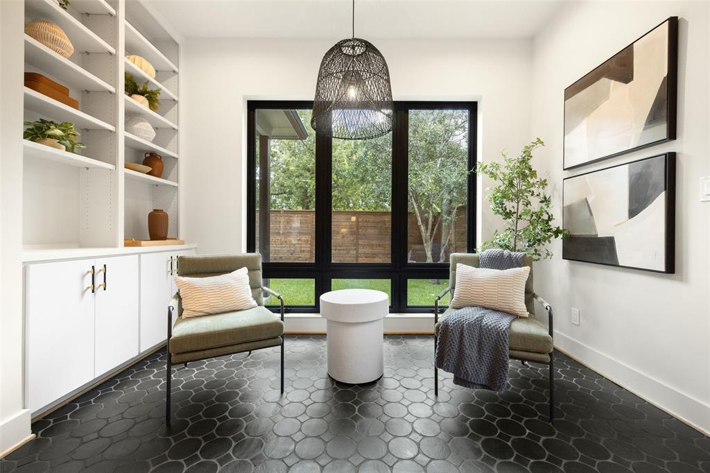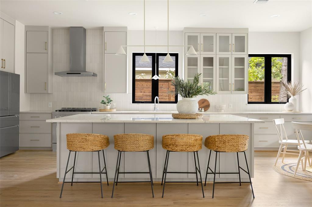 In addition, a dedicated guest room with spa-inspired private bath ensures comfort and privacy. The chef’s kitchen boasts a large island, breakfast nook, ample storage, and a walk-in pantry, while an adjacent mudroom with built-in storage keeps everything organized.