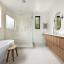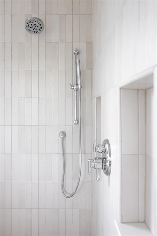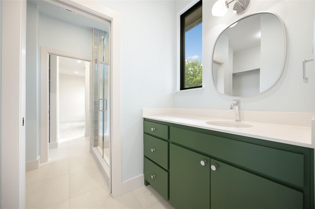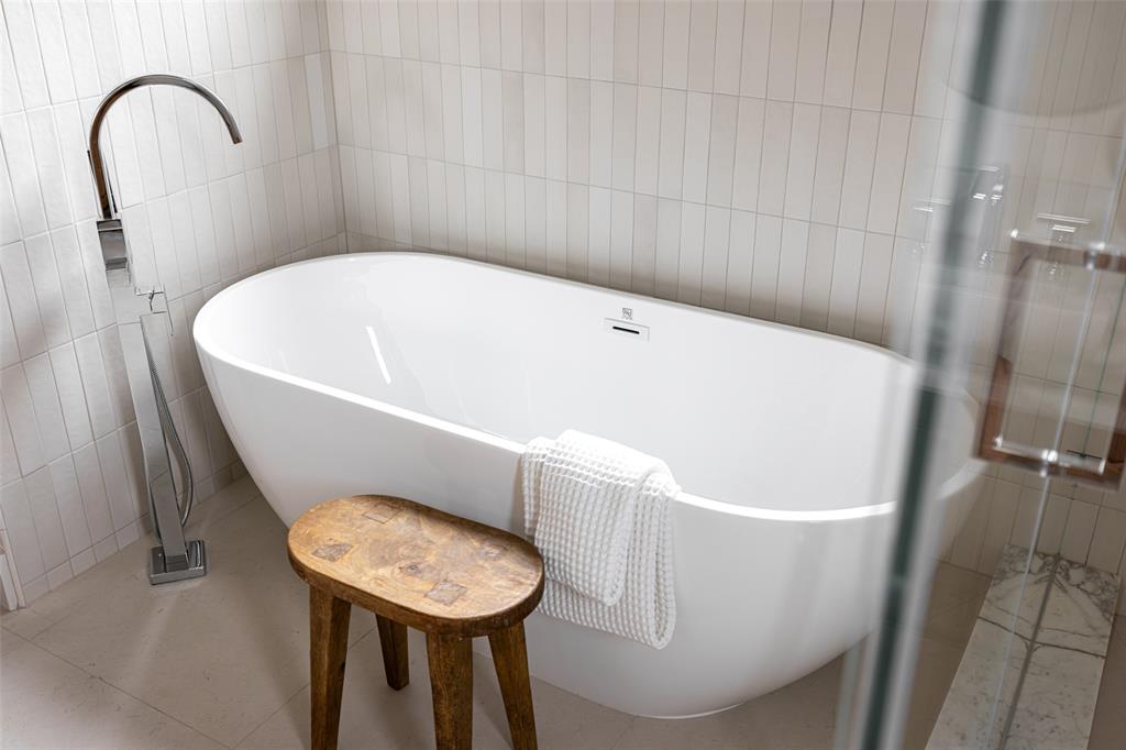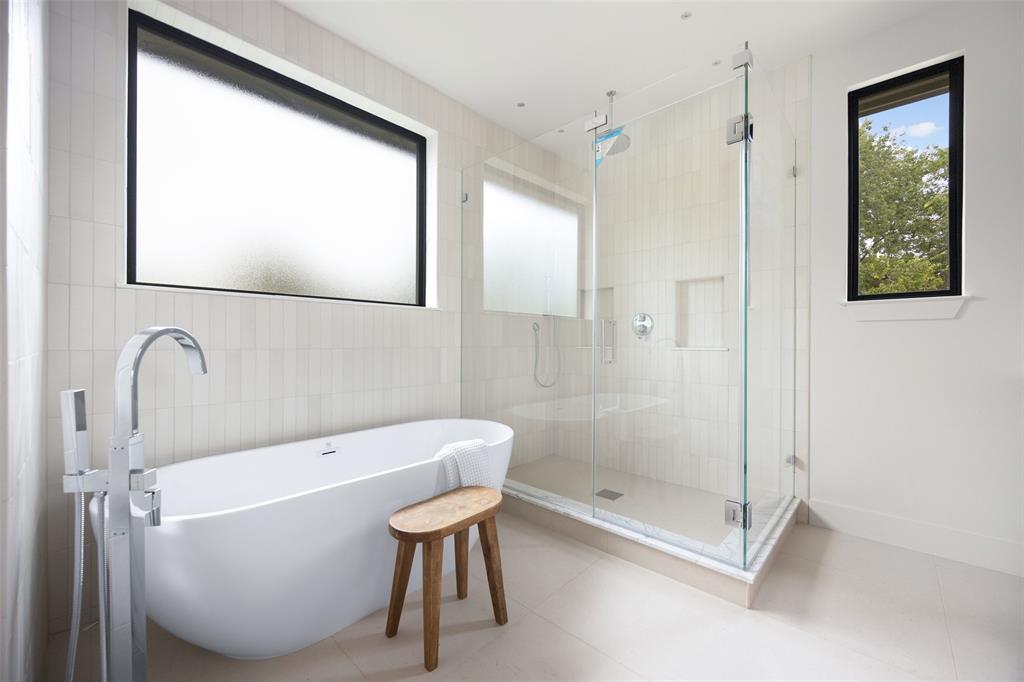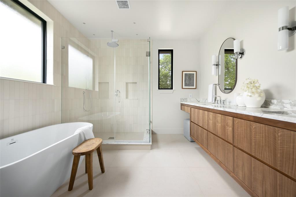 The expansive primary suite is flooded with natural light, and the spa-like primary bath features a walnut and marble vanity, exquisite tilework, and a large walk-in closet.