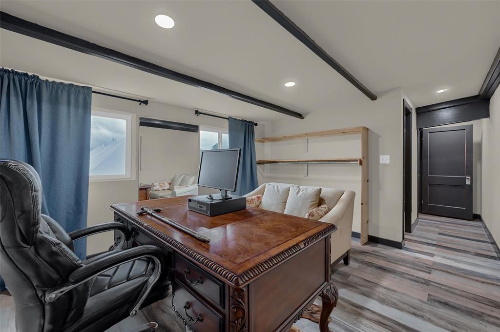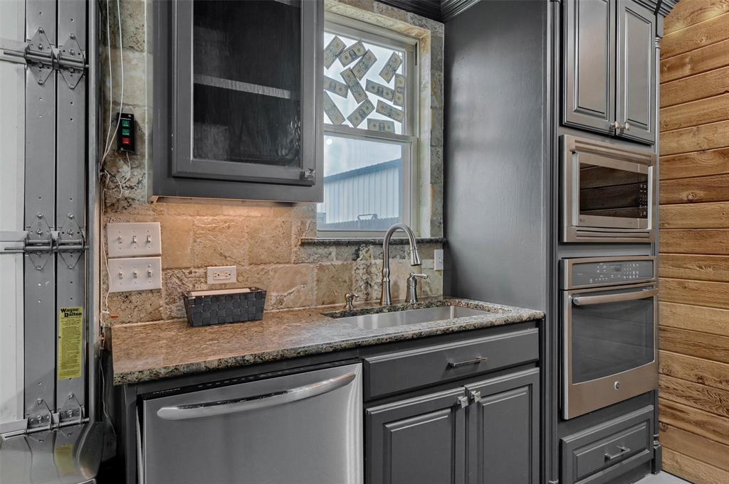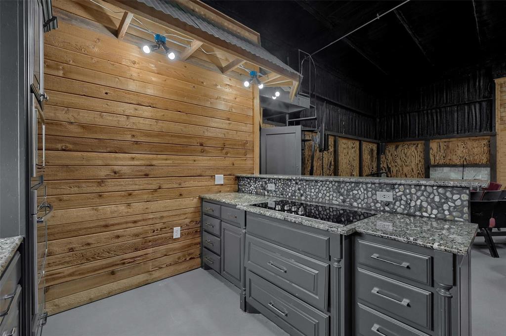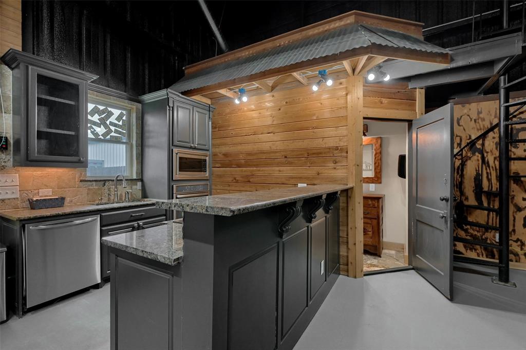 The open-concept living area includes 3 bedrooms and 2 bathrooms, providing over 2,100 square feet of space. It also has multiple rooms that can be utilized as offices, a kitchen, or storage. The kitchen boasts granite countertops and stainless steel appliances, including an electric glass cooktop, double oven, microwave, dishwasher, disposal, and a large stainless steel undermount sink. Additionally, there is a large commercial insulated roll-up door leading into the main living space.