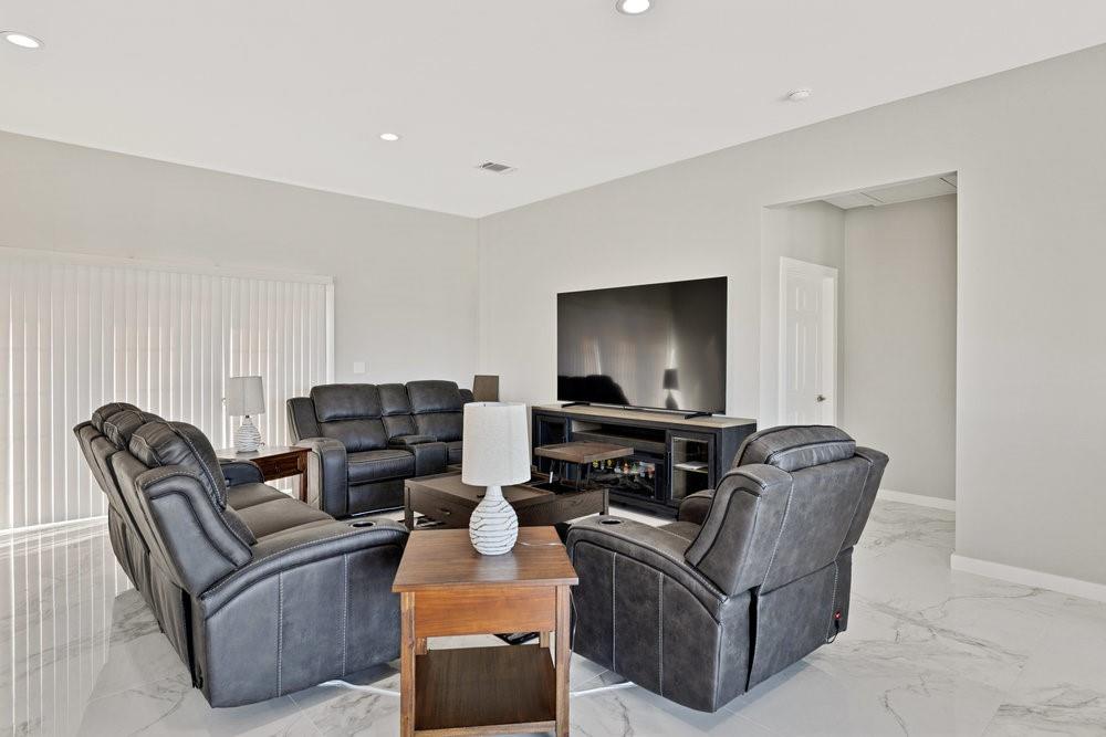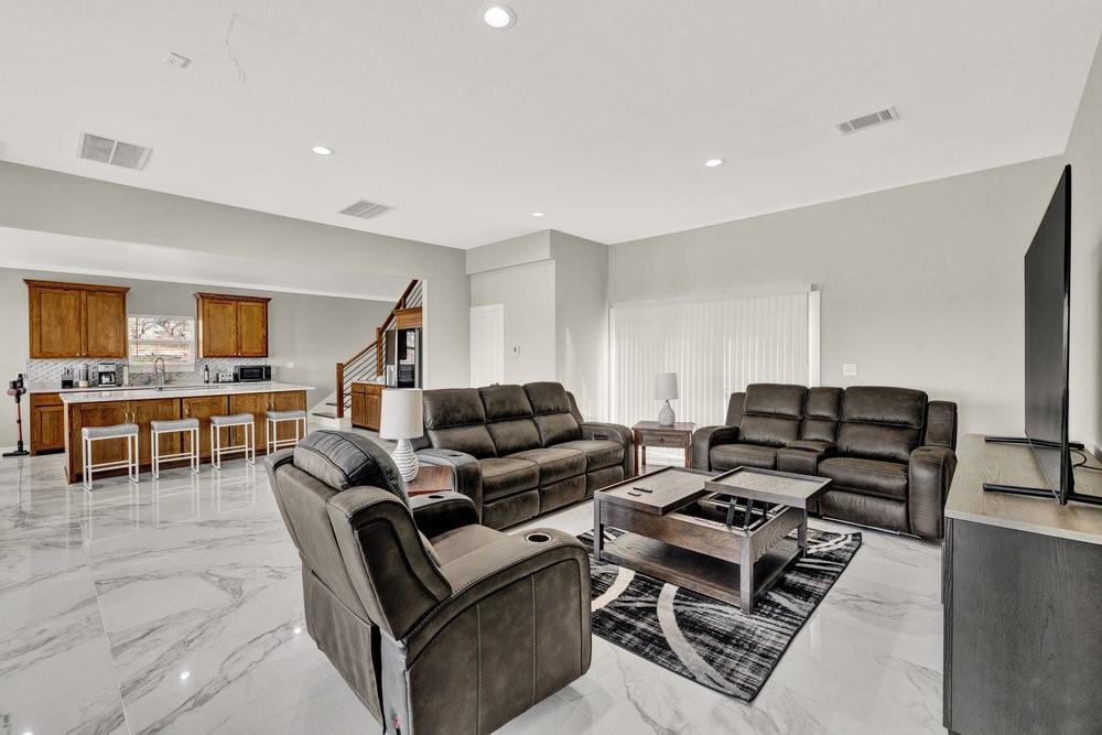 Inside, the open-plan living area is perfect for family gatherings, with abundant natural light pouring in from large windows and high ceilings that create an airy, welcoming atmosphere. The modern staircase adds a touch of elegance, and the home's layout makes entertaining a breeze. Whether you're hosting friends or enjoying a quiet night in, this home is designed for both comfort and style.