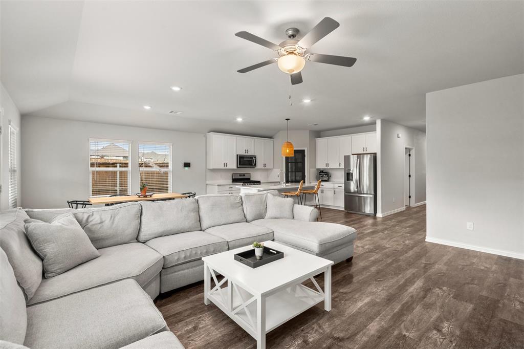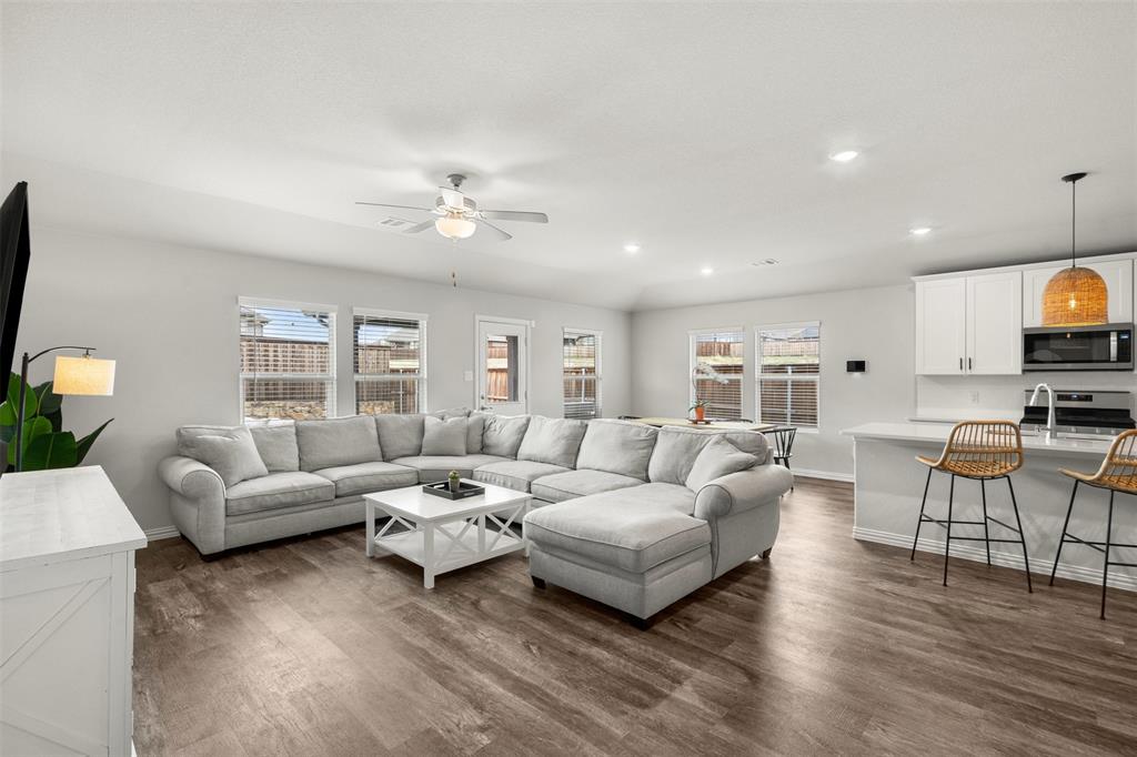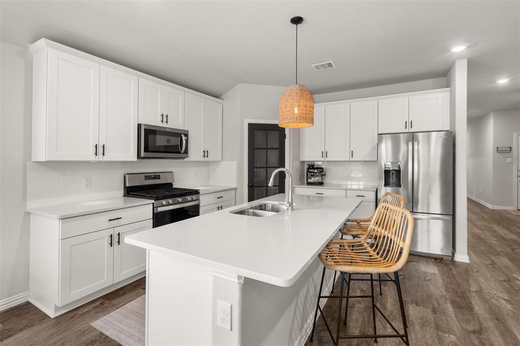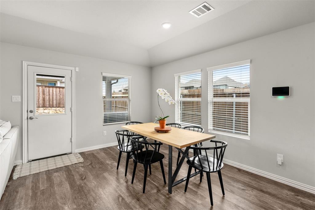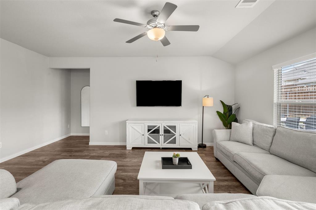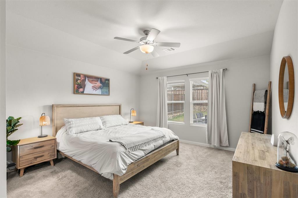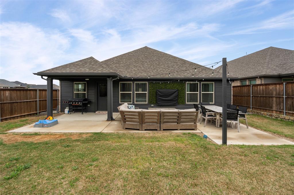 Welcome to 10420 Colina Drive! This stunning 4-bedroom, 3-bathroom home offers 2,059 sq. ft. of modern luxury in the sought-after Ventana community. Located on a green belt and adjacent to a new trail winding its way through the community, this home has something for everyone. The open floor plan features elegant luxury vinyl plank flooring throughout, creating a seamless flow between living spaces. The chef-inspired kitchen boasts beautiful white quartz countertops, a breakfast bar, sleek stainless-steel appliances, and ample storage with a walk-in pantry. A custom dry bar-comfort station with a beverage cooler and stylish wallpaper adds a unique touch of convenience and charm. The primary suite offers a spa-like bathroom with dual vanities, a separate tub, a walk-in shower, and a massive closet. A second guest suite with its own private en-suite bathroom provides another private retreat for guests. Two additional bedrooms offer flexibility and a place for a home office. Step outside to the sprawling extended covered patio, prewired for a wall-mounted TV - ideal for outdoor entertainment and relaxing evenings. Designed with energy-efficient technology, this home enhances daily living while minimizing environmental impact and lowering utility bills. Located just minutes from downtown Fort Worth, Lockheed, and TCU, Ventana offers outstanding amenities, including a new on-site elementary school, two dog parks, a playground, an amenity center, miles of scenic walking trails, and two resort-style community pools. Thoughtfully maintained and move-in ready, this home is a must-see!