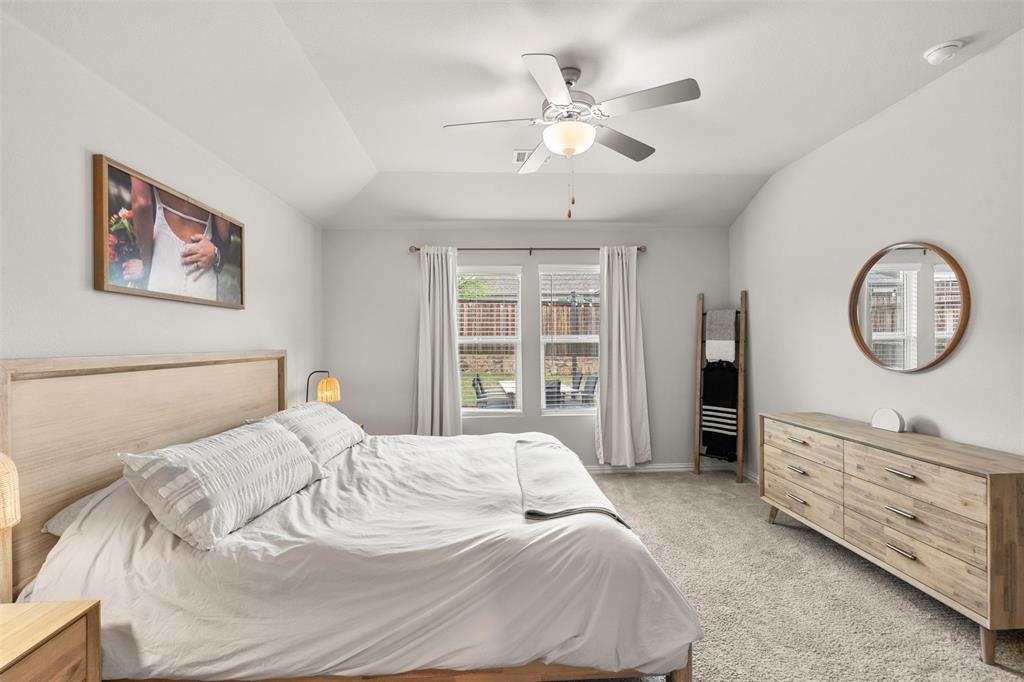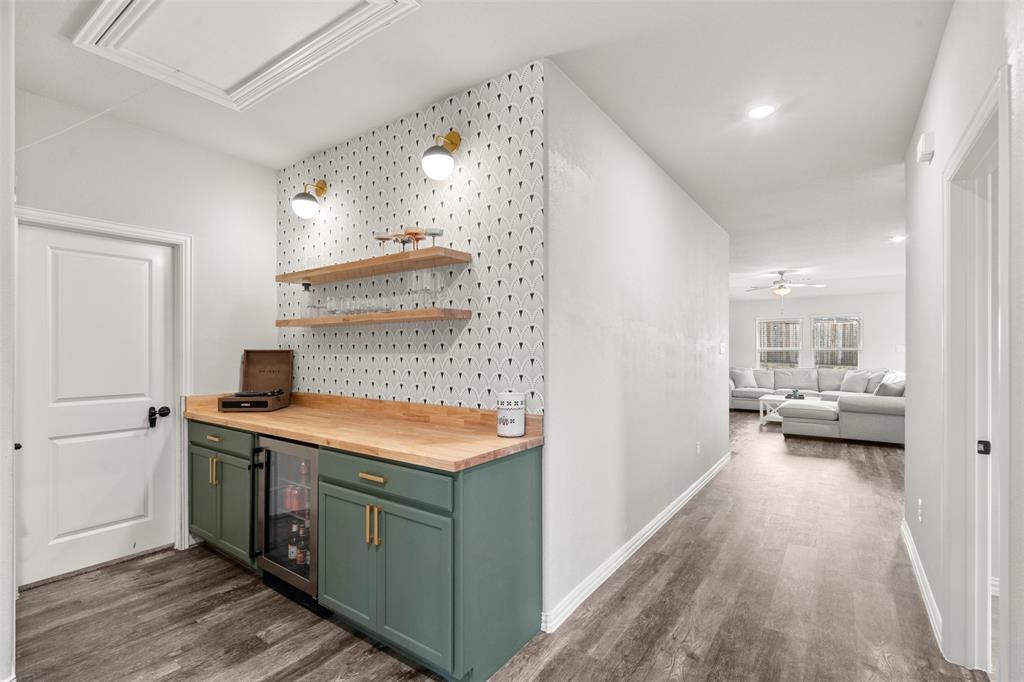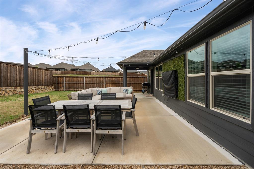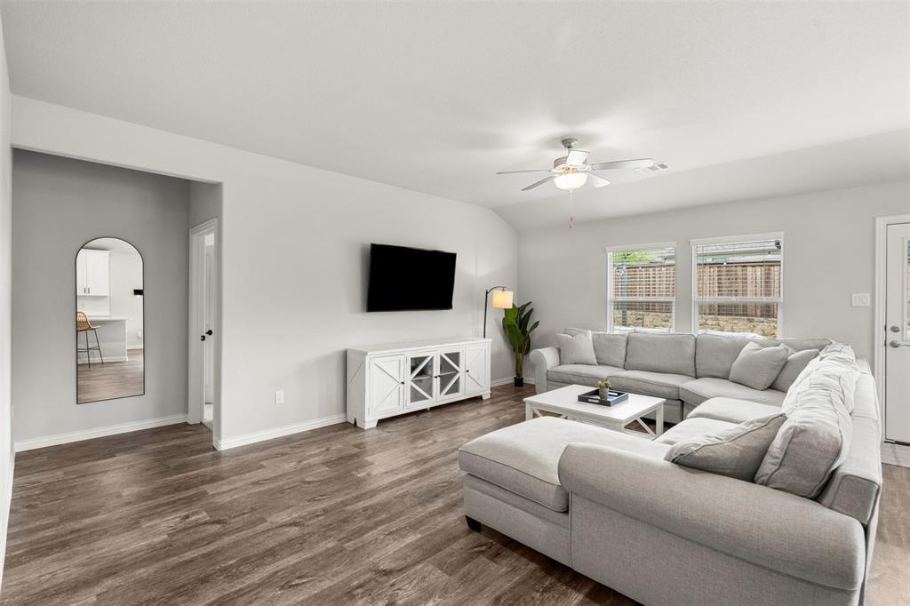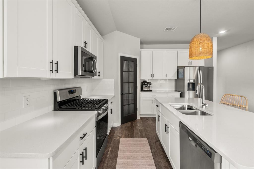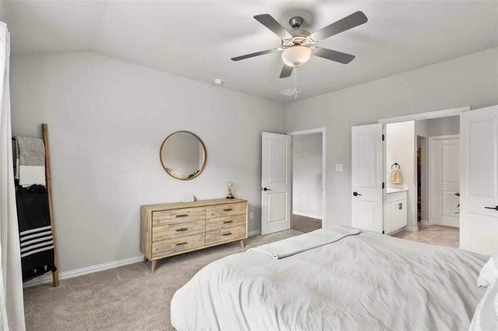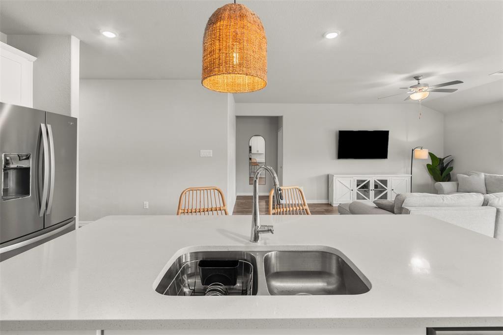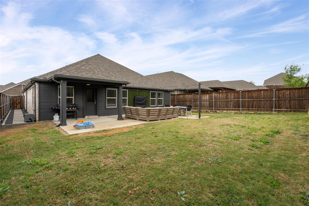 Welcome to 10420 Colina Drive! This stunning 4-bedroom, 3-bathroom home offers 2,059 sq. ft. of modern luxury in the sought-after Ventana community. Located on a green belt and adjacent to a new trail winding its way through the community, this home has something for everyone. The open floor plan features elegant luxury vinyl plank flooring throughout, creating a seamless flow between living spaces. The chef-inspired kitchen boasts beautiful white quartz countertops, a breakfast bar, sleek stainless-steel appliances, and ample storage with a walk-in pantry. A custom dry bar-comfort station with a beverage cooler and stylish wallpaper adds a unique touch of convenience and charm. The primary suite offers a spa-like bathroom with dual vanities, a separate tub, a walk-in shower, and a massive closet. A second guest suite with its own private en-suite bathroom provides another private retreat for guests. Two additional bedrooms offer flexibility and a place for a home office. Step outside to the sprawling extended covered patio, prewired for a wall-mounted TV - ideal for outdoor entertainment and relaxing evenings. Designed with energy-efficient technology, this home enhances daily living while minimizing environmental impact and lowering utility bills. Located just minutes from downtown Fort Worth, Lockheed, and TCU, Ventana offers outstanding amenities, including a new on-site elementary school, two dog parks, a playground, an amenity center, miles of scenic walking trails, and two resort-style community pools. Thoughtfully maintained and move-in ready, this home is a must-see!