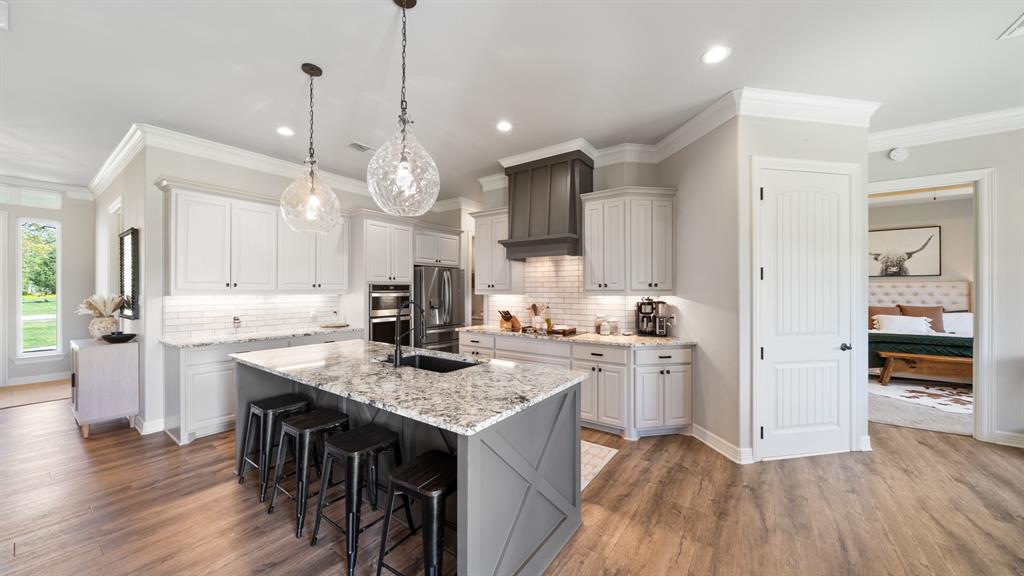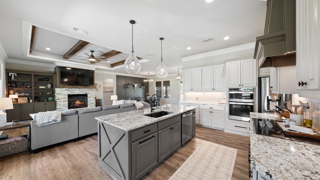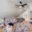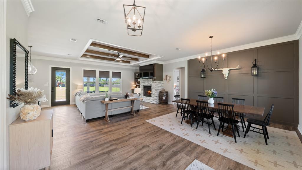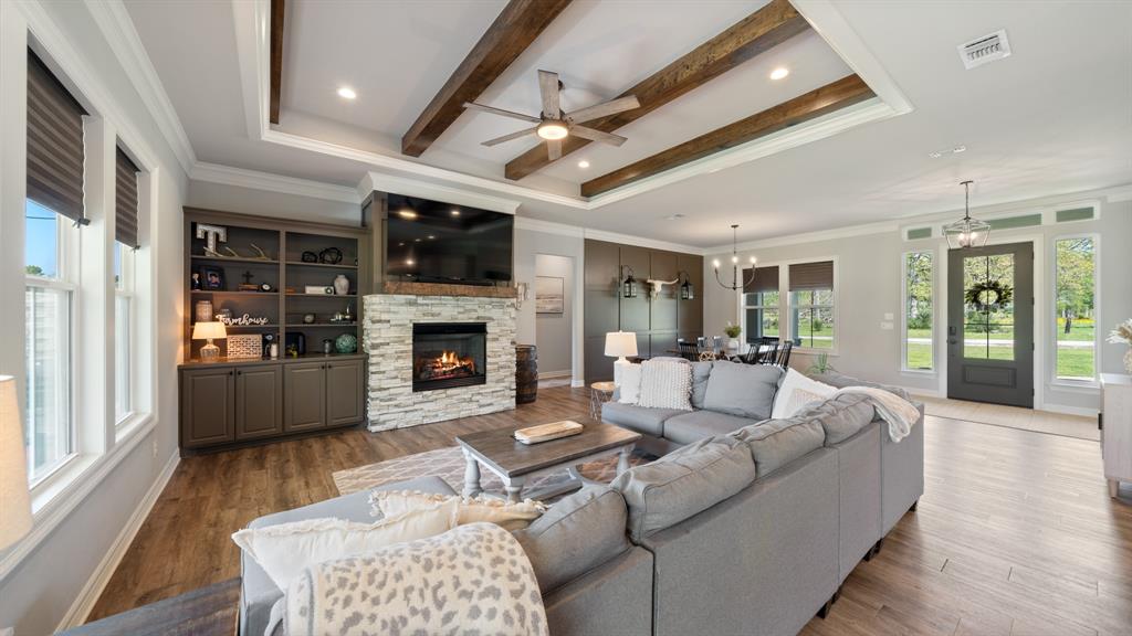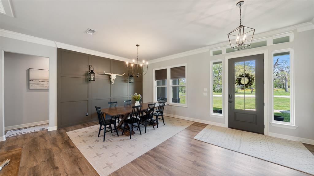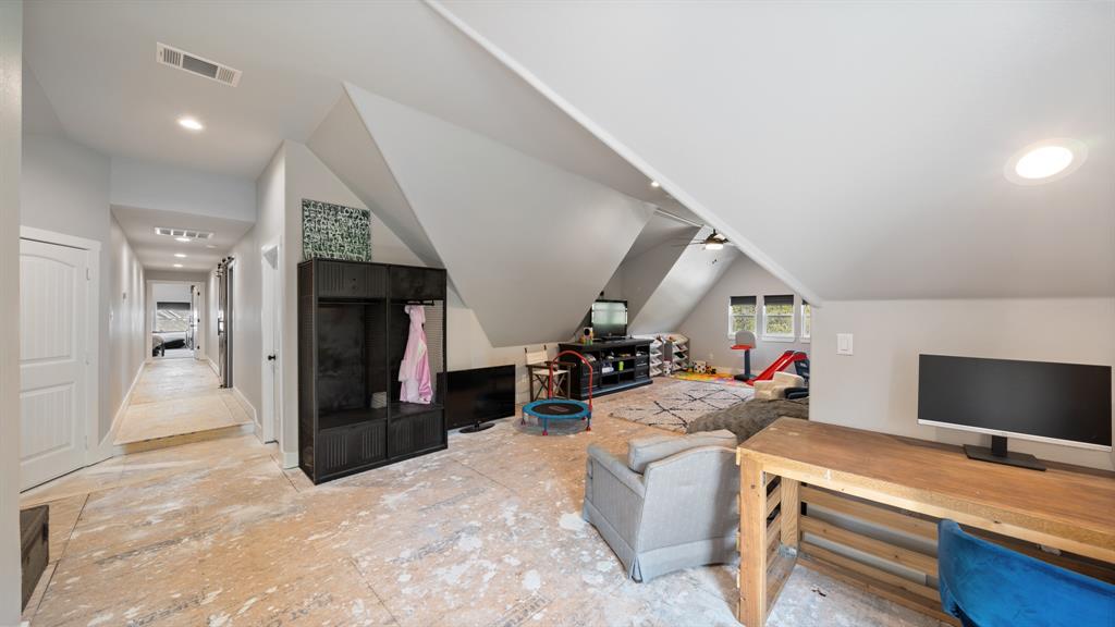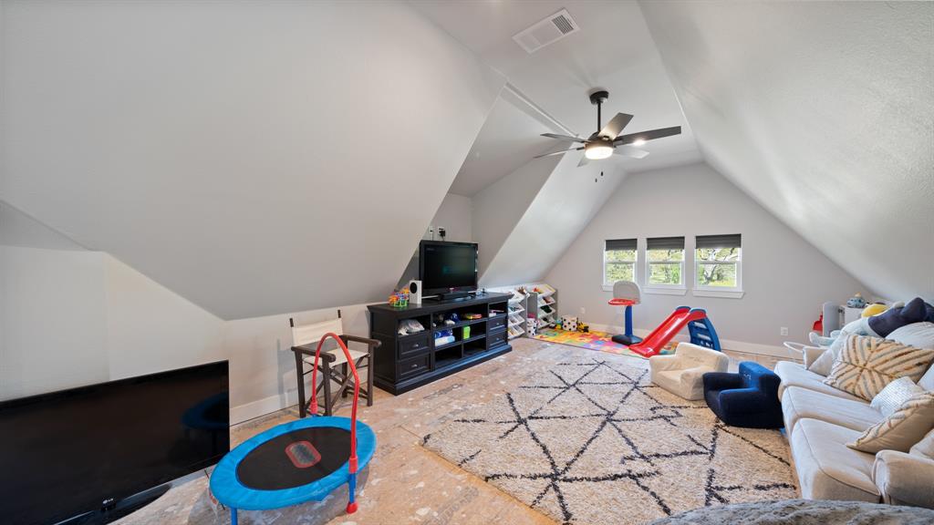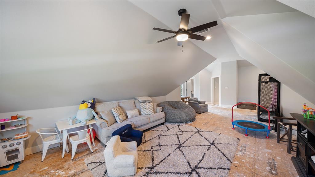 with the primary bedroom downstairs, The house boasts five bedrooms and three full bathrooms, complemented by two additional half baths, ensuring ample space for family and friends. It's perfect for entertaining, featuring a bonus game room or media room ideal for hosting gatherings or enjoying a cozy movie night. open concept kitchen over looks the living room and dinning area with lots of natural sunlight. The home's features include vaulted ceilings and an impressive high roofline, creating a spacious and open atmosphere.