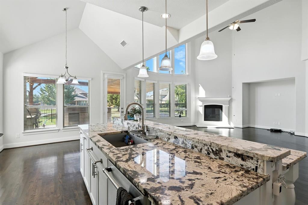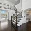 The gourmet kitchen is a chef’s dream, showcasing sleek Shaker cabinets, granite countertops, double ovens, a six-burner commercial-style gas cooktop, and a spacious island. Luxury finishes throughout include an exquisite oak staircase with wrought iron spindles, rich hardwood floors, stately 8-foot doors on the main level, and a grand cast stone fireplace.
