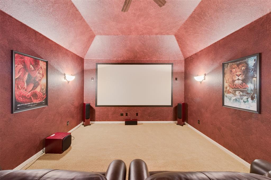 Upstairs, you'll find four generously sized bedrooms, two Jack and Jill bathrooms, a large game room, and a fully equipped media room ideal for movie nights and family fun. At the heart of the home is a chef’s kitchen boasting granite countertops, a large island, and a gas cooktop, all flowing seamlessly into the open concept family room. Enjoy cozy mornings in the breakfast nook beside the double stone accented fireplace. Formal living and dining rooms, plantation shutters, and expansive windows add charm and character throughout. Additional highlights include: Dual staircases with wrought iron spindles and wood accents, Spacious utility room with gas dryer hookup, overhead cabinetry, and extra storage, Three car garage with EV charging station and built in shelving, and a Beautifully landscaped backyard with 8 foot board on board fencing and electric gate.