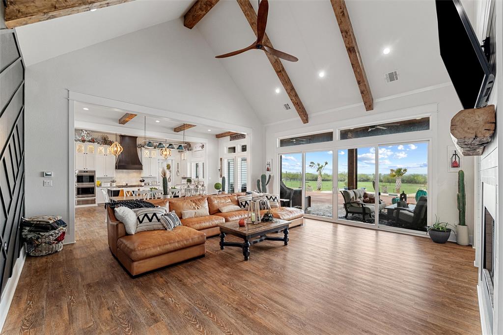 The main home features ensuite bathrooms in every bedroom, giving each family member or guest their own private retreat. Soaring ceilings with exposed wood beams, a stunning stone fireplace, and expansive windows flood the living spaces with natural light and countryside views. The gourmet kitchen is a showstopper with Wolfe brand appliances, commercial-grade Sub-Zero Wolf refrigeration, and a massive island perfect for gathering and entertaining.