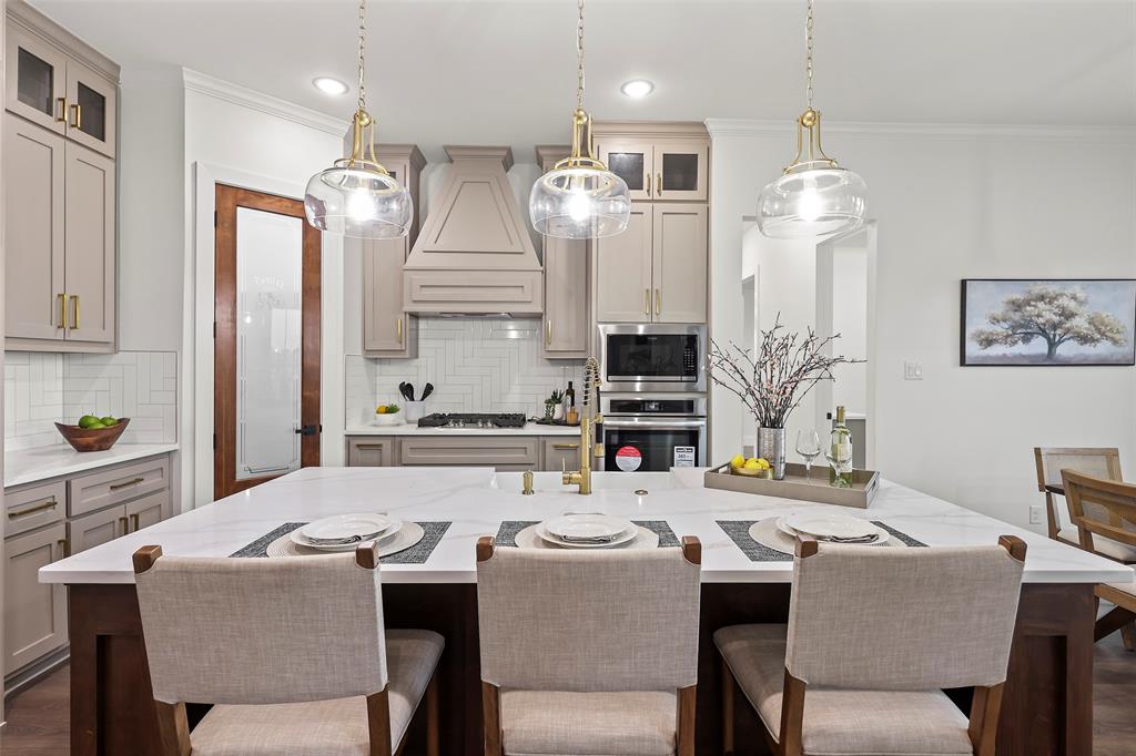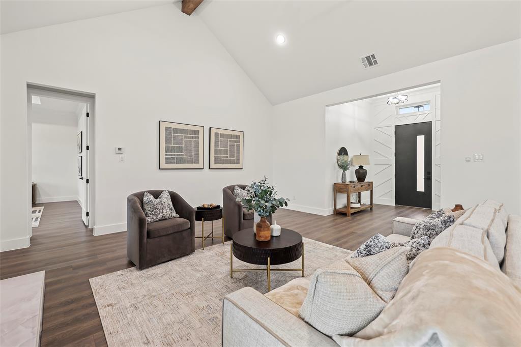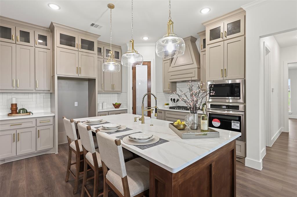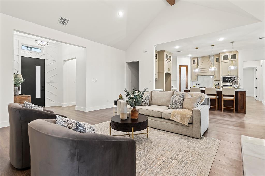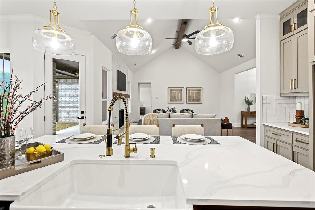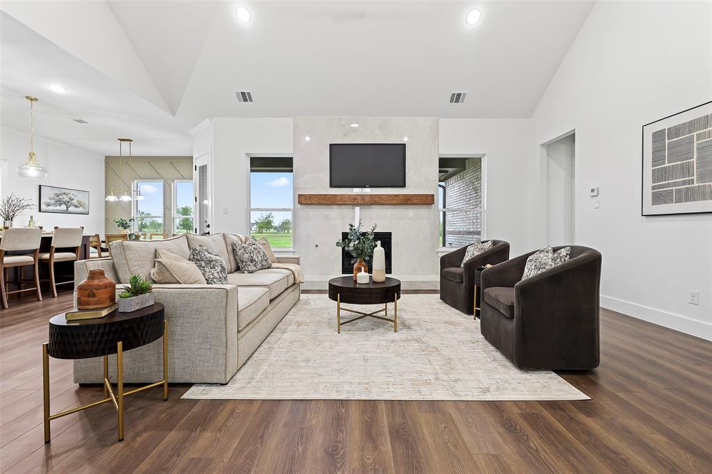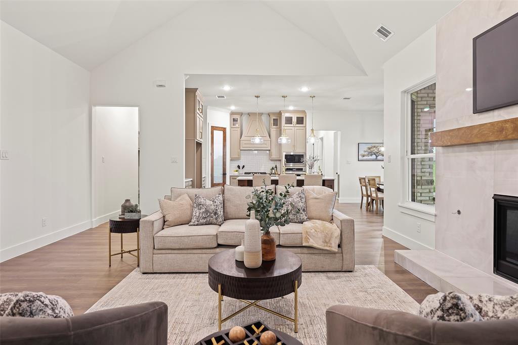 The living room is an inviting retreat with abundant natural light and impressive cathedral ceilings for an airy grandeur. The heart of the home is the gourmet kitchen with striking cabinetry, & Gleaming countertops, custom cabinetry, a central island create an inviting culinary exploration and entertaining space.sprawling island to accommodate all your culinary creations.