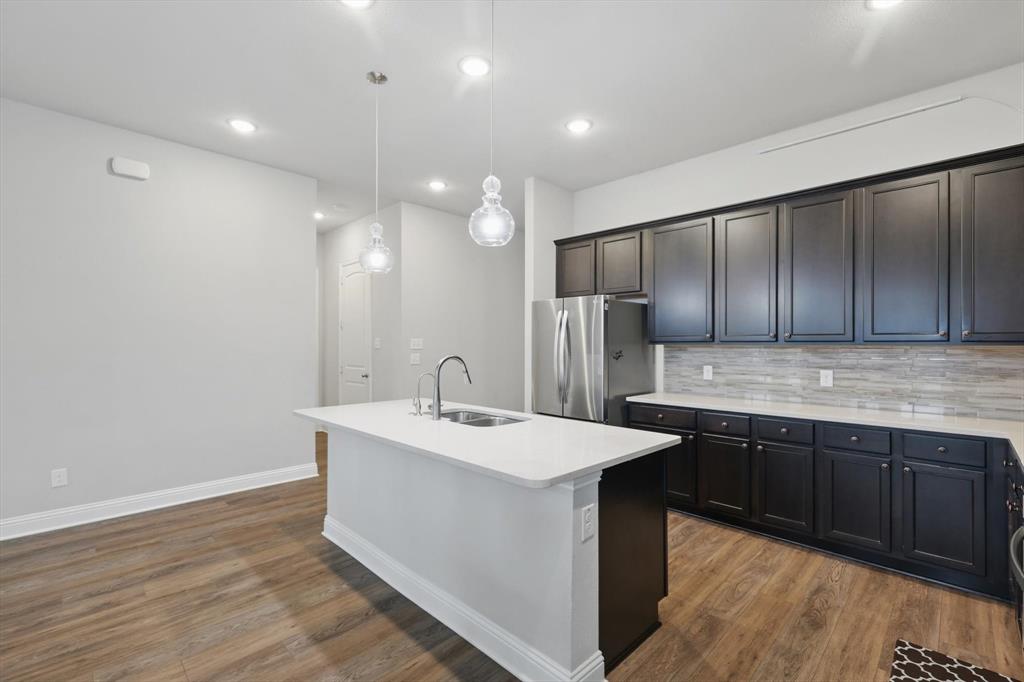 The kitchen showcasing stunning quartz counter tops that complement the warm wood cabinetry. A large island with bar seating, stainless steel appliances, and plenty of counter space makes cooking and entertaining a breeze. Recently updated with both a water softener and water purifier, ensuring clean, filtered water throughout the home!