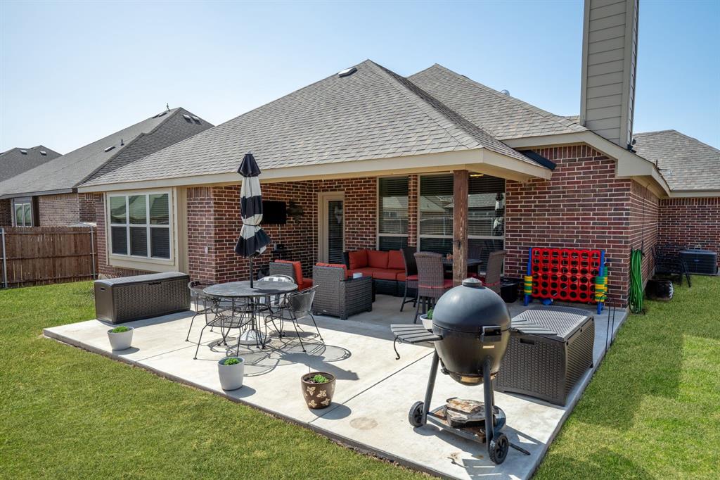 Welcome to this stunning single-story Impression Home in desirable Krum, offering an ideal combination of style, comfort, and thoughtful upgrades. This well-designed home features an oversized 3-car garage, freshly painted with an upgraded epoxy-coated floor for a clean, finished look and added durability. The open floor plan is filled with natural light and includes generously sized bedrooms, including a spacious primary suite with an upgraded walk-in closet featuring built-in shelving and extra storage for clothes, shoes, and more. The kitchen and bathrooms are beautifully finished with granite countertops, and the main living areas showcase stylish plank flooring, while tile adds practicality in the wet areas. A cozy fireplace with a stone surround serves as the focal point of the living room. Step outside to an extended covered patio with a newly poured 17x10 concrete slab—perfect for outdoor dining, entertaining, or simply relaxing in your expansive backyard. With high-end finishes, thoughtful touches, and move-in ready condition, this home checks all the boxes for comfortable and elevated living.