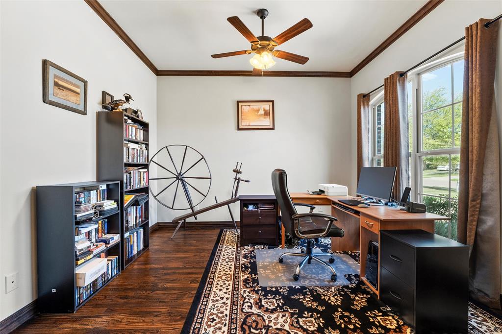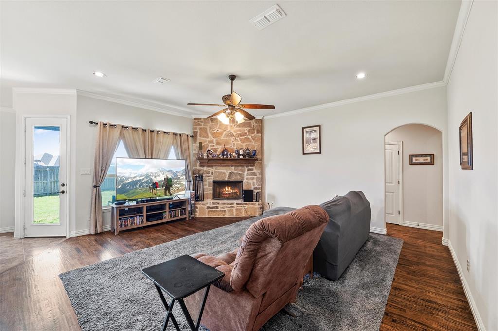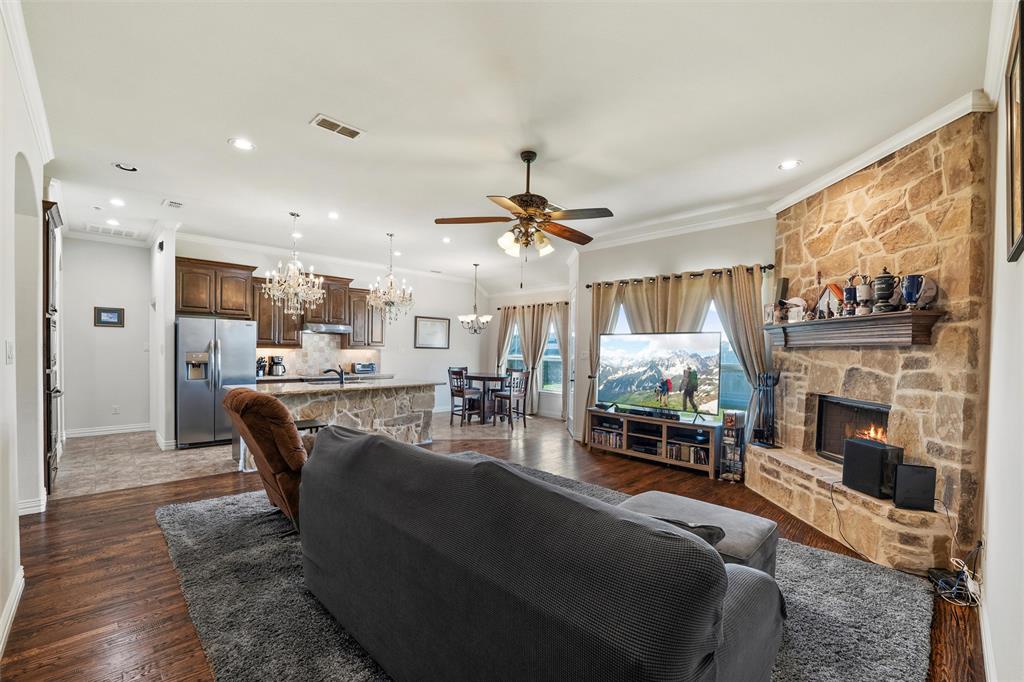 Step inside to discover a thoughtfully designed layout featuring warm wood flooring, crown molding, and an abundance of natural light. The dedicated home office is perfect for remote work or a quiet retreat. The open-concept living area centers around a cozy stone fireplace, creating an ideal space for relaxing or entertaining guests.