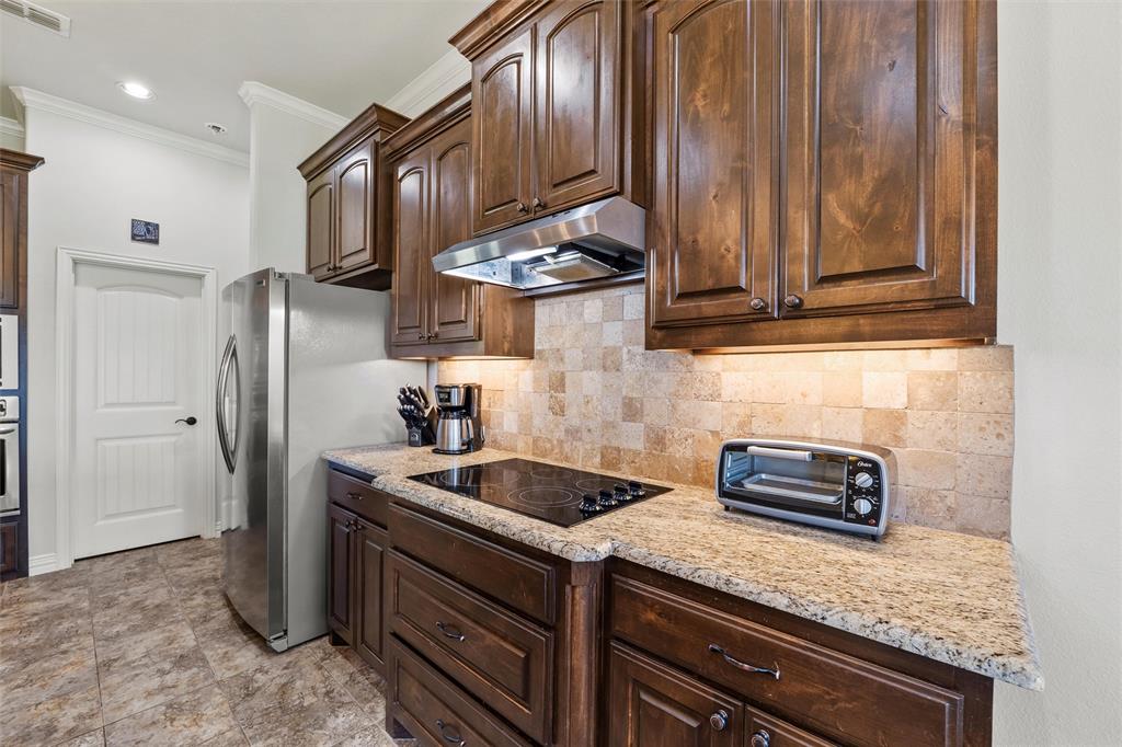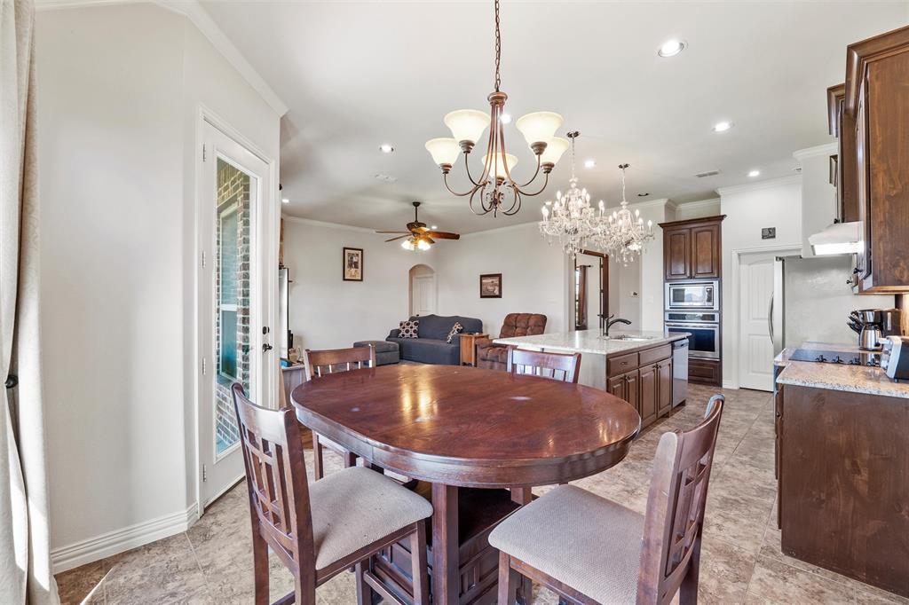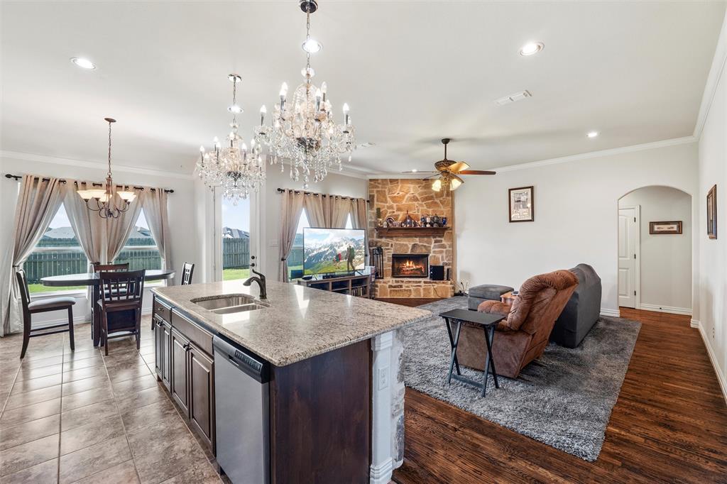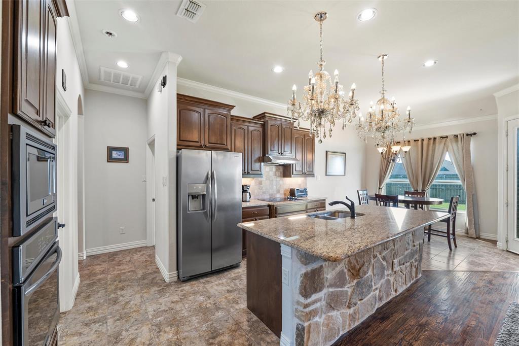 The heart of the home is the gourmet kitchen, complete with granite countertops, custom cabinetry, stainless steel appliances, a stone-front island, and stunning dual chandeliers that add a touch of luxury. The adjacent dining area offers peaceful backyard views and access to the covered patio—ideal for morning coffee or evening grilling.