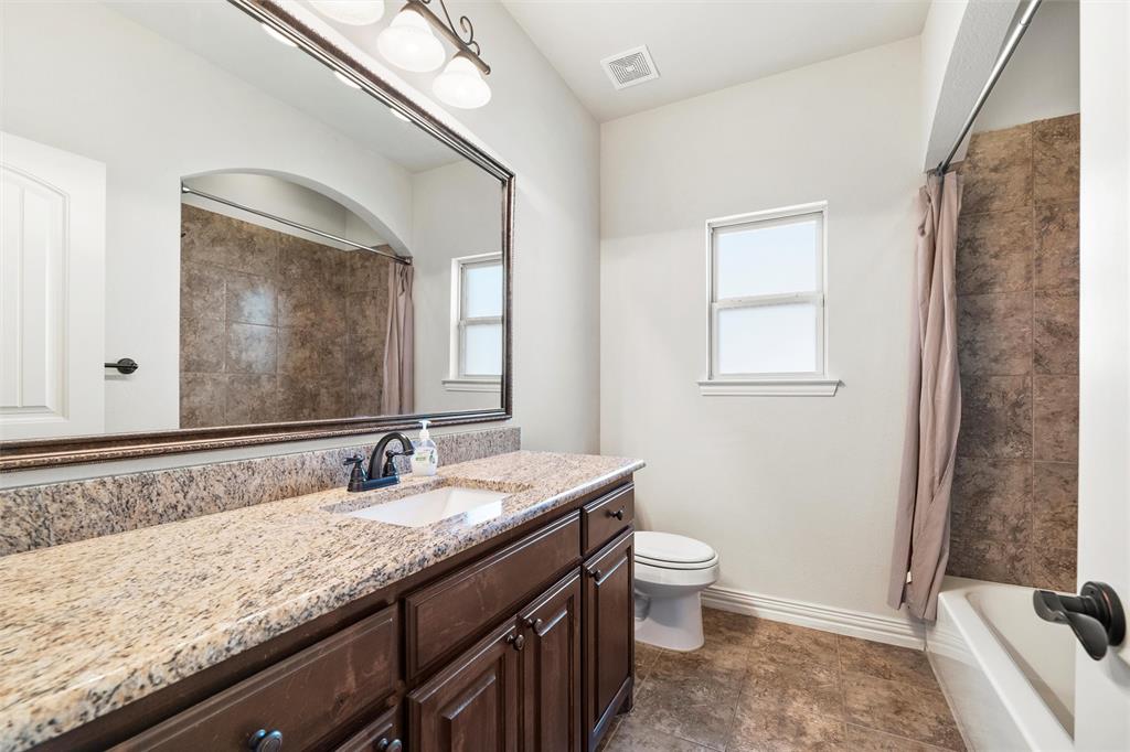 The private primary suite is a true retreat, featuring a tray ceiling, oversized windows, and a luxurious en-suite bath with dual vanities, granite countertops, a soaking tub, and a separate shower. Two additional bedrooms are generously sized and share a full bath with upgraded tile finishes.