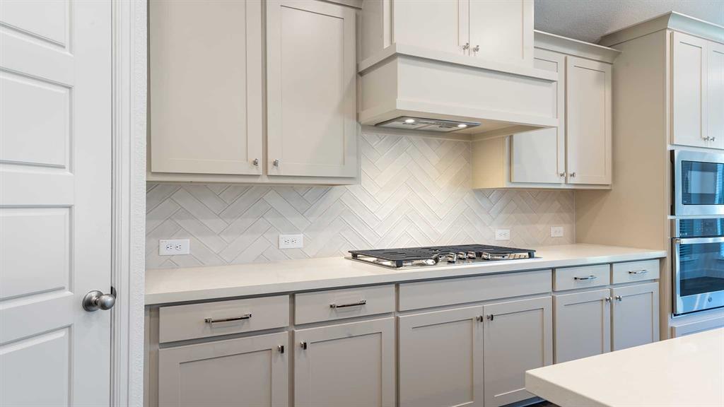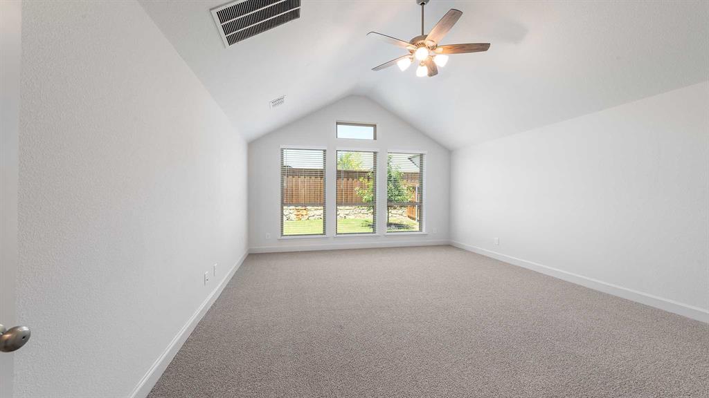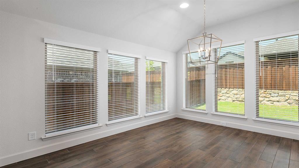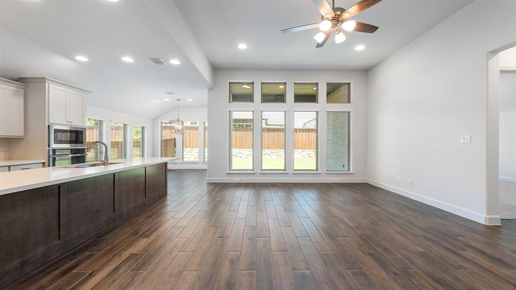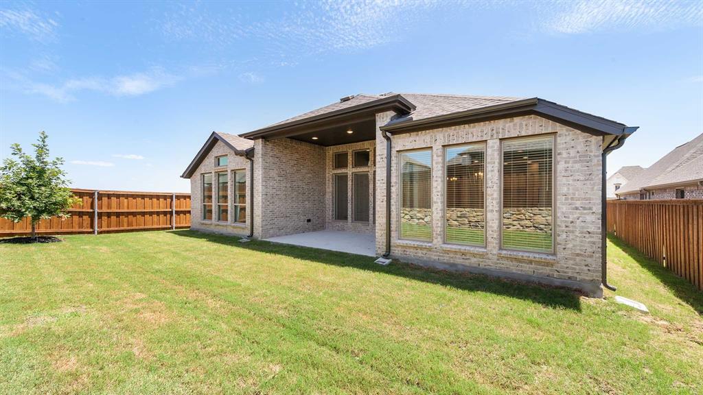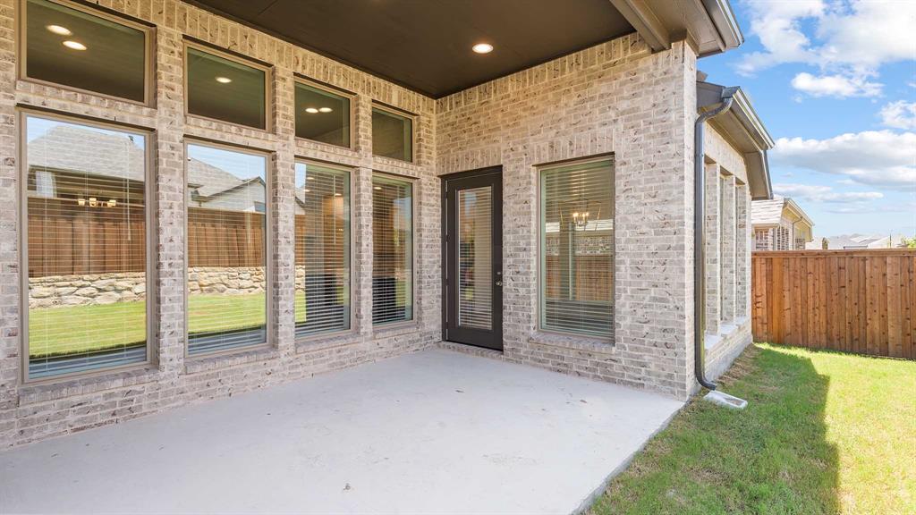 Home office with French doors set at entry with 12-foot ceiling. Coffered extended entry leads to open family room, kitchen and dining area. Family room features a wood mantel fireplace and wall of windows. Kitchen features corner walk-in pantry, 5-burner gas cooktop and generous island with built-in seating space. Primary bedroom highlights 12-foot ceiling and wall of windows. Double doors lead to primary bath with dual vanities, garden tub and separate glass-enclosed shower with separate walk-in closets. A guest suite with private bath adds to this one-story design. Covered backyard patio. Mud room off two-car garage.