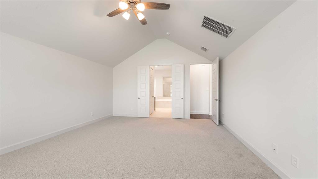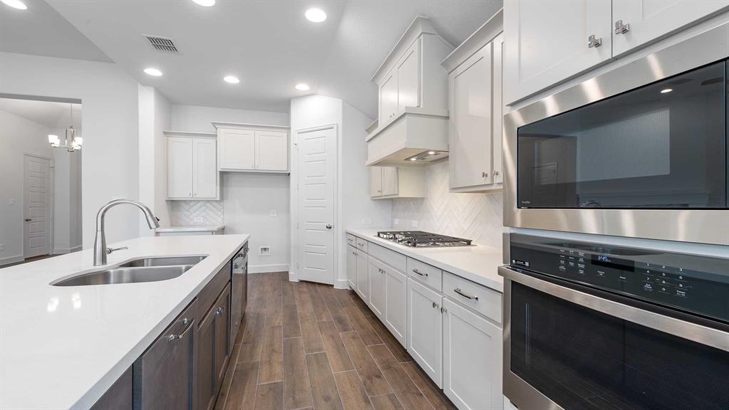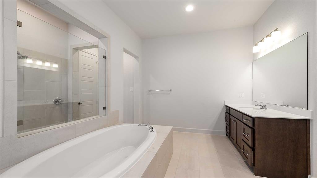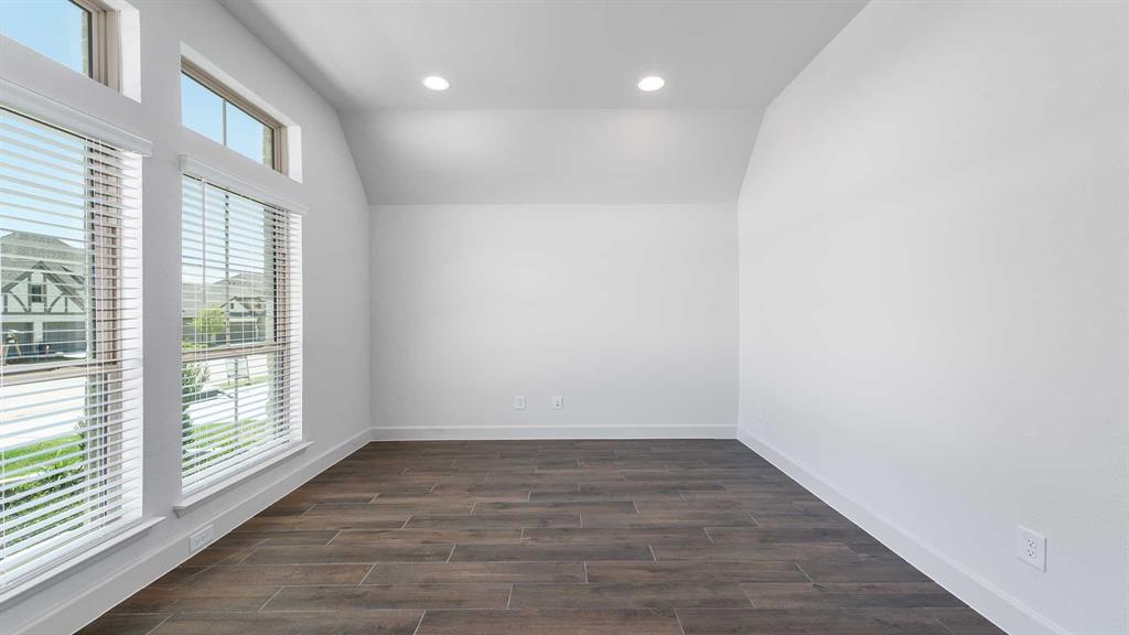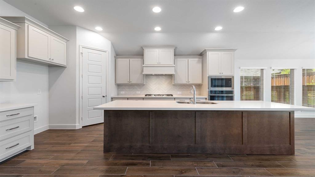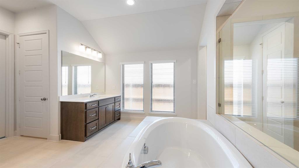 Home office with French doors set at entry with 12-foot ceiling. Coffered extended entry leads to open family room, kitchen and dining area. Family room features a wood mantel fireplace and wall of windows. Kitchen features corner walk-in pantry, 5-burner gas cooktop and generous island with built-in seating space. Primary bedroom highlights 12-foot ceiling and wall of windows. Double doors lead to primary bath with dual vanities, garden tub and separate glass-enclosed shower with separate walk-in closets. A guest suite with private bath adds to this one-story design. Covered backyard patio. Mud room off two-car garage.