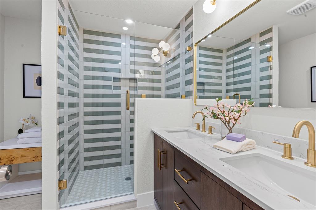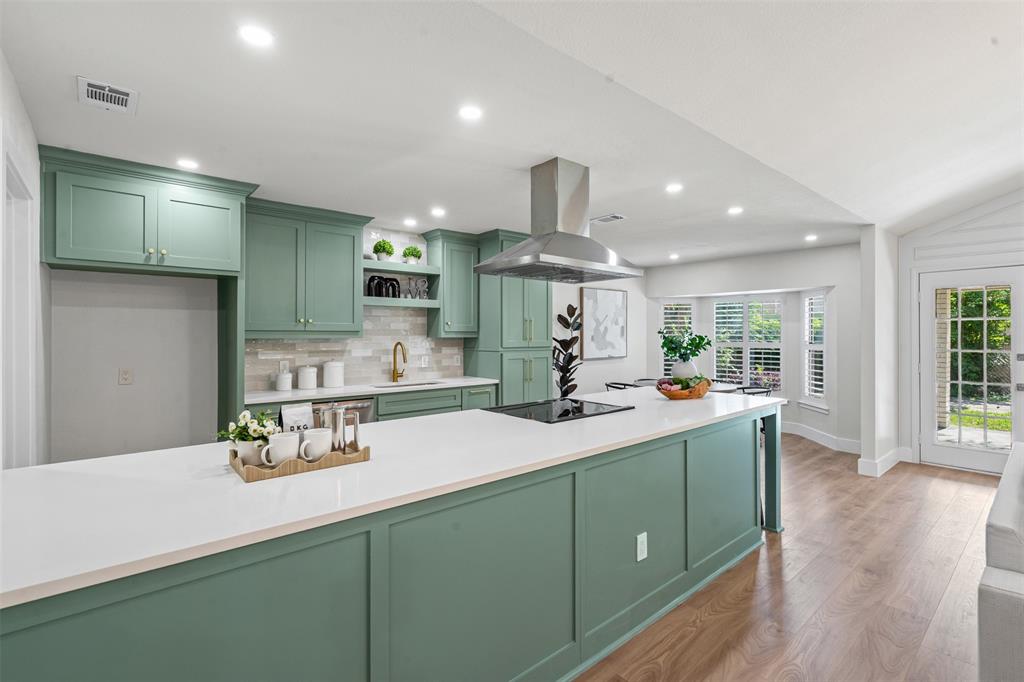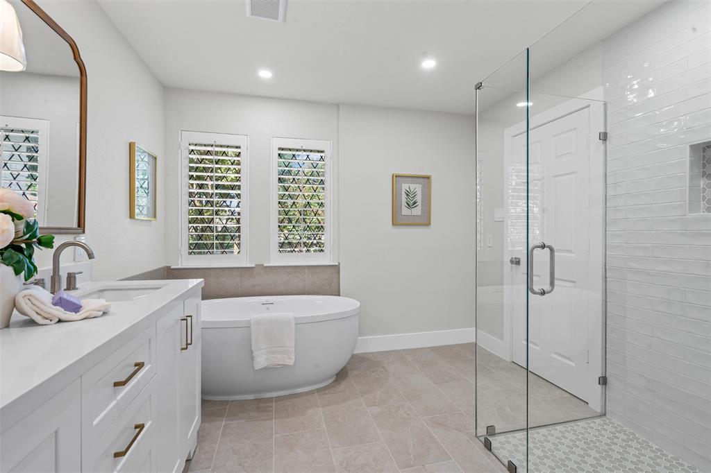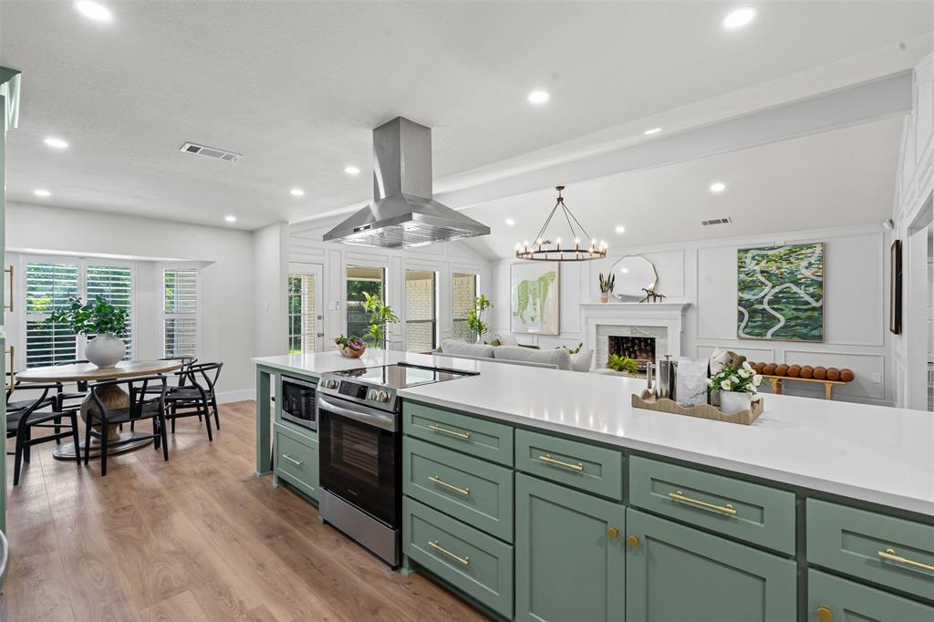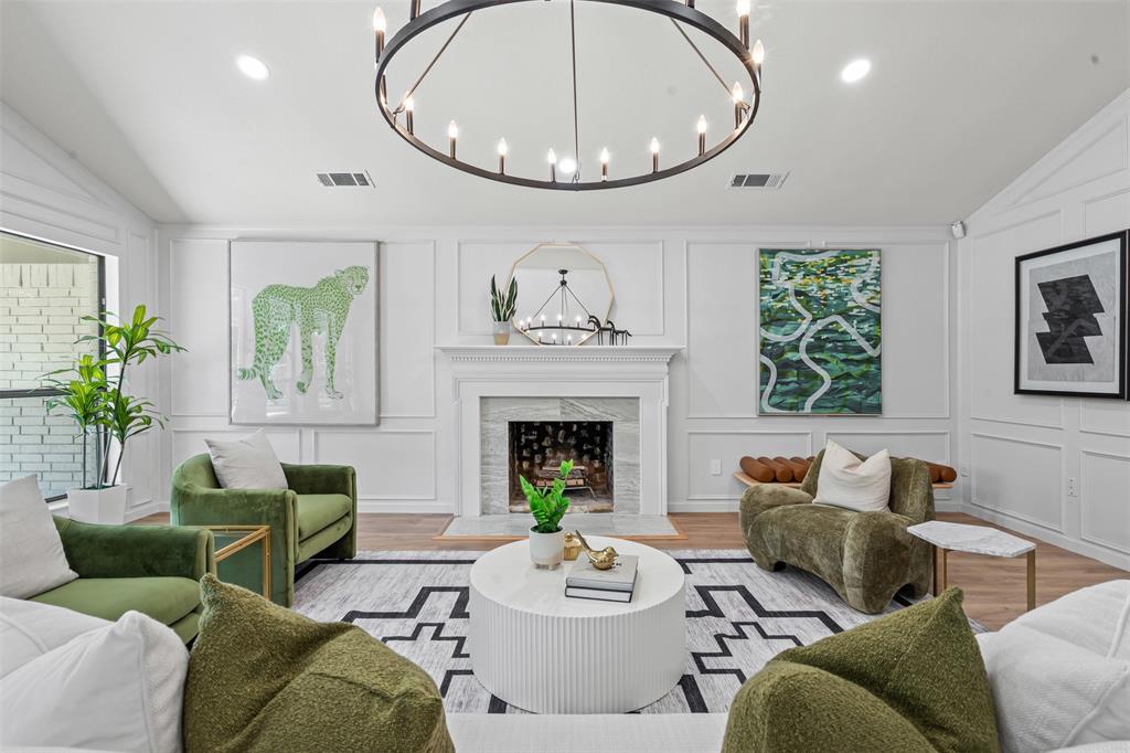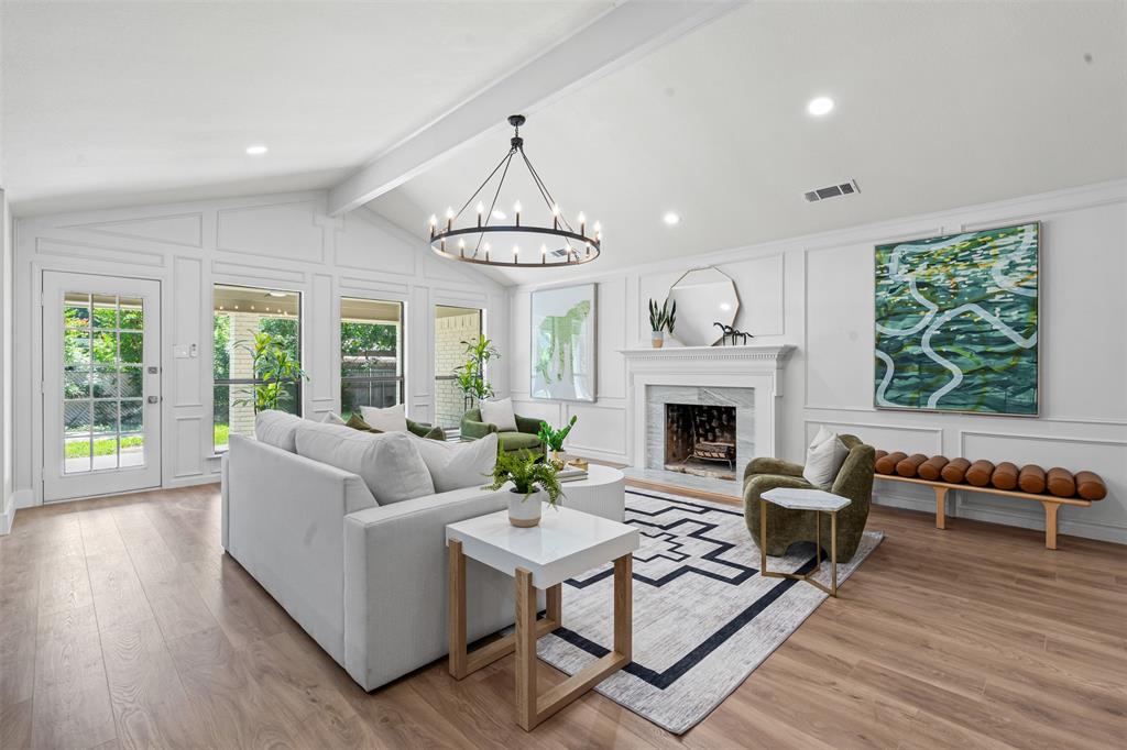 Step into refined elegance with this beautifully remodeled 3-bedroom, 2-bathroom home that seamlessly blends modern luxury with everyday comfort. Tucked away on a cul-de-sac at the end of a tree-lined street, this home offers enhanced privacy and seclusion. Everything has been thoughtfully updated-from designer finishes to an open-concept layout that maximizes natural light and space. A spacious entry greets you and French doors open to a home office that could also serve as a media room or extra dining space. The heart of the home is a gourmet kitchen featuring quartz countertops, custom cabinetry, stainless steel appliances, and a large peninsula perfect for entertaining. The kitchen and dining areas flow effortlessly into the expansive great room with vaulted ceilings, picture frame molding, and a wood burning fireplace surrounded by marble tile. The primary suite is a true retreat, complete with its own fireplace, spacious walk-in closet and a spa-inspired en-suite bathroom boasting a double vanity, soaking tub, and a frameless glass shower. Two additional bedrooms offer generous closets and share a chic, fully updated bathroom with modern fixtures and tilework. Roof was replaced in 2025 as well as HVAC compressor. With thoughtful upgrades, premium materials, and a layout designed for modern living, this home offers the perfect balance of style, space, and sophistication.