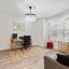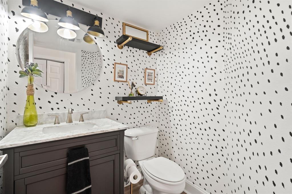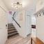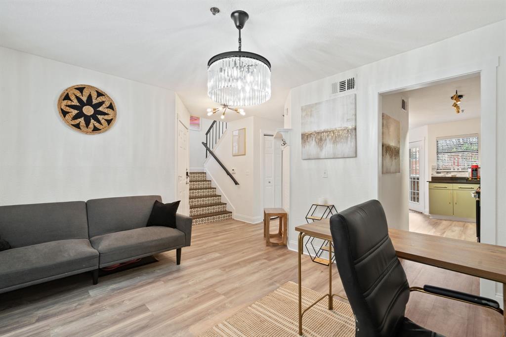 Inside, you'll find stylish updates throughout—luxury vinyl plank flooring, custom accent walls, and a curated mix of decorative lighting fixtures, including a cascading statement chandelier above the staircase and bold mid-century inspired pieces in the kitchen, entry, and living areas.