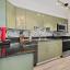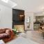 Natural light pours through a trio of skylights, highlighting a vaulted ceiling and a sleek fireplace wall finished in dramatic matte black paneling. The kitchen features sage cabinetry, granite countertops, a mosaic tile backsplash, and stainless appliances including an LG French door fridge, Whirlpool range, and Samsung microwave. A nearby nook offers flexible space for additional prep or bistro-style seating.