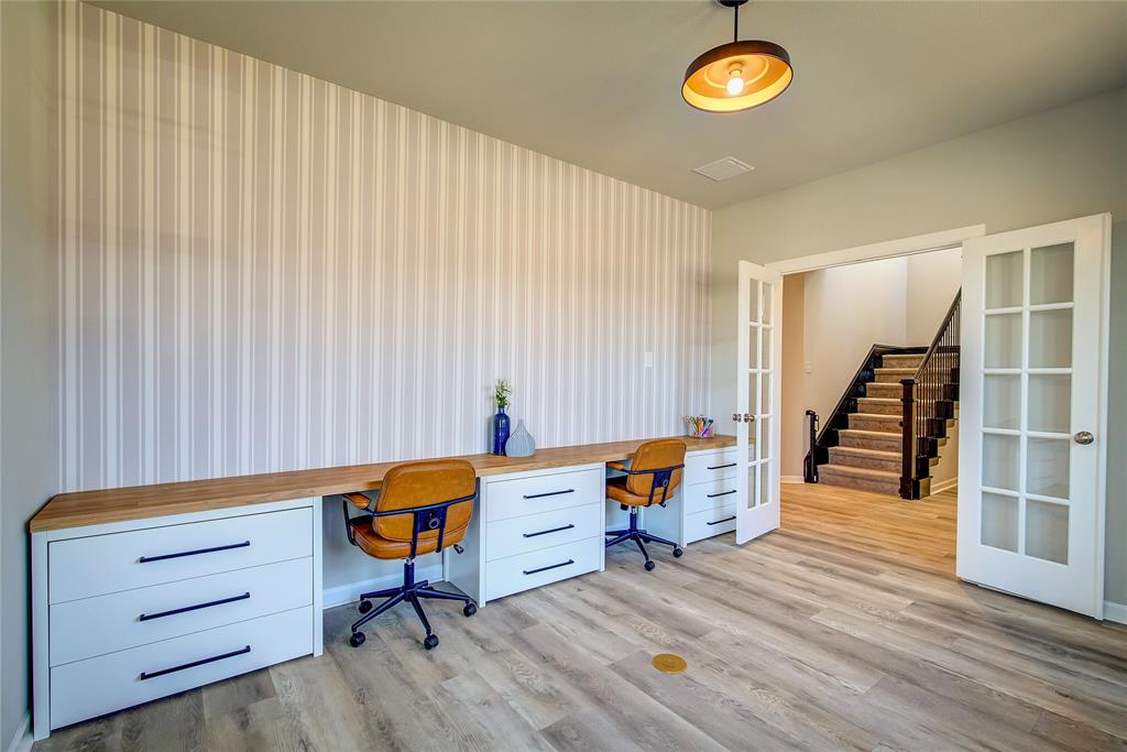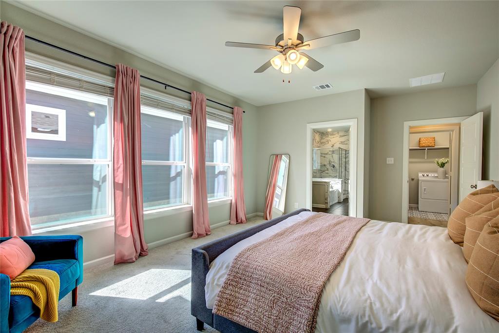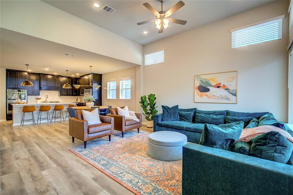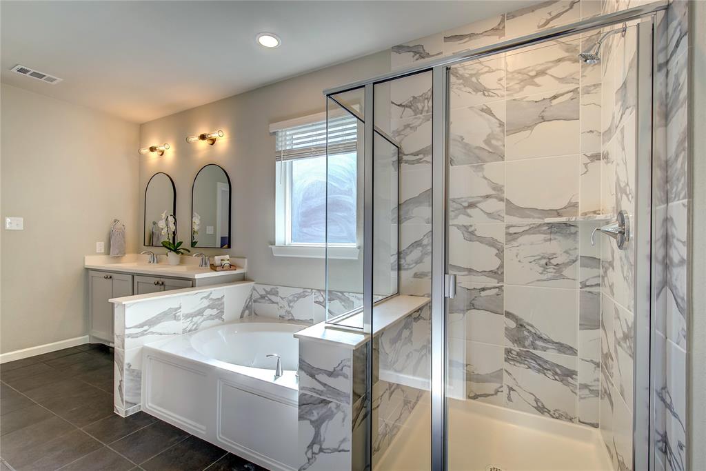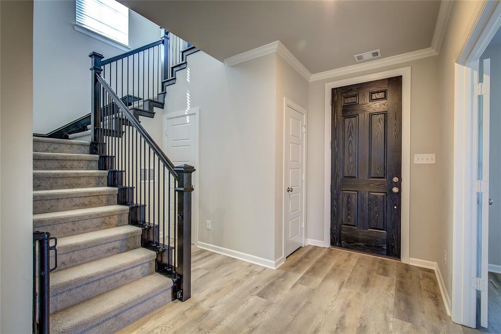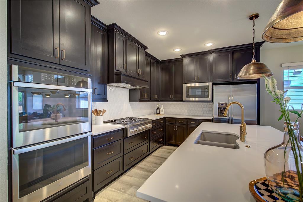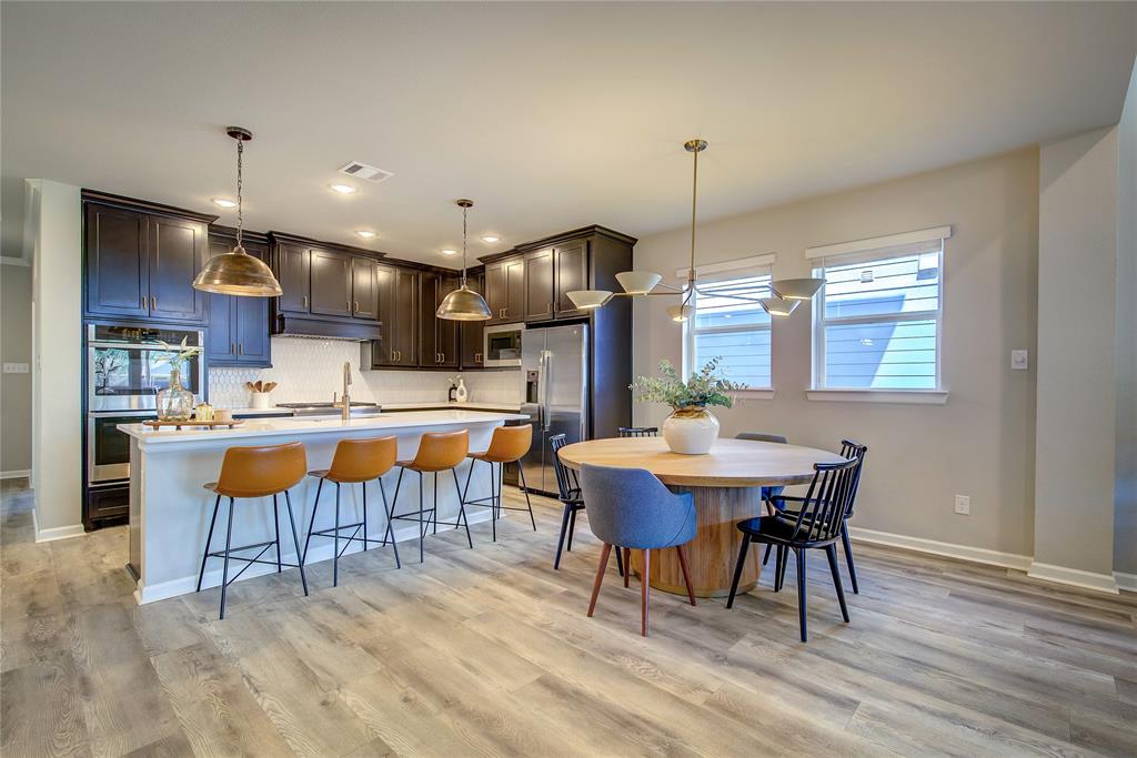 The kitchen is the heart of the home, featuring a large center island, double ovens, a gas cooktop, and an eat-in dining area. A unique feature you’ll love are the two refrigerated drawers conveniently located next to the sink, ideal for beverages, fresh produce, or snacks. The open-concept design flows seamlessly into the spacious living and dining areas, all enhanced with luxury vinyl plank flooring, and decorative lighting. The private primary suite is located on the first floor and boasts a spa-inspired garden tub, dual sinks, a separate shower, and a generous walk-in closet. Upstairs, you’ll find three additional bedrooms each with walk-in closets plus a full bath. Enjoy outdoor living year-round with both front and rear covered porches overlooking a landscaped yard with a sprinkler system. The rear-entry garage provides alley access and enhances front curb appeal. Homestead at Liberty Grove offers wonderful community amenities including a pool, jogging and bike paths, and a fishing pond. Located within Garland ISD with choice of schools. This home truly combines modern comfort with timeless style and is ready for you to move in and make it your own!