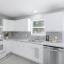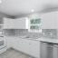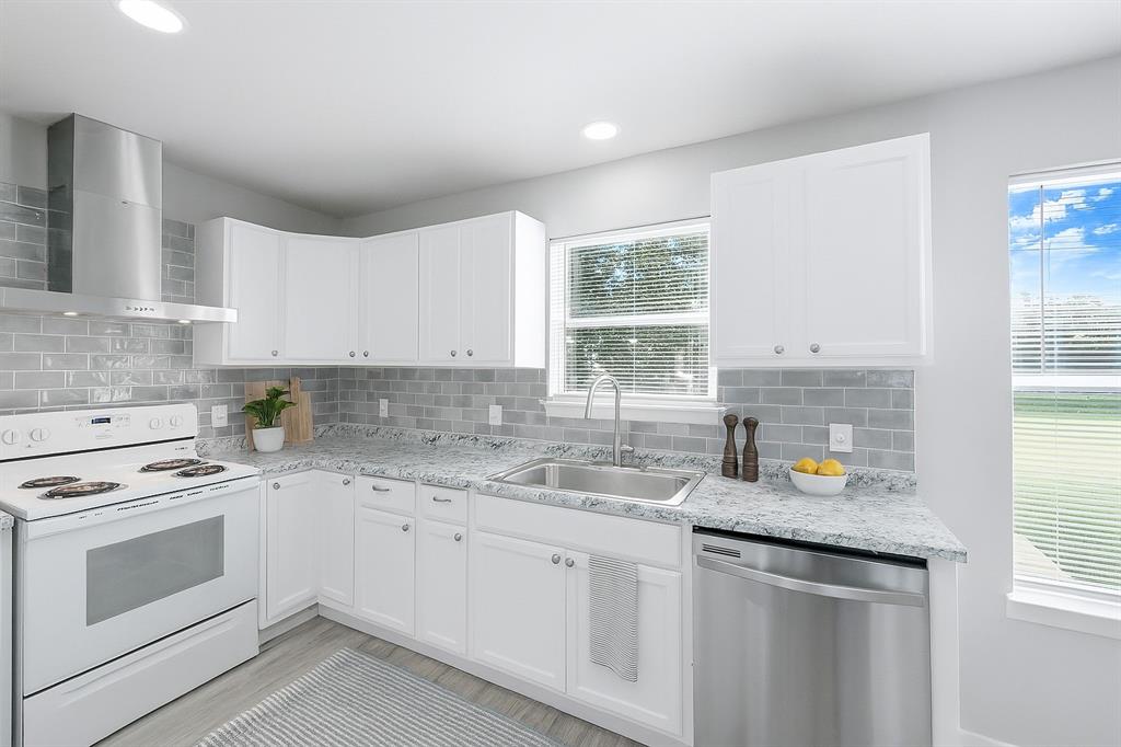-Brand-new kitchen with white shaker cabinets, subway tile backsplash, and new countertops