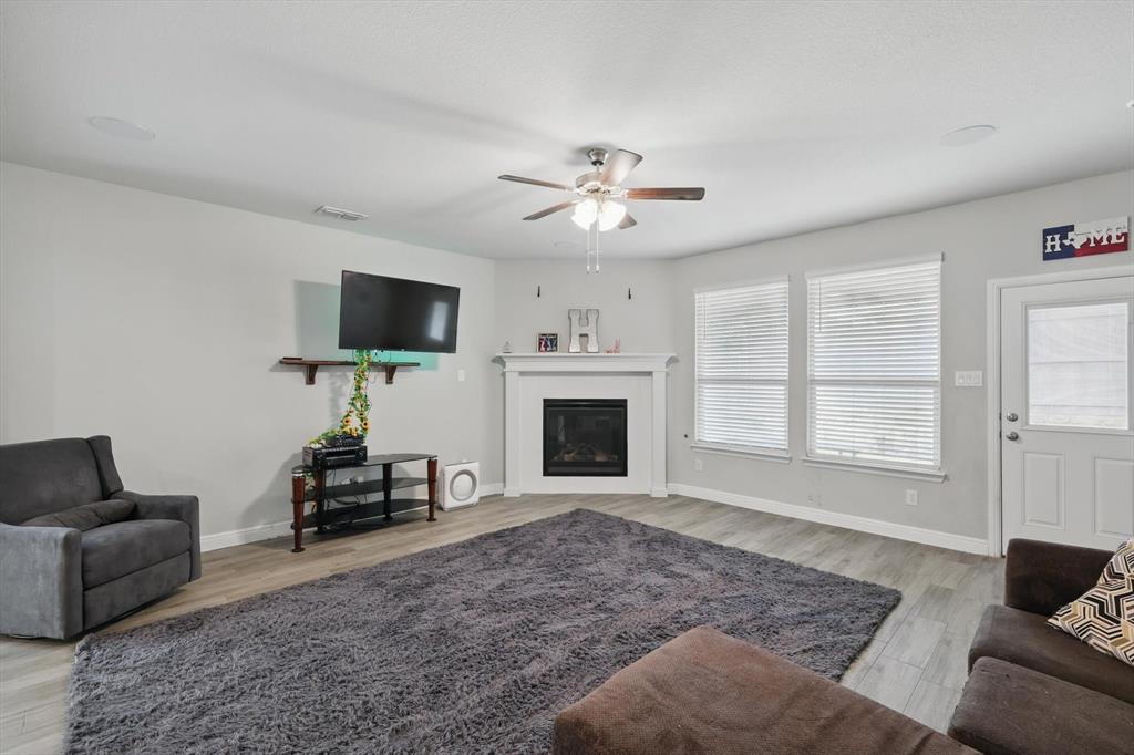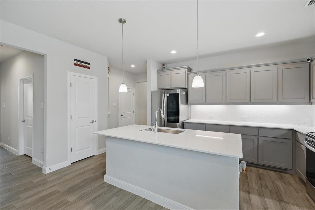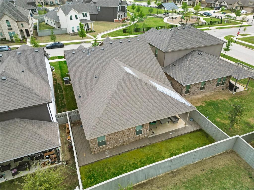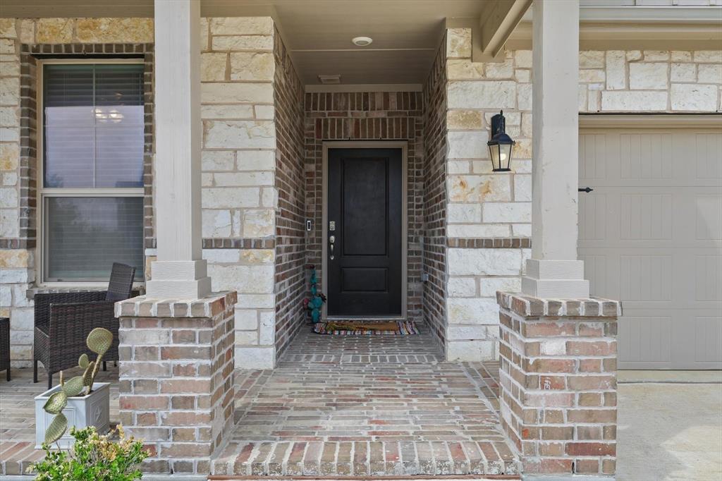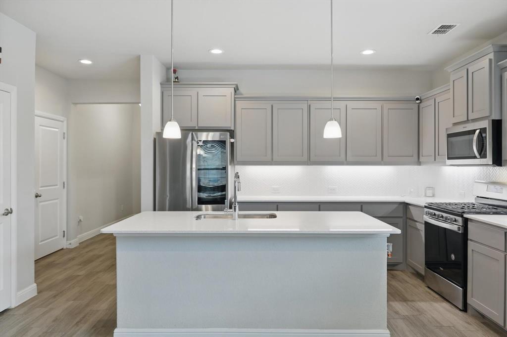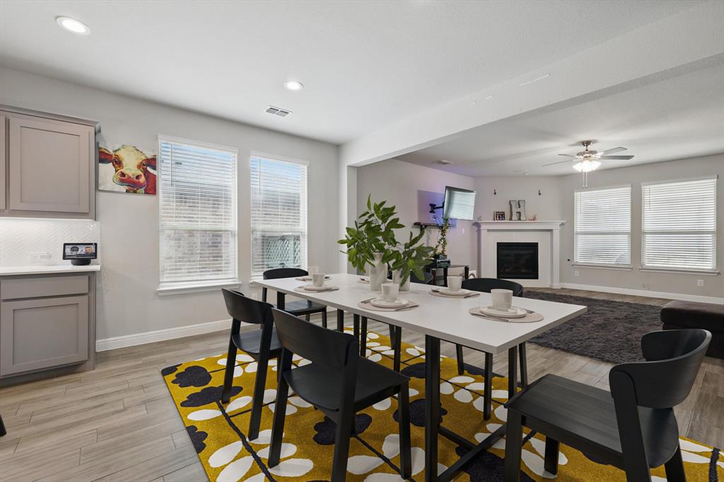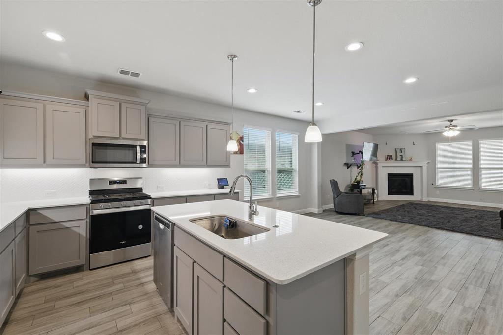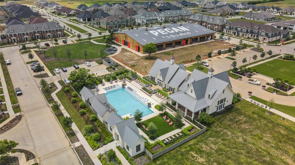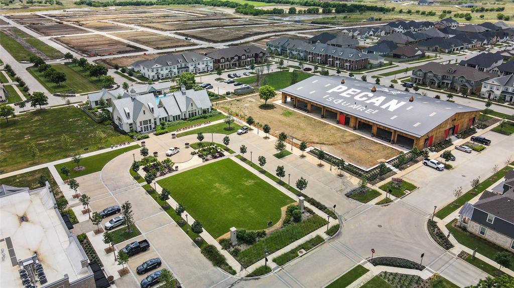 New roof installed in May 2025! 4 bedrooms and 3 full baths adorned with quartz countertops. Across the street from a darling pocket park with swings, a pavilion and green space for play in the highly regarded Community of the Year, Pecan Square! Relax on your charming South facing front porch. This airy and bright open concept floor plan is free from carpet with gorgeous wood-look tile throughout the entire home. Tankless hot water, gas log fireplace, front and back covered porches, ample closet and cabinet space, walk-in pantry and gas cooktop with exterior ventilation. Extended primary suite, huge walk-in closet and dual sinks, separate shower and tub in en-suite. The HOA dues include high-speed internet, and access to all of the resort-style amenities; 3 pools, dog parks, playgrounds, walking trails, pickleball courts, pizza oven, fire-pit, game-room, gym, and on-site elementary school, with a middle school on the way off of Mulkey! There are plenty of neighbor-run niche groups to help get you plugged in and settled if that is your vibe! Tom Thumb coming Spring of 2026, and nearby shops, restaurants and food trucks will have you feeling right at home. Catch the sunset from Elm Tower or Horizon Ln. You will LOVE living here!!