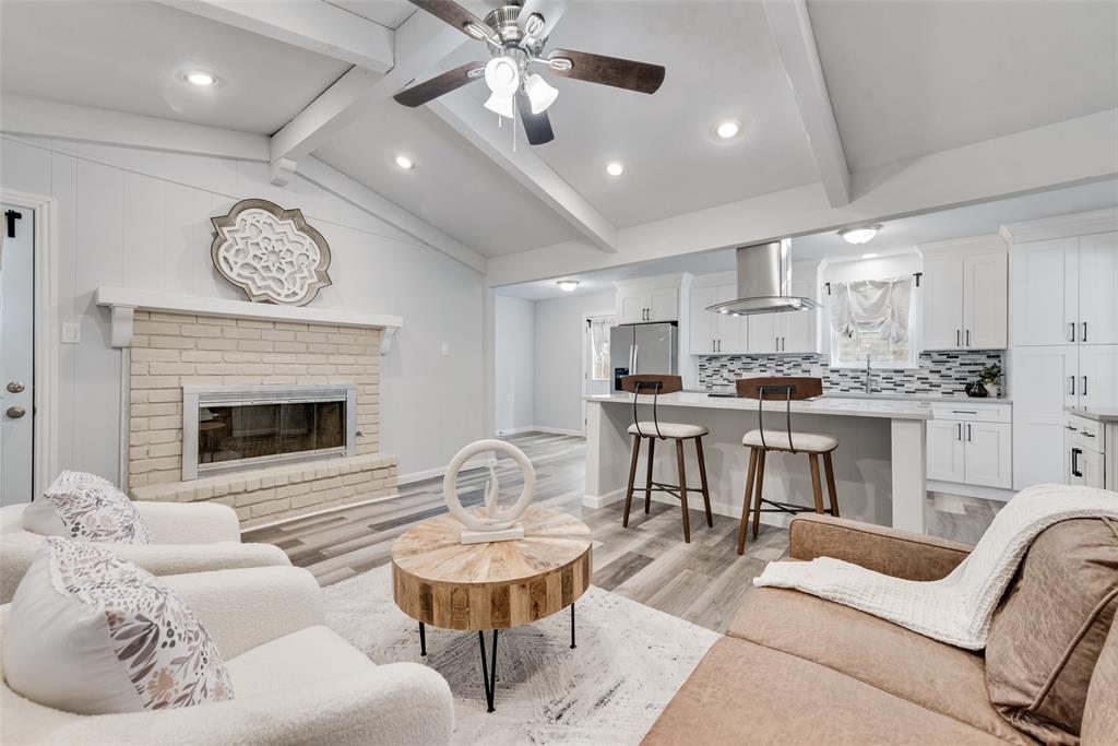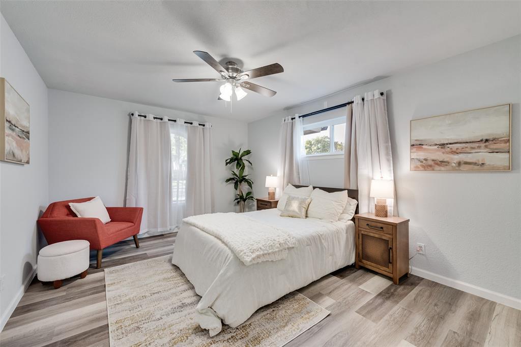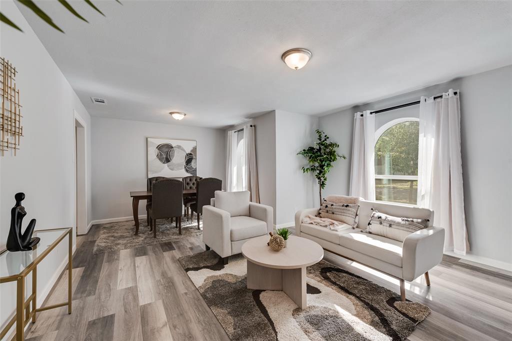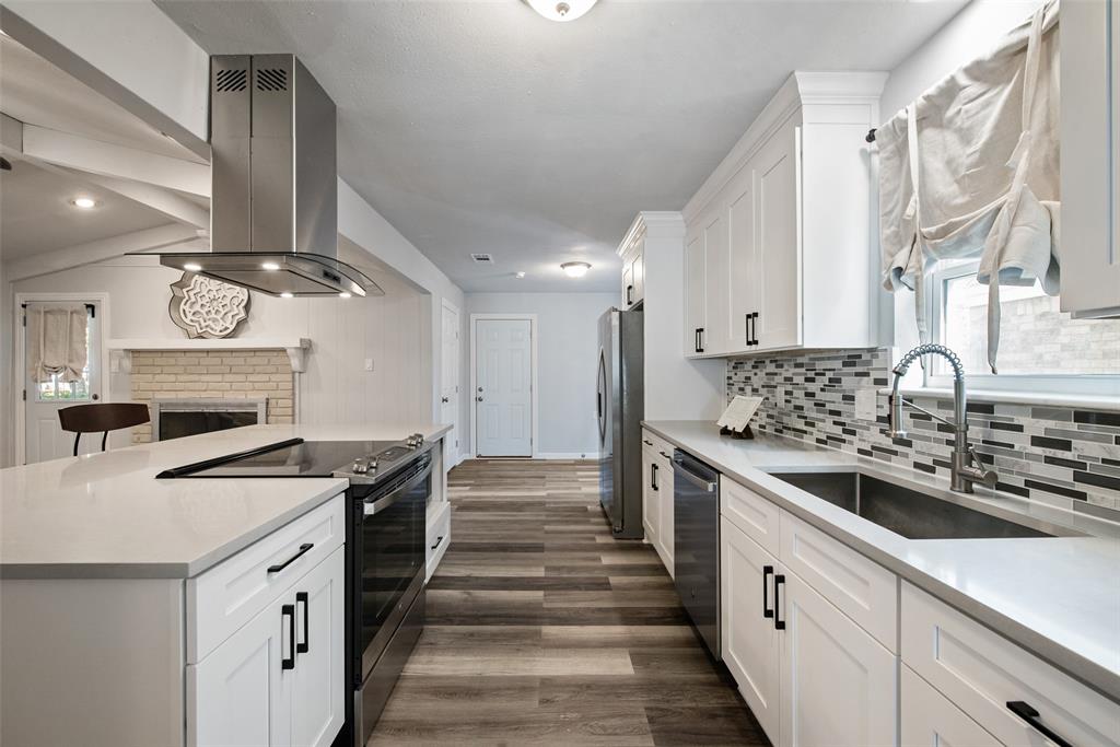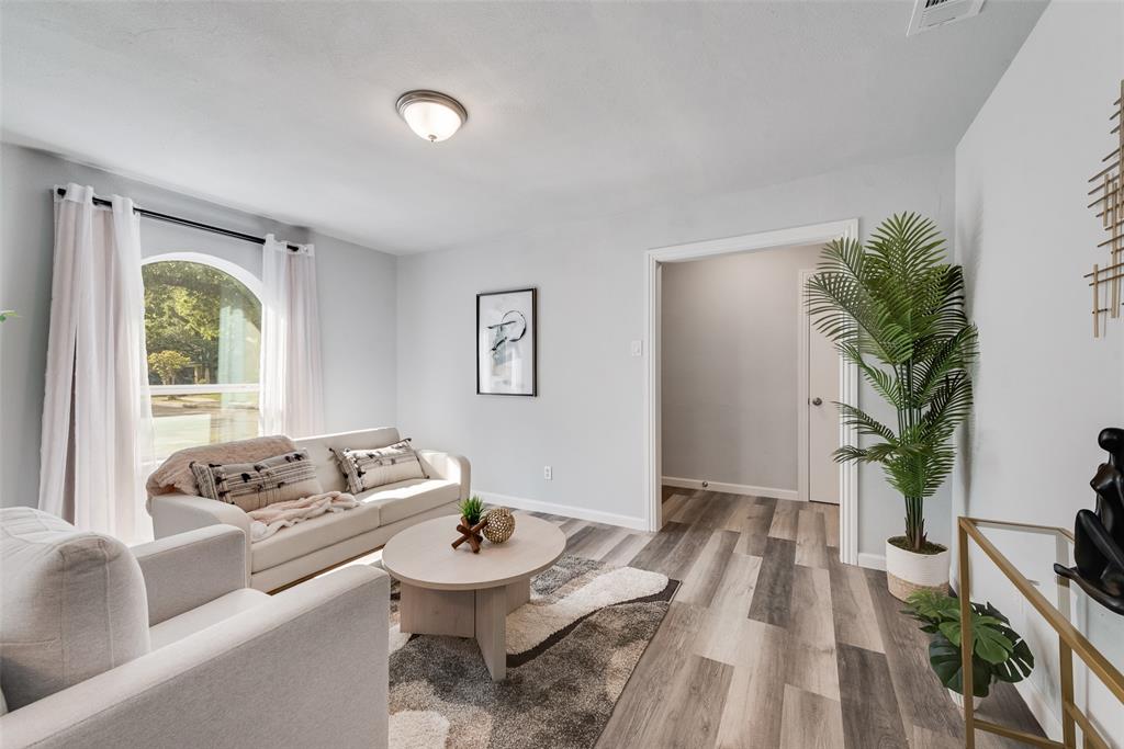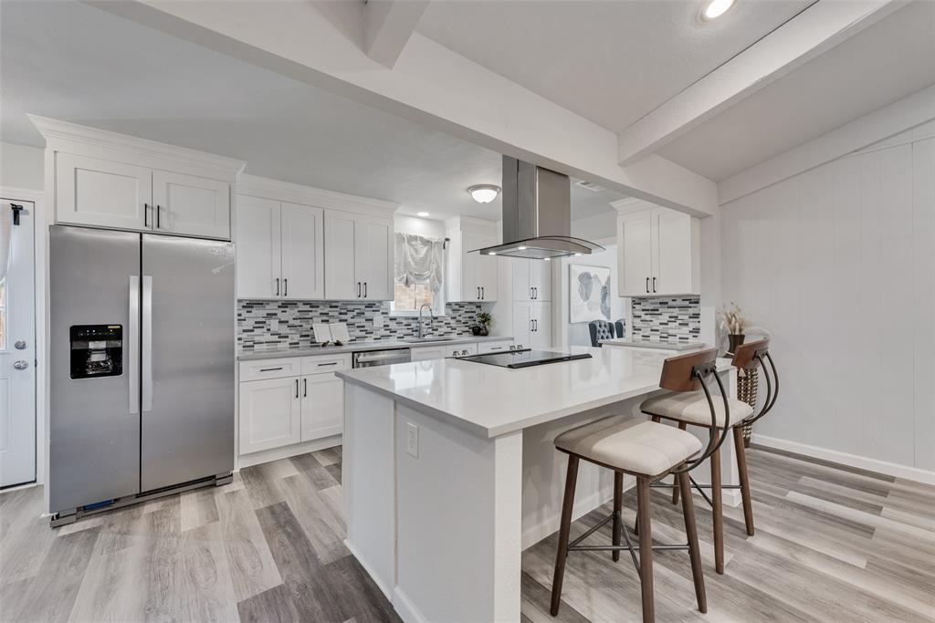 Charming and beautiful one-story home nestled in a quiet neighborhood. Features an open floor plan with stunning, lush vinyl plank wood flooring throughout all living areas, bedrooms, and the hallway, all windows and doors have been replaced. Spacious open kitchen featuring bright Quartz stone countertops and a backsplash that highlights a beautiful contrast. Includes stainless steel appliances and a large island with a cooktop and vent, seamlessly opening to the living room. Spacious living and dining area featuring a cozy brick fireplace, ceiling fans seamlessly opening to a covered, screened patio—perfect for evening relaxation. Spacious and private backyard with additional parking for an RV or boat. Unique opportunity to own one of the big lot homes at center of Irving, close to DFW airport, major highways and markets. Don’t miss out on this immaculate house!