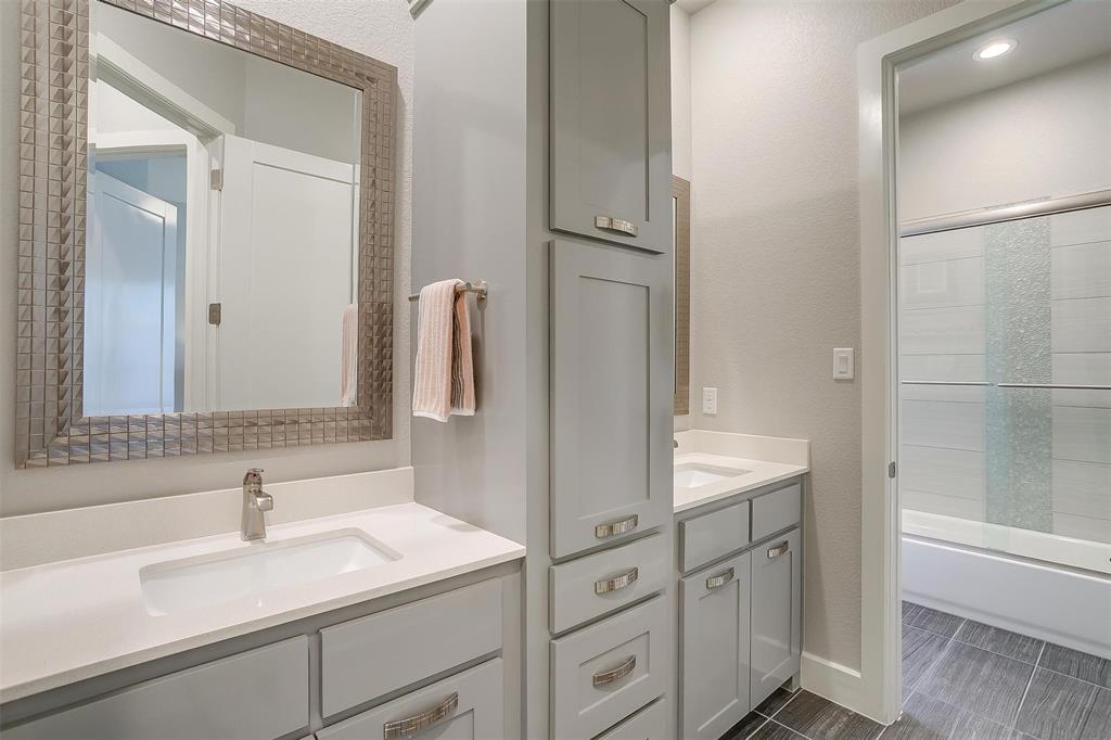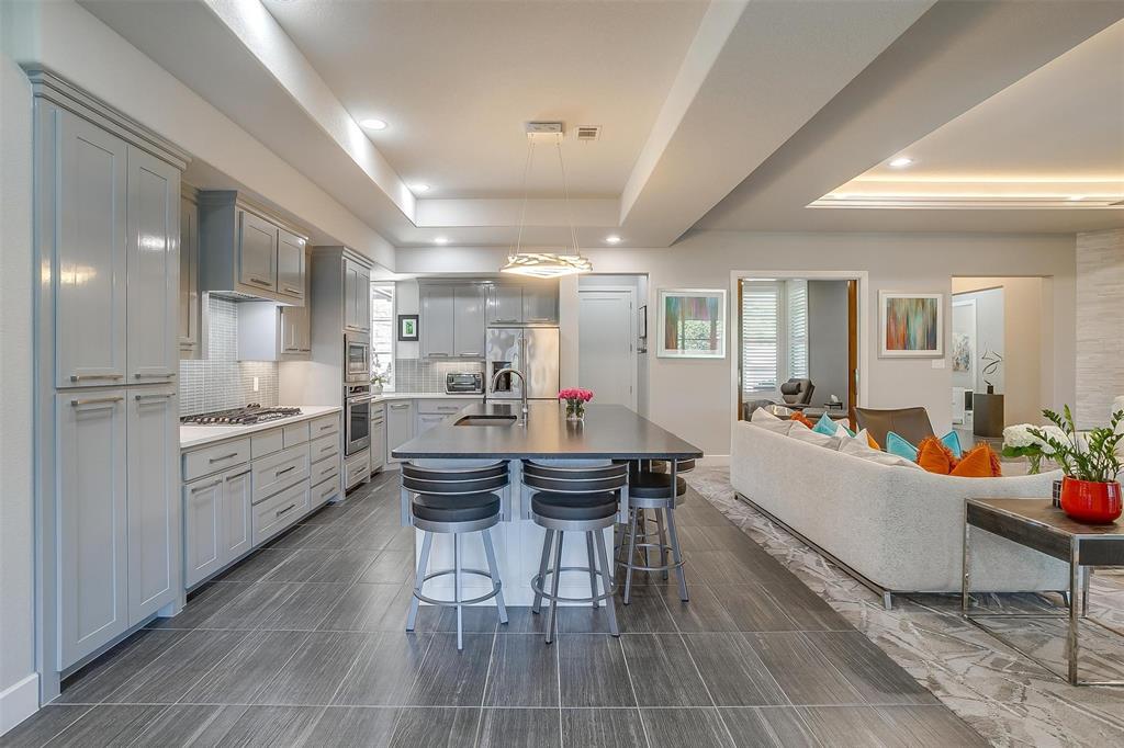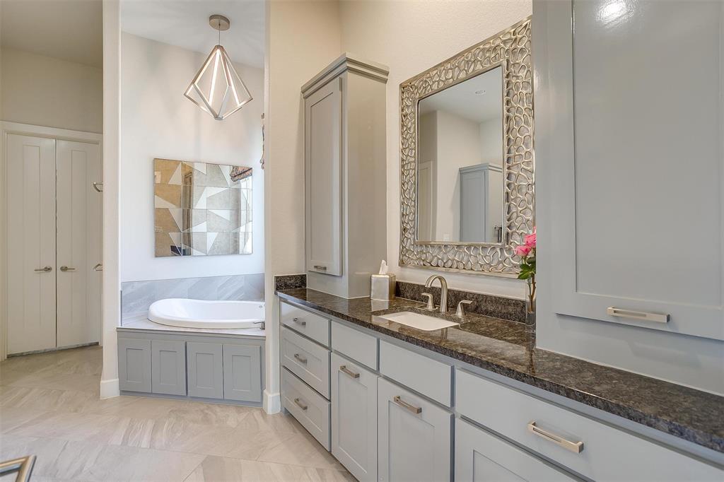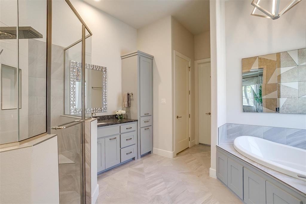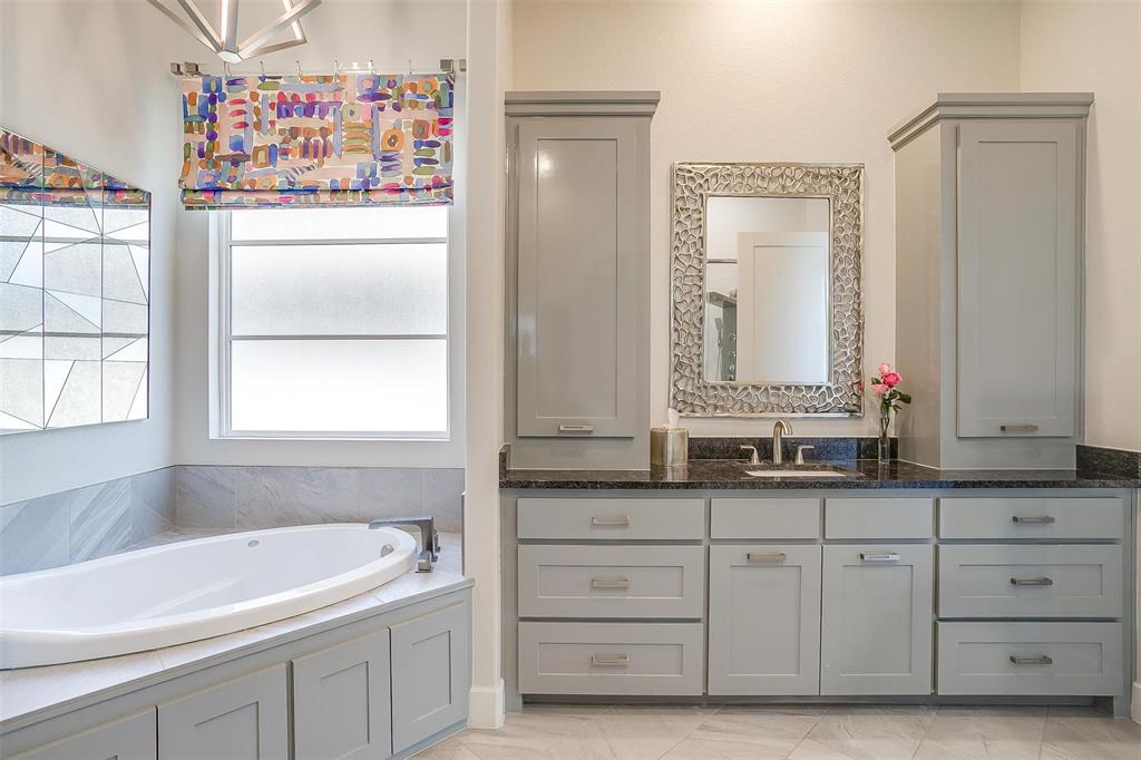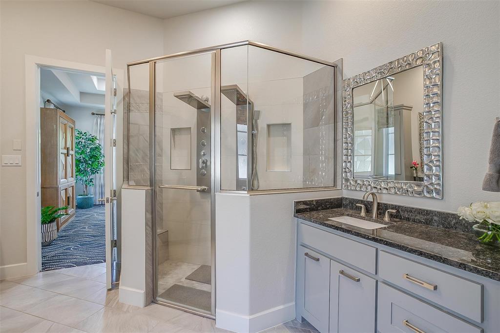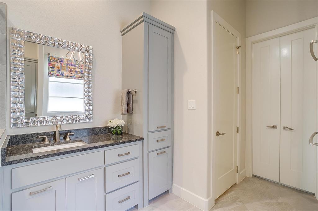 Nearby, a well-appointed study is the perfect place to handle remote work or settle in with a great book. The primary suite is beautifully appointed with a dramatic tray ceiling and a custom closet with built-in cabinetry that is smartly set up to organize a dream wardrobe. The spa bath includes double vanities, toilet closet, garden tub and a glass shower featuring double showerheads. The stunning design continues throughout two additional bedrooms with large closets and a third bedroom that can serve as a game room with extra storage, thanks to a walk-in closet. Two full bathrooms, one of which can be reimagined as a patio-pool bath, plus a convenient half-bath are crafted with the same high-end cabinetry and designer fixtures.