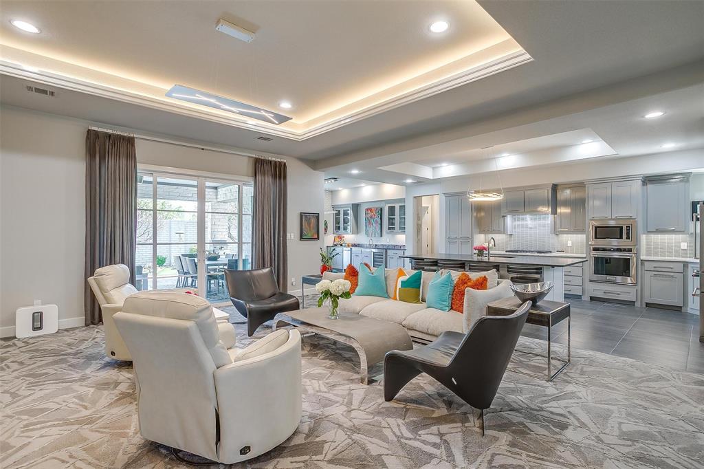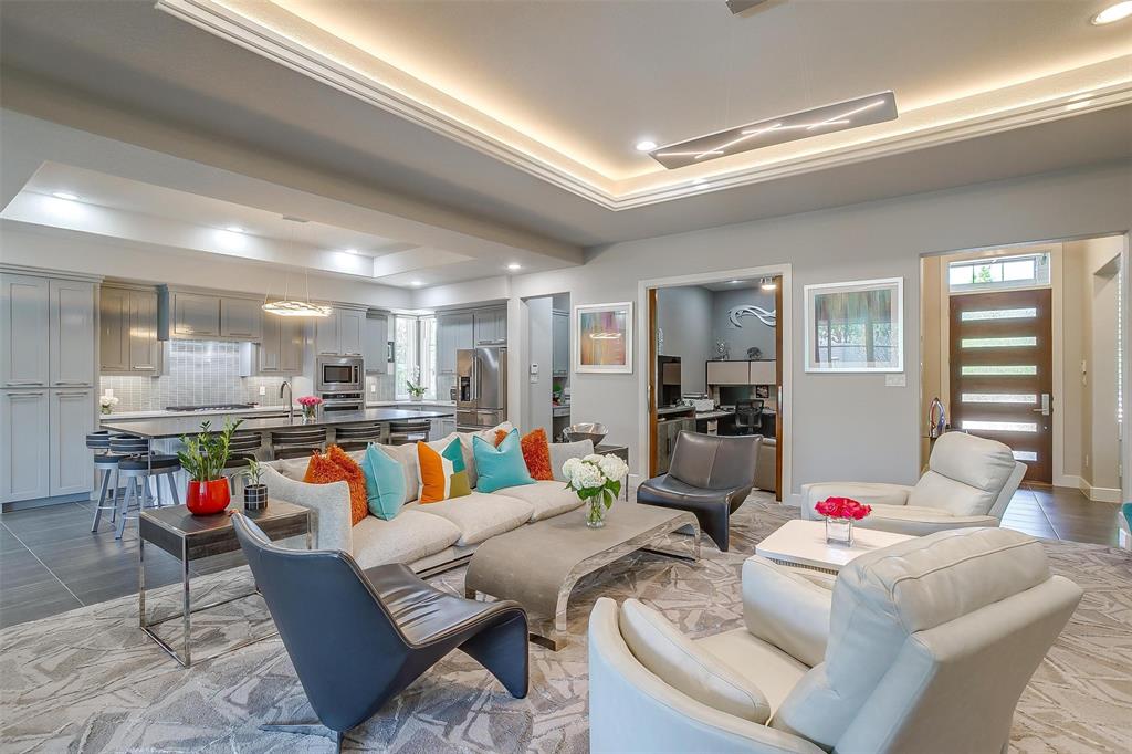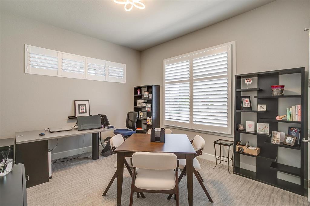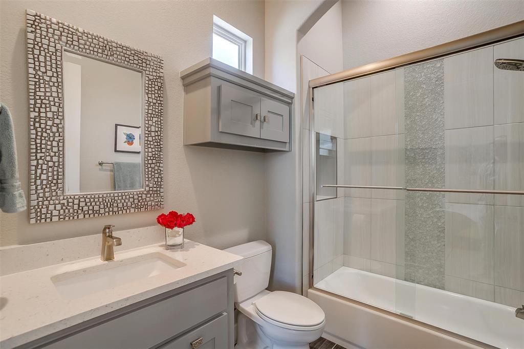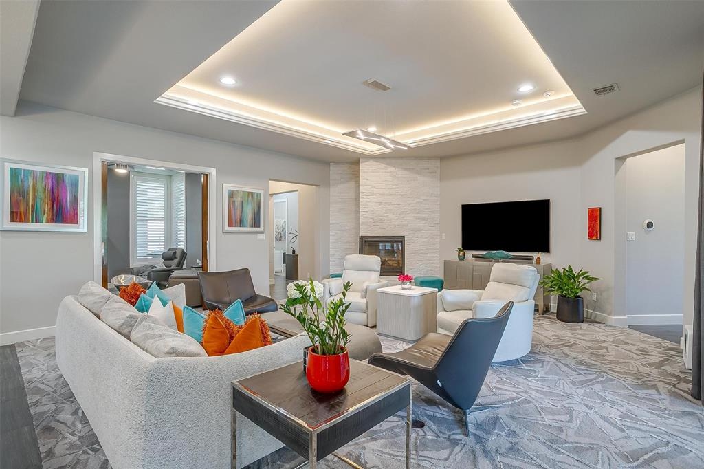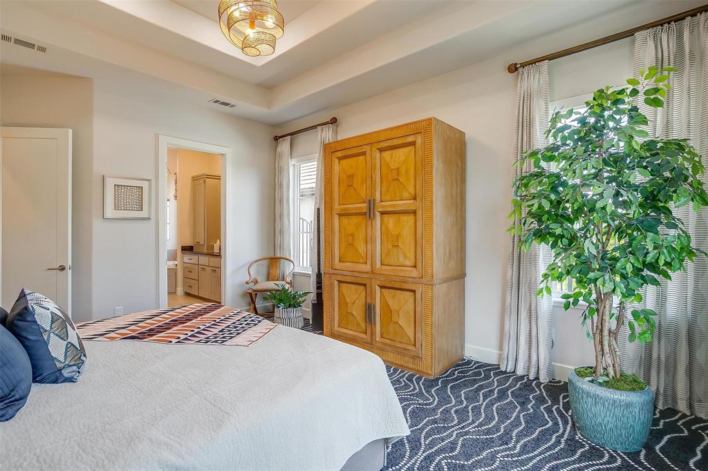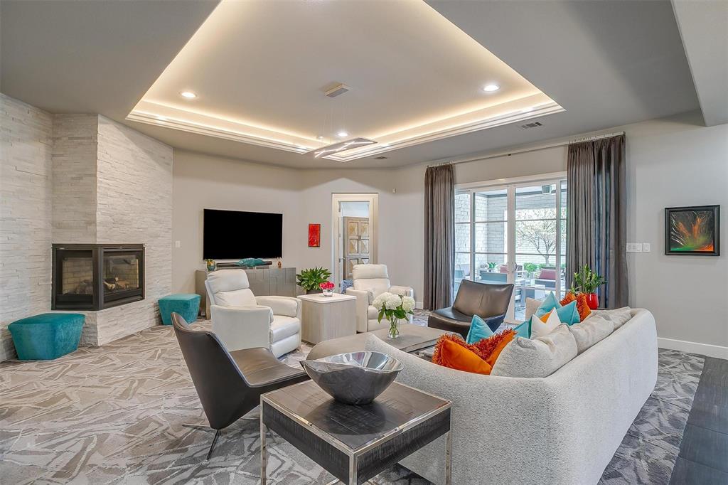 Nearby, a well-appointed study is the perfect place to handle remote work or settle in with a great book. The primary suite is beautifully appointed with a dramatic tray ceiling and a custom closet with built-in cabinetry that is smartly set up to organize a dream wardrobe. The spa bath includes double vanities, toilet closet, garden tub and a glass shower featuring double showerheads. The stunning design continues throughout two additional bedrooms with large closets and a third bedroom that can serve as a game room with extra storage, thanks to a walk-in closet. Two full bathrooms, one of which can be reimagined as a patio-pool bath, plus a convenient half-bath are crafted with the same high-end cabinetry and designer fixtures.