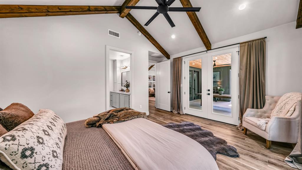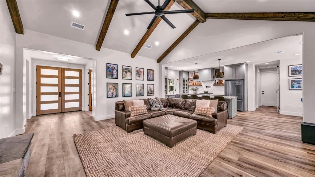 As you step inside, you're welcomed by an open-concept living area highlighted by elegant wood beams, creating a warm and inviting atmosphere. The home showcases 8-foot doors throughout, enhancing the sense of space and sophistication. Each bedroom is equipped with a generous walk-in closet, ensuring plenty of storage.