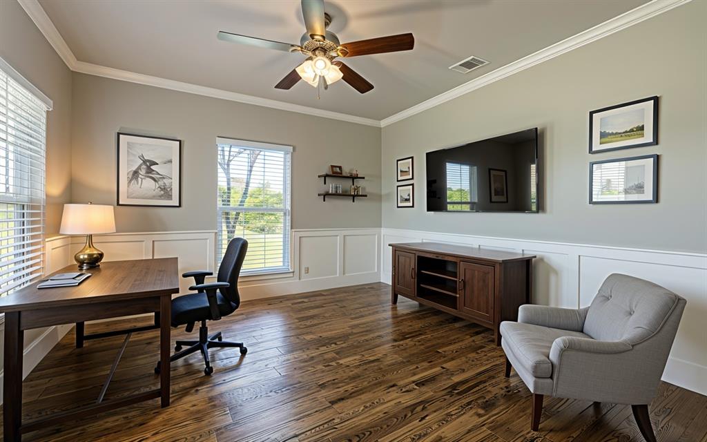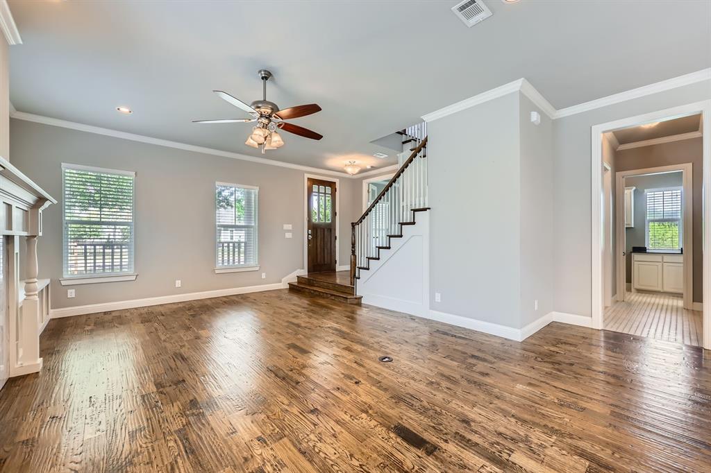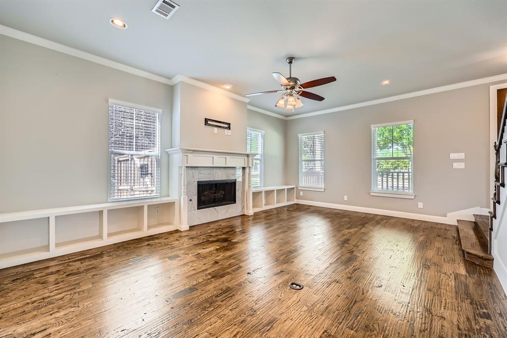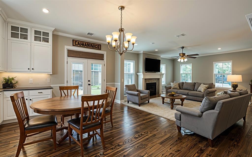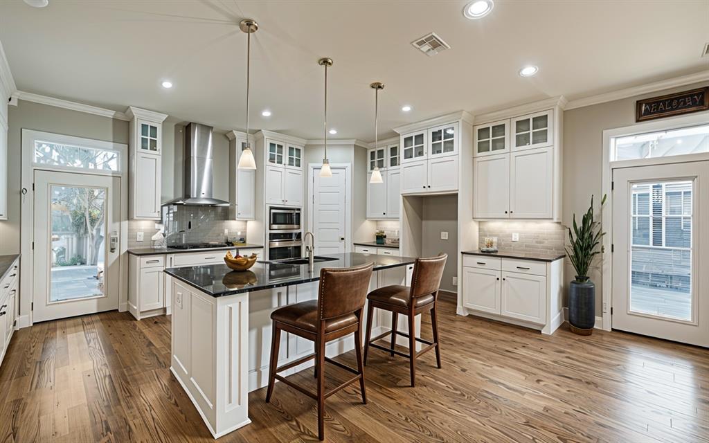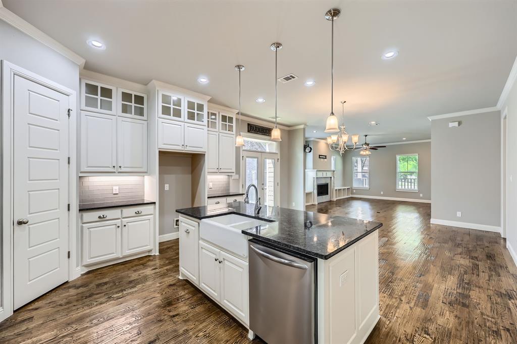 Step onto the welcoming front porch and into a thoughtfully crafted interior featuring hand-scraped wood floors, sunken living spaces, and an open-concept layout that effortlessly connects the living room (with a cozy fireplace), breakfast nook, and kitchen. The kitchen boasts granite countertops, a large island, a farmhouse sink, and abundant storage — perfect for everyday meals and entertaining. Additionally, there is a room with built-in bookcases — the perfect space for a private library, home office, or creative retreat.