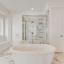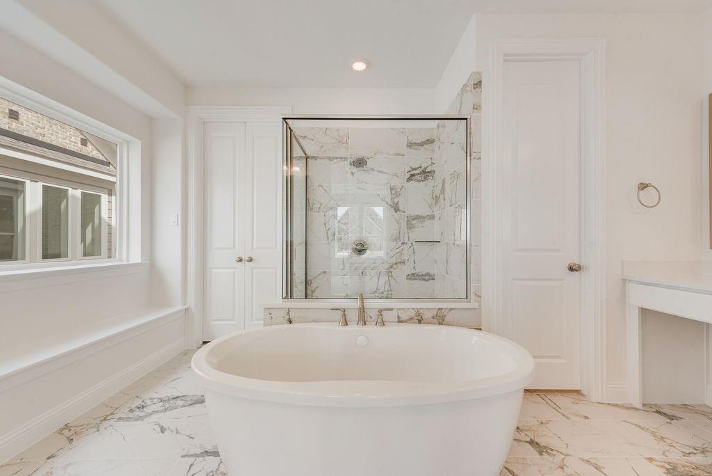 A private downstairs guest suite offers flexibility as a home office or multi-generational living space. Elegant design touches are found throughout, including a grand full oak staircase with wrought iron spindles, rocker switches, and thick door casings and trim. The generous primary suite is a serene escape, featuring a freestanding garden tub, dual rectangular vanities, and a glass-enclosed, tiled shower.