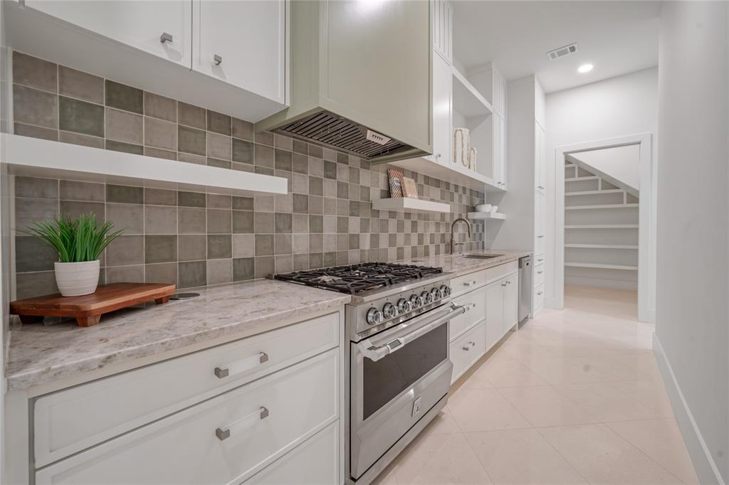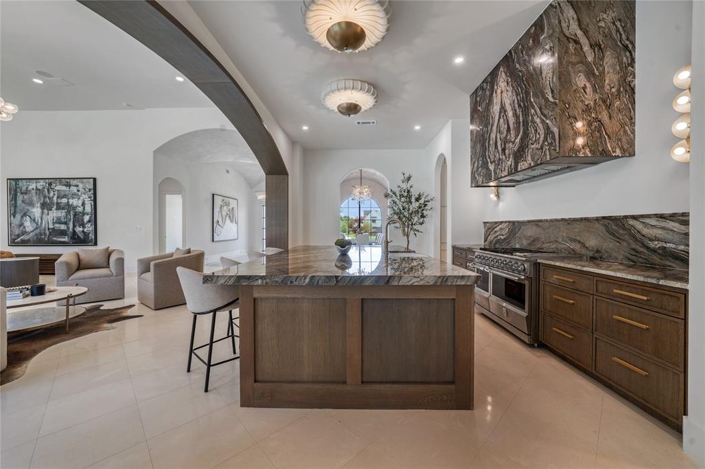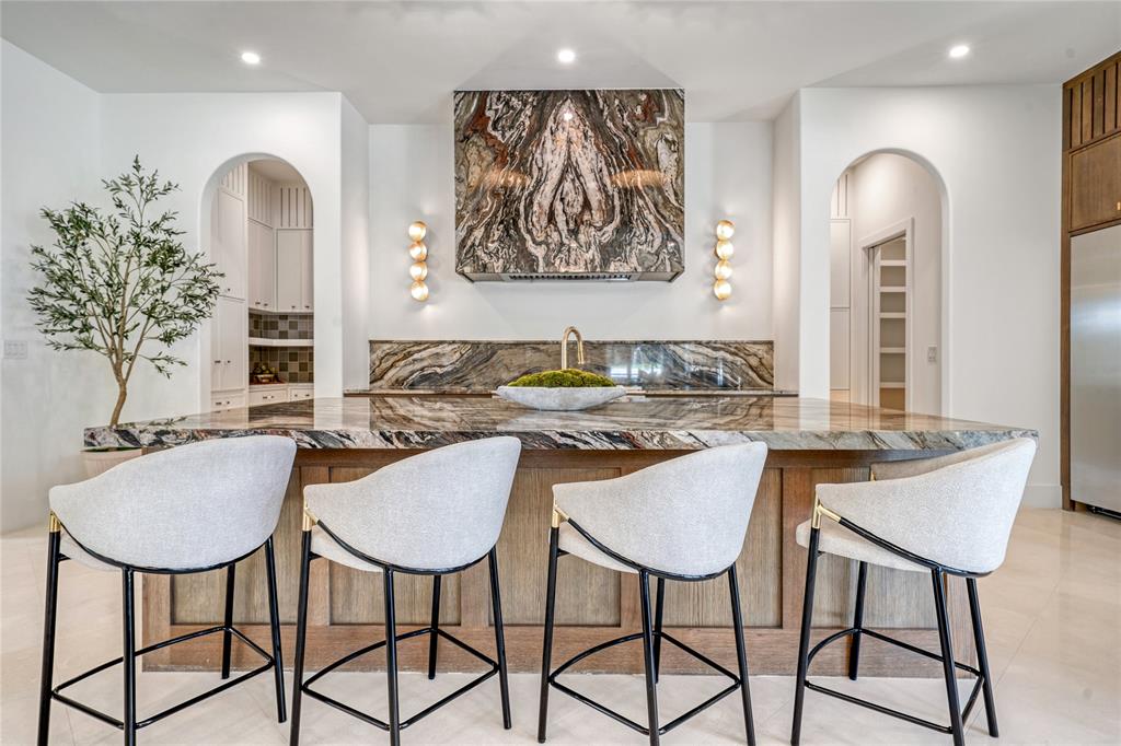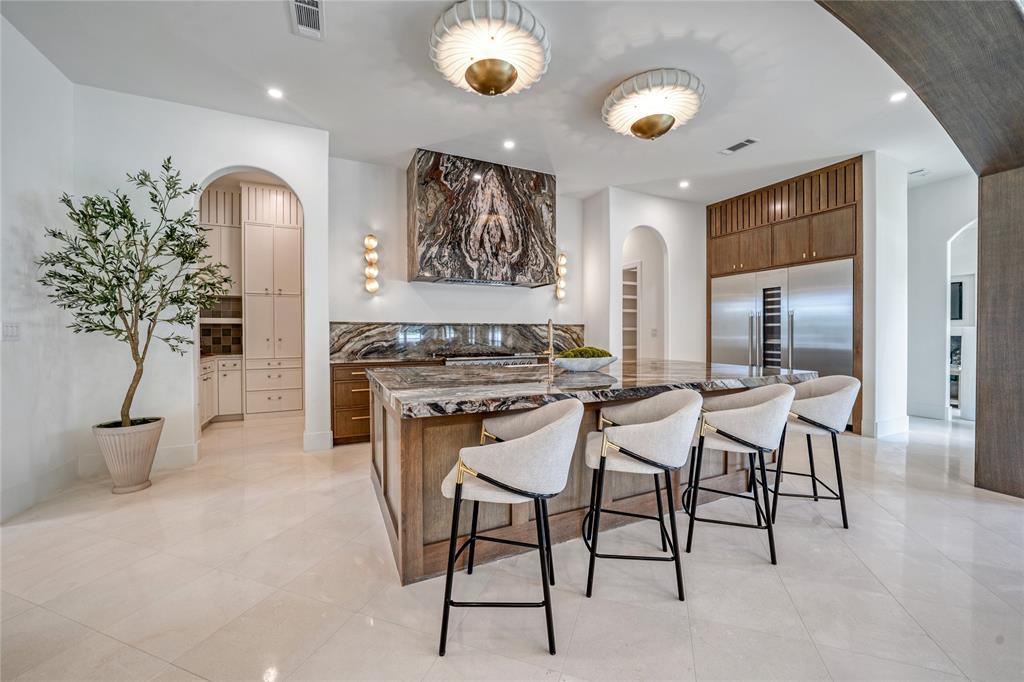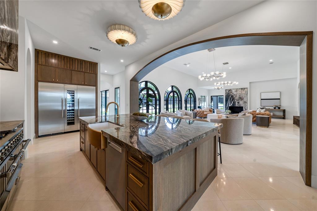 custom-engineered stone vent hood, and an expansive island. A full secondary kitchen and a