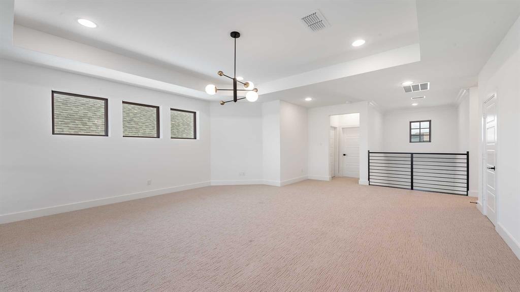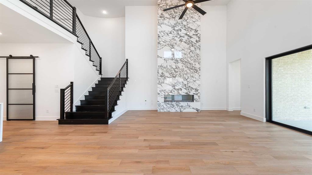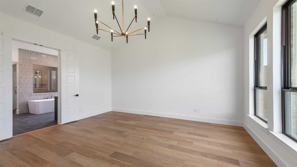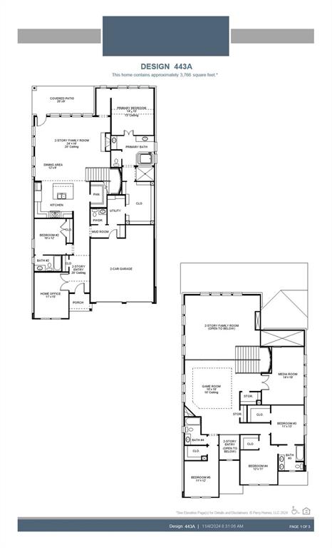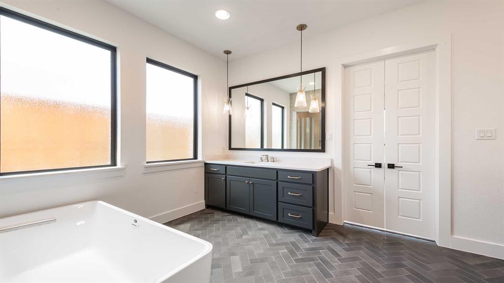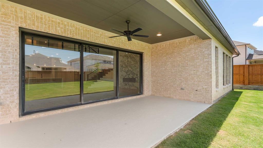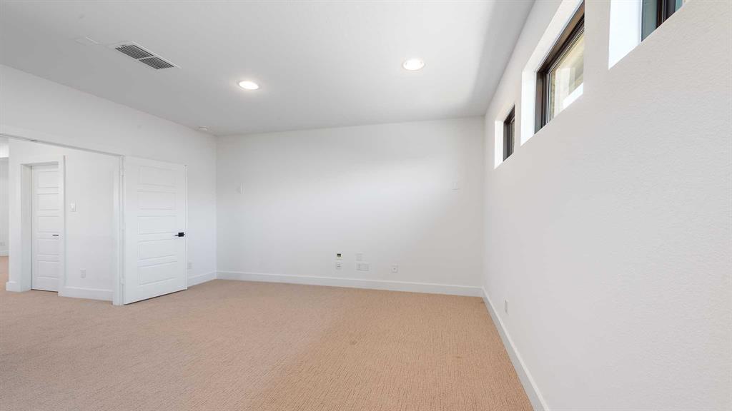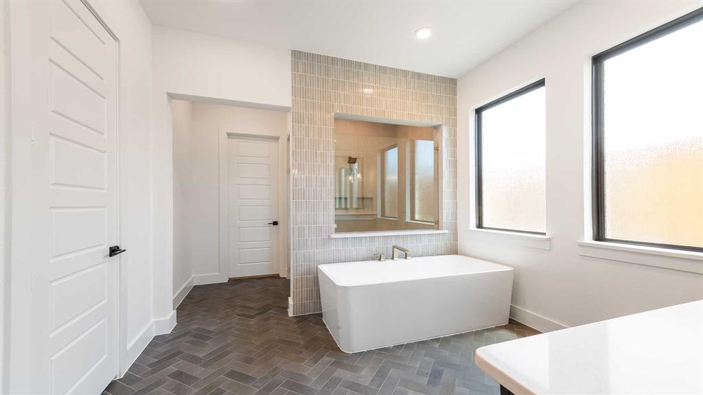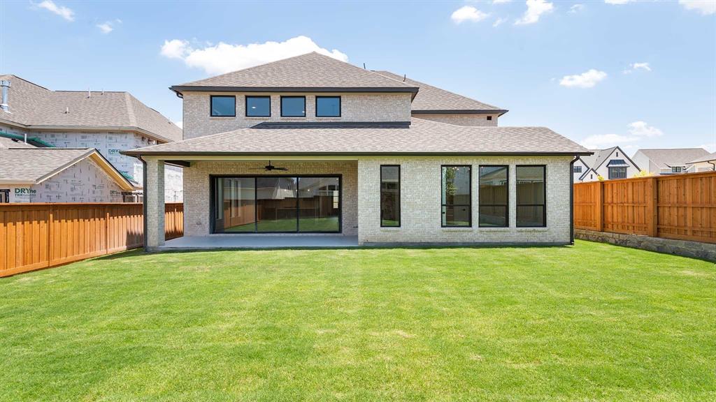 The front porch opens into a two-story entryway. French doors enclose the home office for extra privacy. A secondary bedroom with closet space and a full bathroom is off the main hallway. As you walk into the kitchen you pass the oversized walk-in pantry and the island with built-in seating. The dining area connects to the two-story family room by a sliding glass door. The family room features a fireplace and access to the covered backyard patio. The primary bedroom boasts a wall of windows. French doors open into the primary bathroom which hosts dual vanities, a freestanding tub, glass enclosed shower, oversized walk-in closet, and dual access to the utility room. Upstairs you are greeted by a large game room that has ample storage options. French doors enclose the media room which boasts a wall of windows. Secondary bedrooms and a Hollywood bathroom complete the second level. The utility room, mud room, and powder room are located off the two-car garage.