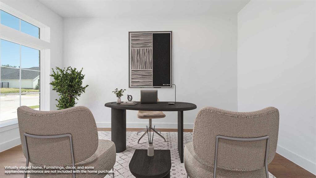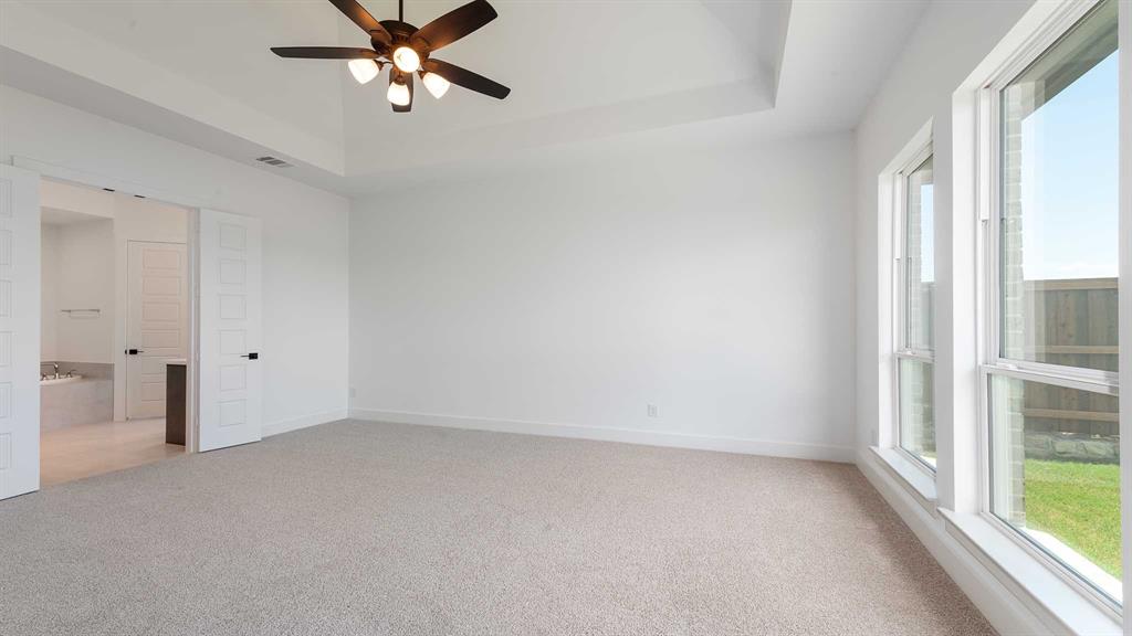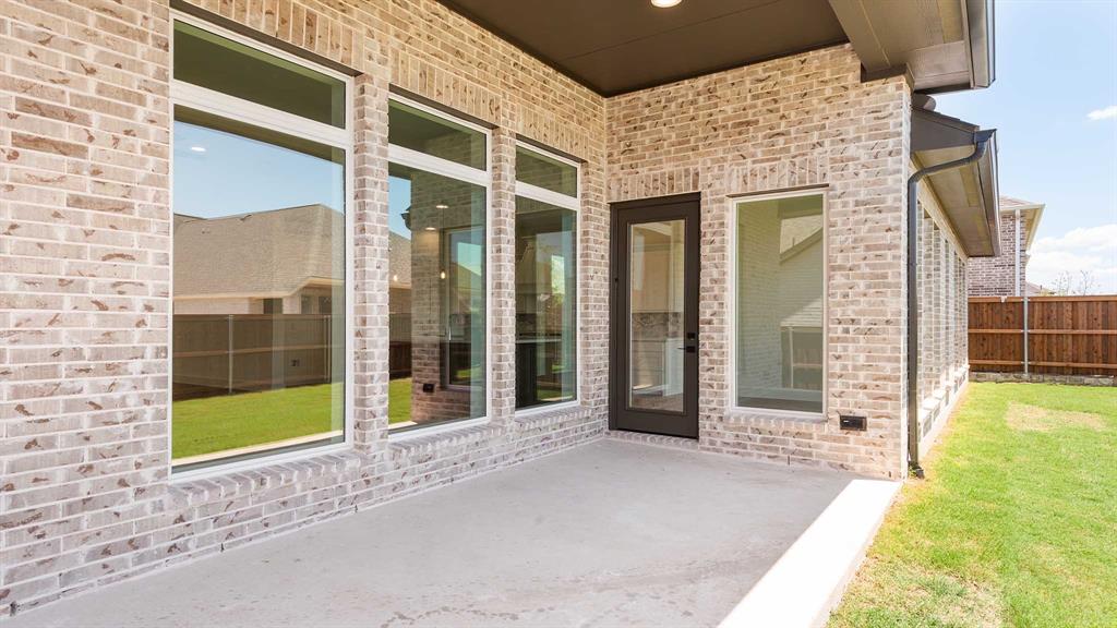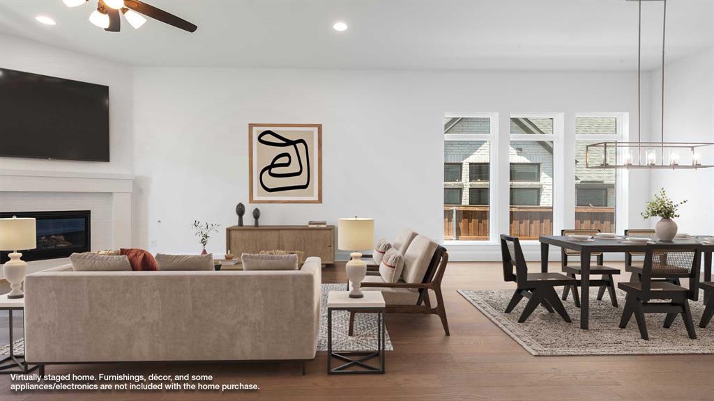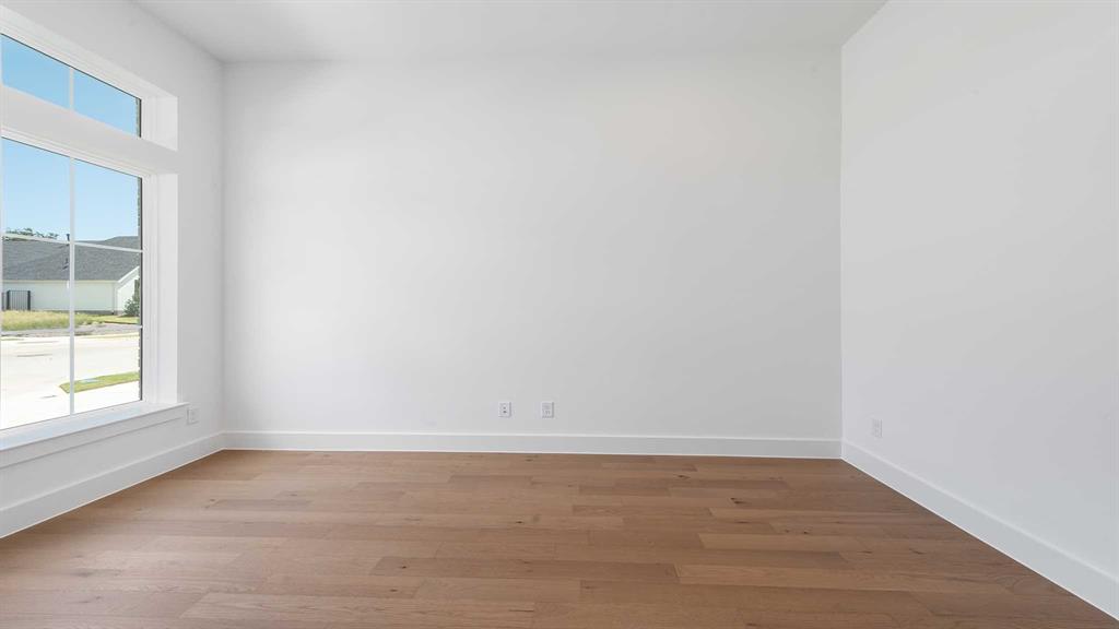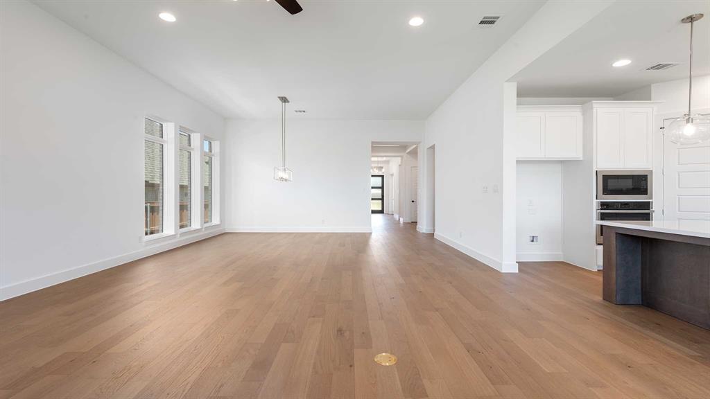 Home office with French doors set entry. Hardwood floors throughout living areas. Media room with French doors off extended entry. Formal dining room flows into open family room with a wood mantel fireplace and wall of windows. Kitchen features corner walk-in pantry, 5-burner gas cooktop and generous island with built-in seating space. Adjoining morning area features wall of windows. Primary suite includes double-door entry to primary bath with dual vanities, garden tub, separate glass-shower and two walk-in closets. Guest suite offers private bath. High ceilings and abundant closet space add to this spacious four-bedroom design. Covered backyard patio. Mud room off three-car garage.