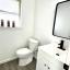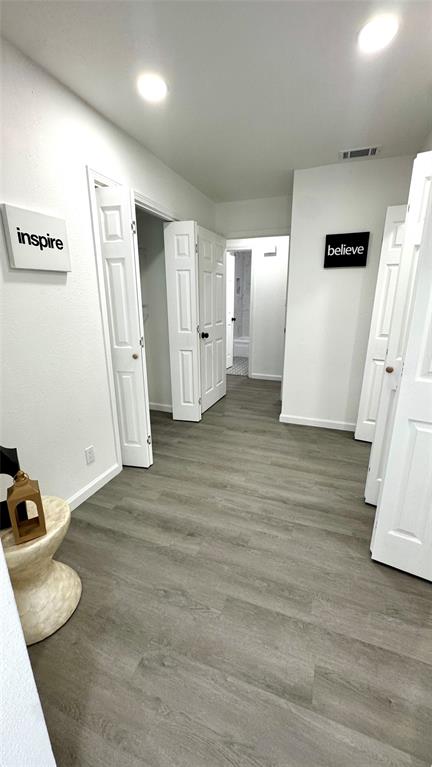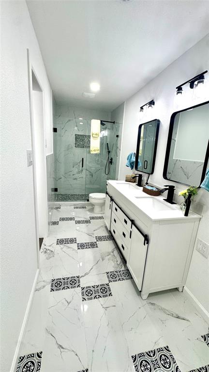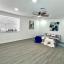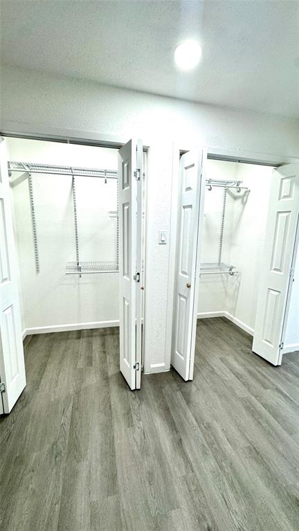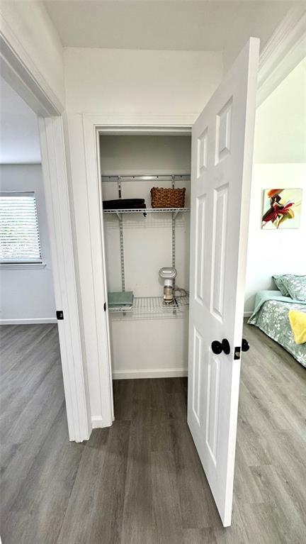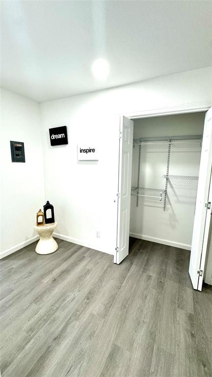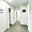 Modern master bedroom sanctuary with clean lines featuring sleek luxurious vinyl flooring and a spacious his and her closet with custom built in shelving. Stylish master bathroom with a focus on clean design, boasting a spacious walk in frameless glass shower and enclosure and a rainfall shower head.