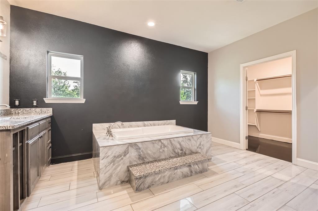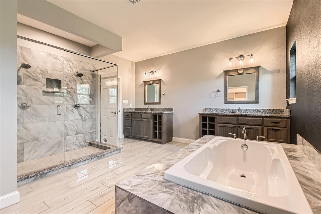 The primary suite is generously sized and designed for relaxation, featuring a luxurious ensuite bath with a large soaker tub, dual vanities, and an oversized walk-in shower that comfortably fits two—truly a must-see. A spacious walk-in closet completes the retreat-like atmosphere. On the opposite side of the home, you'll find three additional large bedrooms, a full bathroom, and a half bathroom strategically placed for privacy and convenience.