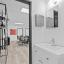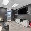 Fashioned for the CEO or owner or multiple coworkers, the most sizable office with a window is appropriately the corner office. One extra office boasts a window, and two extra offices ensure dedicated space for all employees. Two bathrooms are also outfitted with storage vanities and cabinetry.